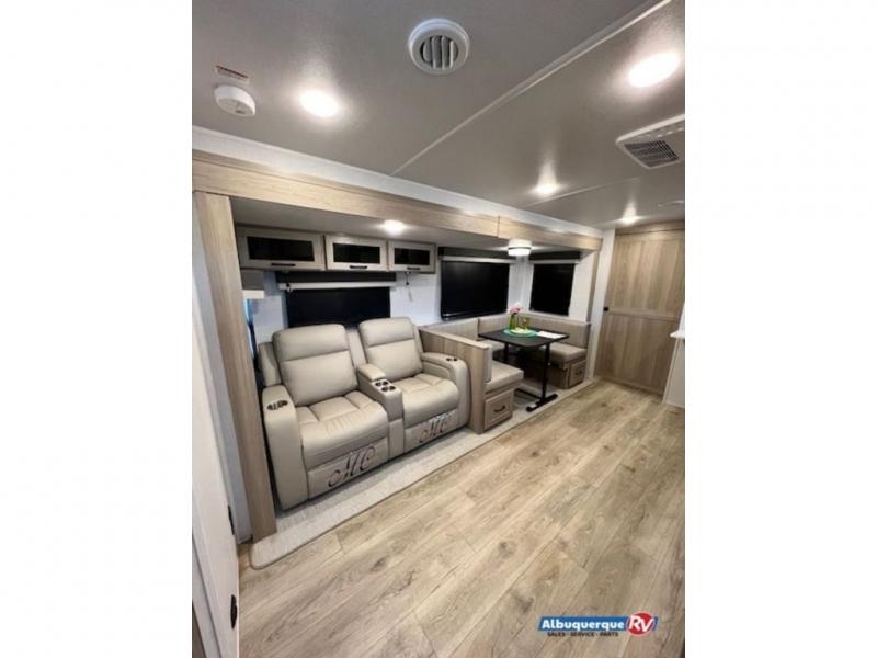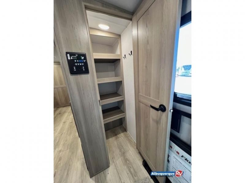 Get ready for a fun camping experience with your family and friends in this trailer that sleeps eight! From the rear double size bunks to the front bedroom's queen bed, and the furniture in the spacious main living area, everyone will find a place to lay their head at night. The cook will have full amenities inside and the choice to make meals on the outside kitchen when feeding everyone. There is abundant storage for your snacks and dry ingredients in the walk-in pantry, your cold items in the 12V refrigerator, and throughout the interior and along the exterior. You can load the larger gear in the front pass-thru storage with an optional steel sliding tray, and there is also an optional front door leading to the bedroom if you want even more convenience!