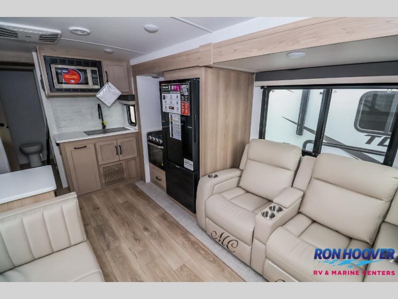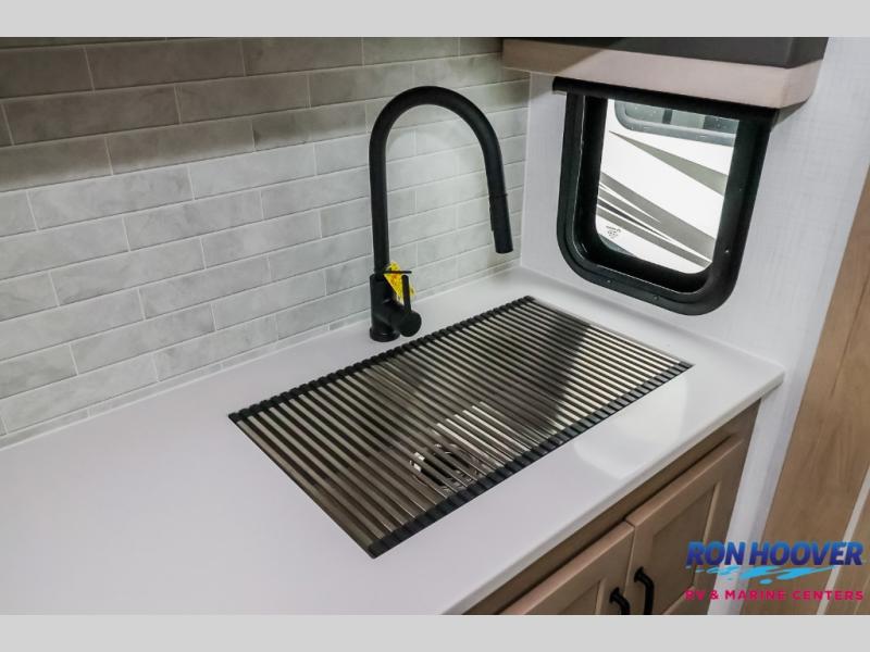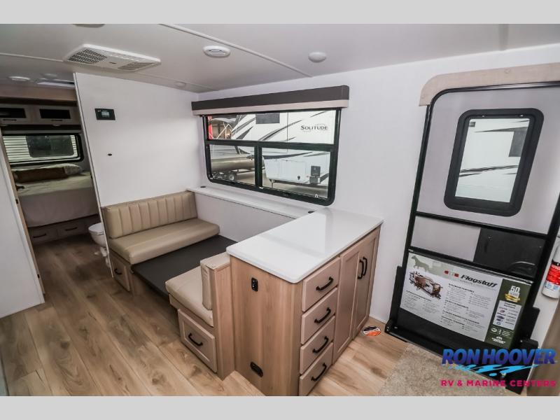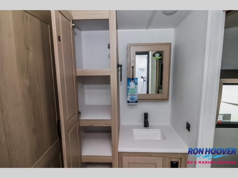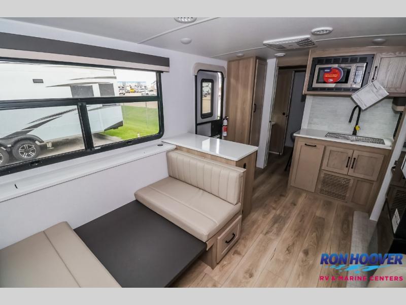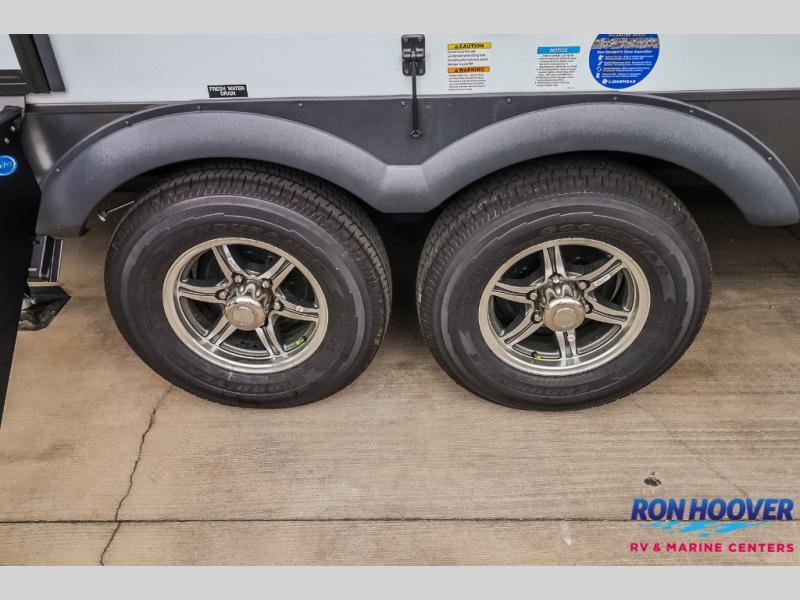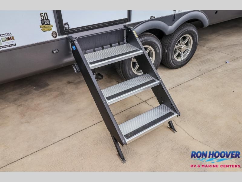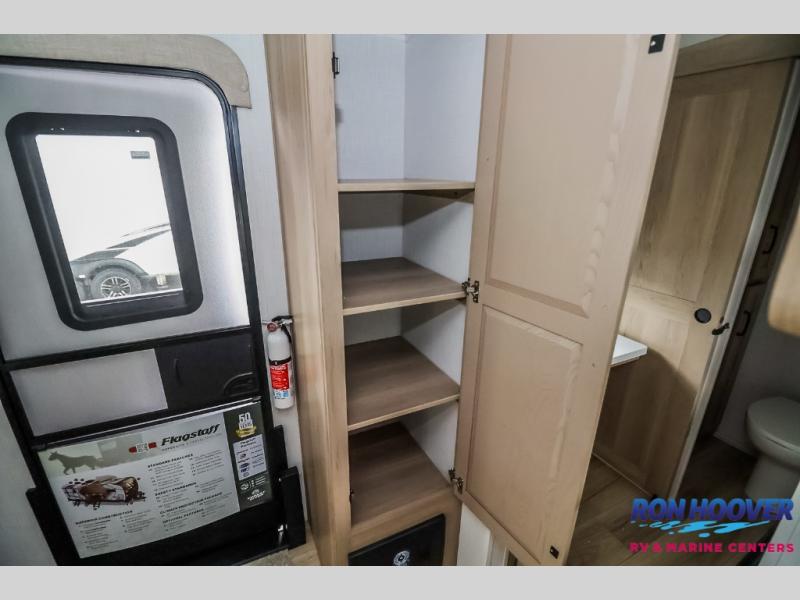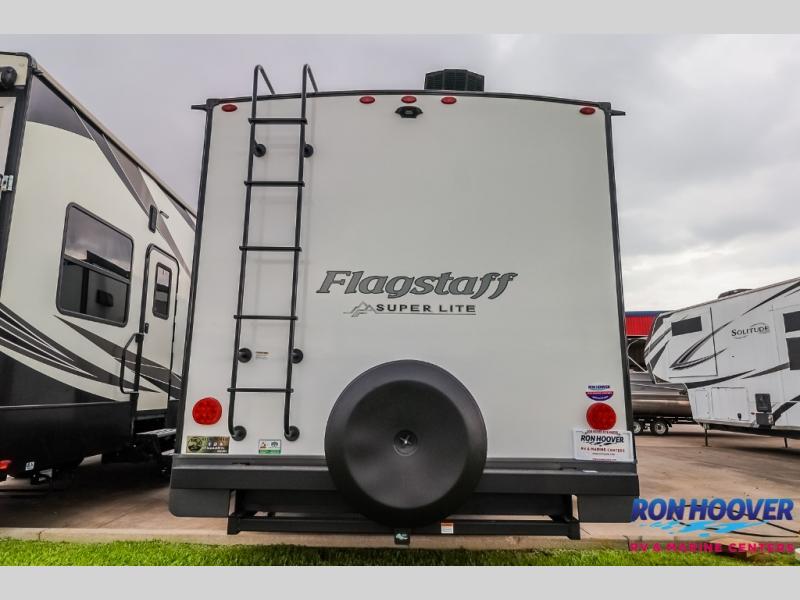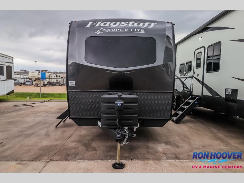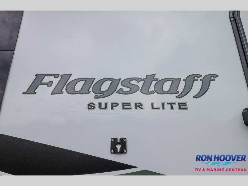 With any Flagstaff Super Lite travel trailer by Forest River the towing features include the TST tire pressure monitor system with a monitor providing safety on the road, Easy Lube axles and Nev-R adjust brakes, a power tongue jack for easy setup, and rear observation camera prep. Each is built with 6 sided aluminum framed side walls, end wall, front, floor and a roof, a plywood tongue and groove subfloor, electronically controlled heated holding tanks and an enclosed underbelly allowing you to travel during any season. The interior offers a multi-zone stereo with DVD, CD, AM/FM and Bluetooth control, a Showermiser water saving system, designer bedding and so much more!