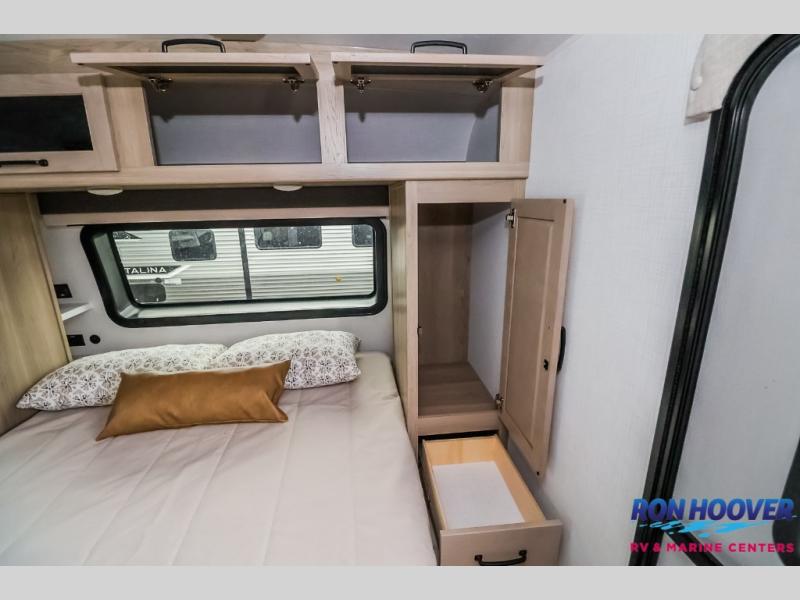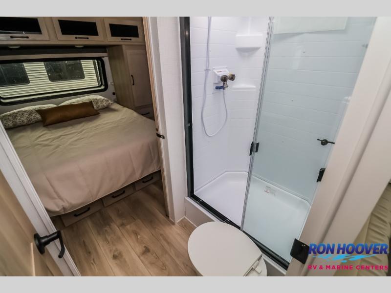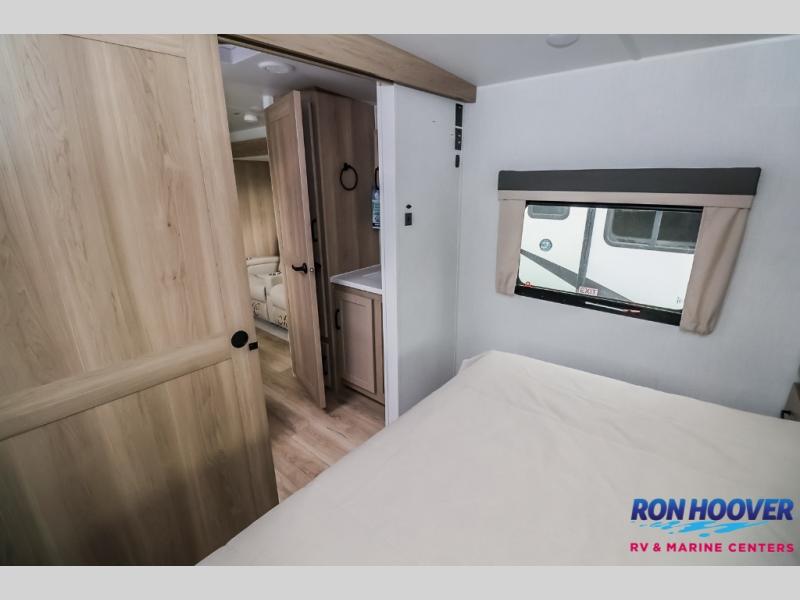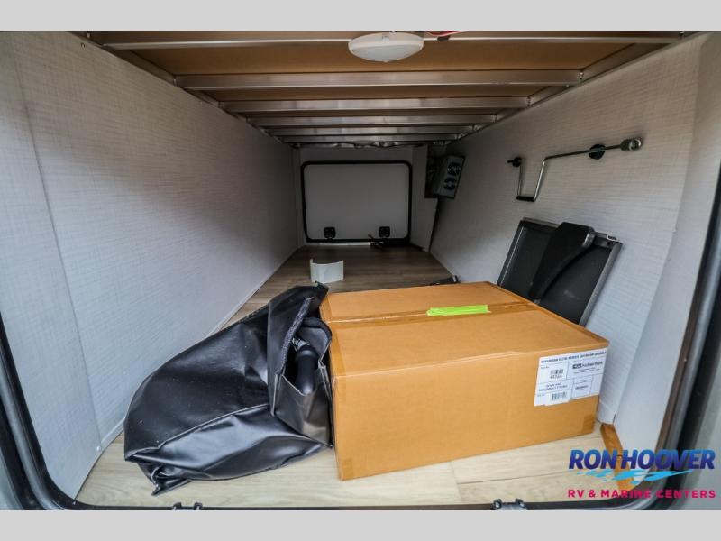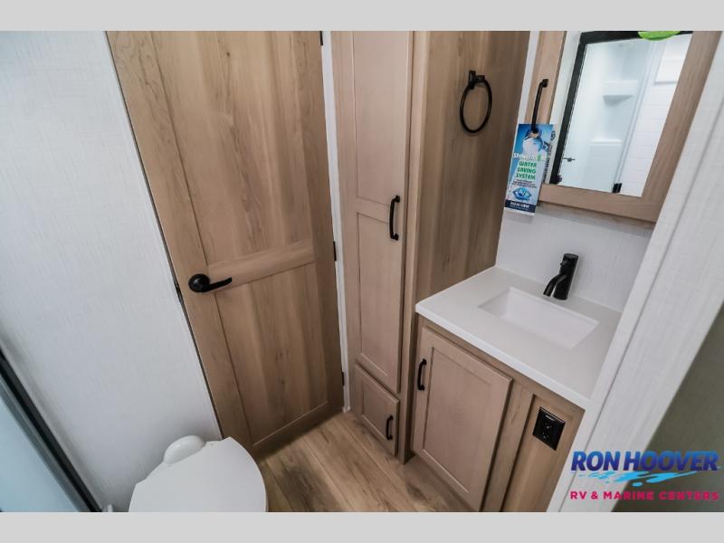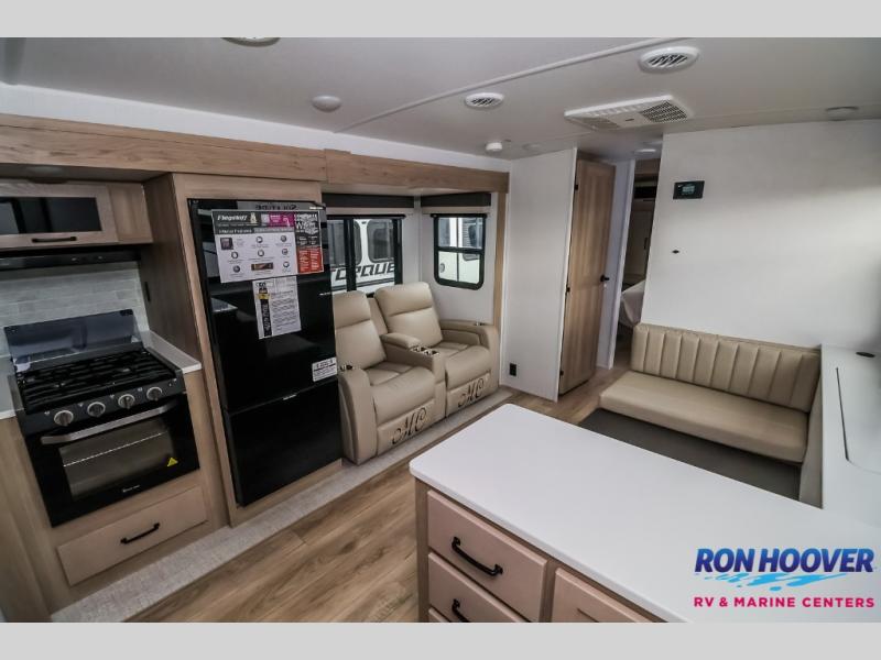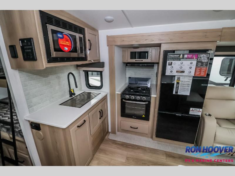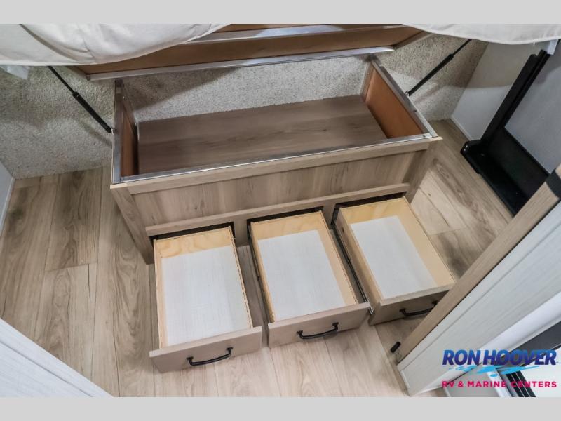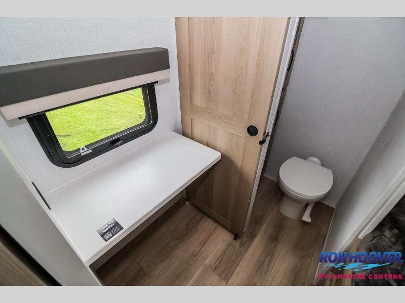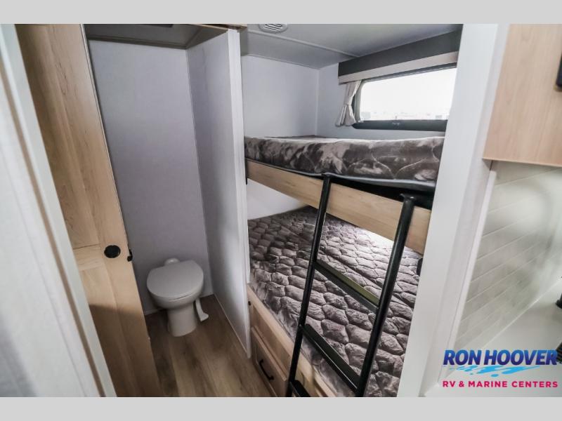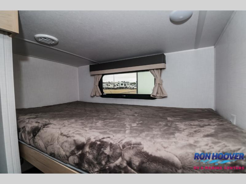 Get ready for a fun camping experience with your family and friends in this trailer that sleeps five to six! There is a rear bunkhouse suite with 43" x 74" bunks, a desk, and a half bath for added convenience. You will also find a front master bedroom with a queen bed, easy access to the walk-thru bath, and one of the dual entry doors. There is abundant storage for your snacks and dry ingredients in the pantry/wardrobe, your cold items in the 12V refrigerator, and throughout the interior and along the exterior. You can load the larger gear in the front pass-thru with an optional steel sliding tray, and other outdoor items in the rear or side storage compartments.