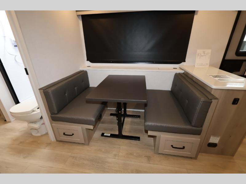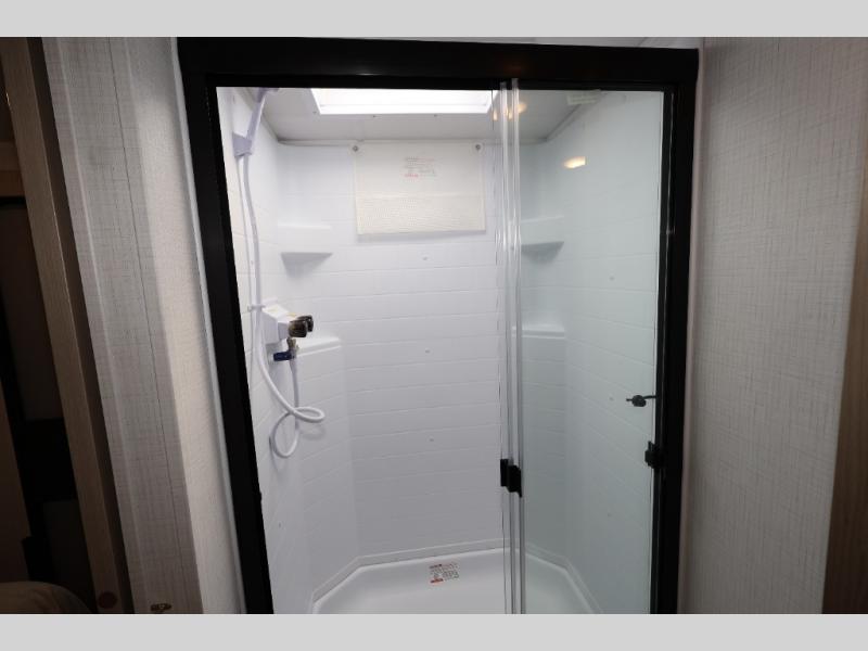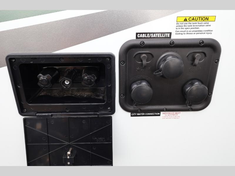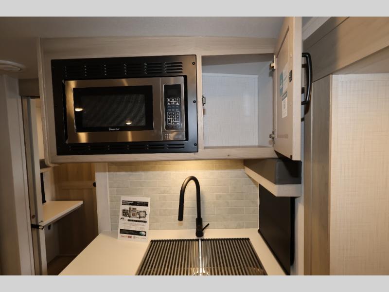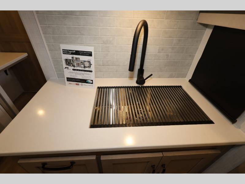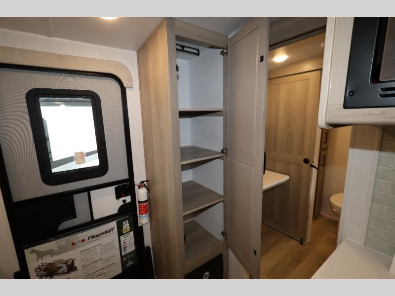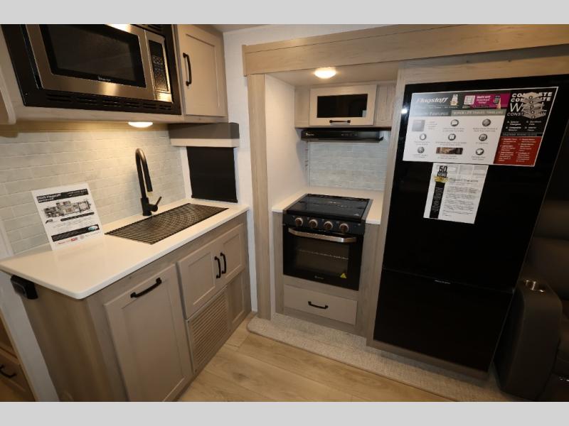 With any Flagstaff Super Lite travel trailer by Forest River the towing features include the TST tire pressure monitor system with a monitor providing safety on the road, Easy Lube axles and Nev-R adjust brakes, a power tongue jack for easy setup, and rear observation camera prep. Each is built with 6 sided aluminum framed side walls, end wall, front, floor and a roof, a plywood tongue and groove subfloor, electronically controlled heated holding tanks and an enclosed underbelly allowing you to travel during any season. The interior offers a multi-zone stereo with DVD, CD, AM/FM and Bluetooth control, a Showermiser water saving system, designer bedding and so much more!