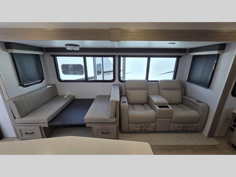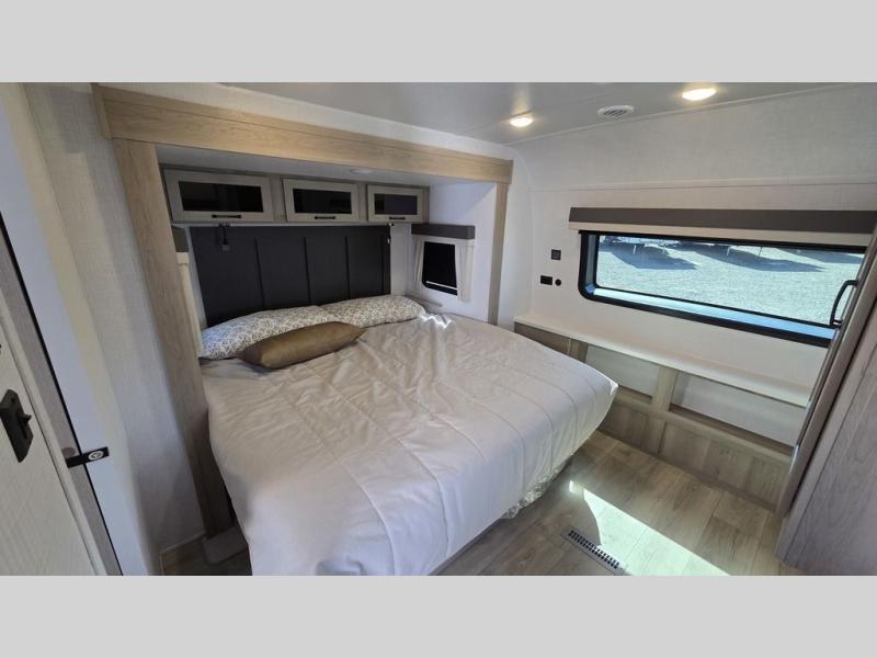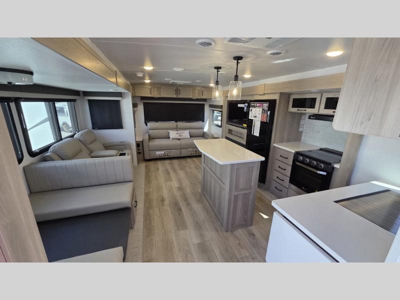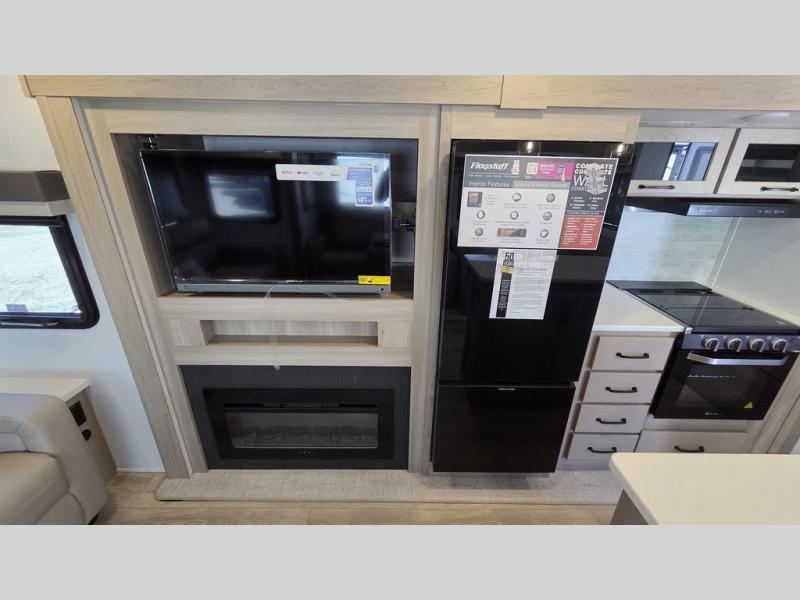 If you enjoy entertaining friends while camping, this trailer offers seating for nine in the combined living and kitchen area on the hide-a-bed sofa, the theater seats and the booth dinette. Everyone can visit, watch the Smart TV and enjoy the fireplace all while the cook is preparing snacks in the kitchen with full amenities. The full bathroom has two entries for convenience, and the front bedroom offers a queen bed slide with a king bed option, plus plenty of storage. And the two 11' awnings offer an outdoor living area after you add your camping chairs.