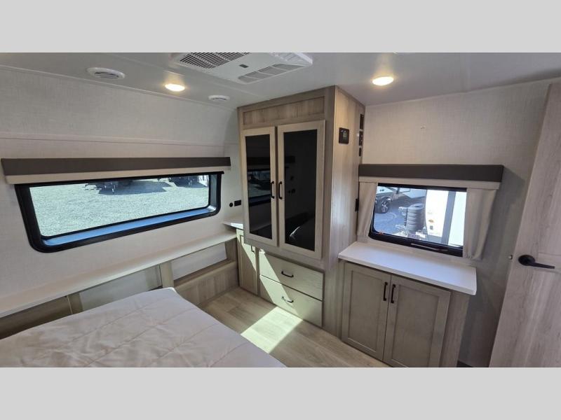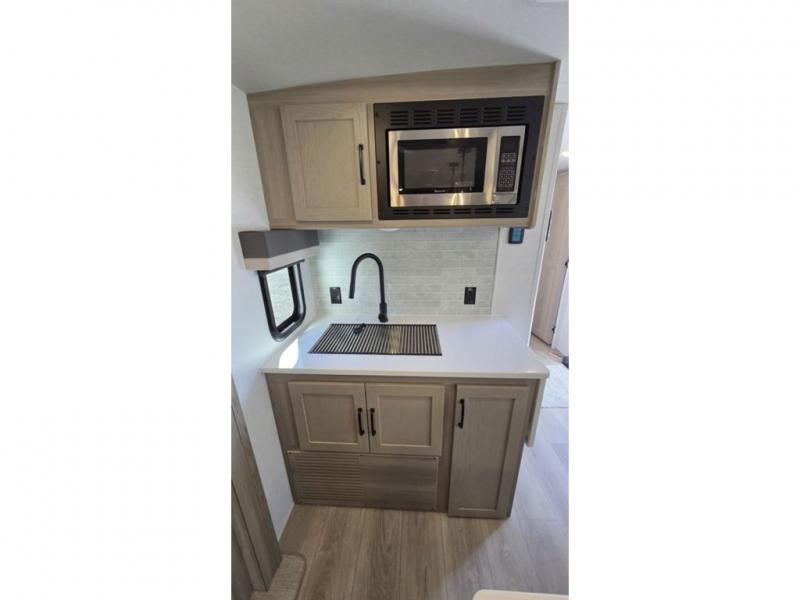With any Flagstaff Super Lite travel trailer by Forest River the towing features include the TST tire pressure monitor system with a monitor providing safety on the road, Easy Lube axles and Nev-R adjust brakes, a power tongue jack for easy setup, and rear observation camera prep. Each is built with 6 sided aluminum framed side walls, end wall, front, floor and a roof, a plywood tongue and groove subfloor, electronically controlled heated holding tanks and an enclosed underbelly allowing you to travel during any season. The interior includes designer kitchen backsplash, solid surface kitchen countertops, Sedonwood cabinetry, and solid wood cabinet doors and drawers to make you feel right at home.