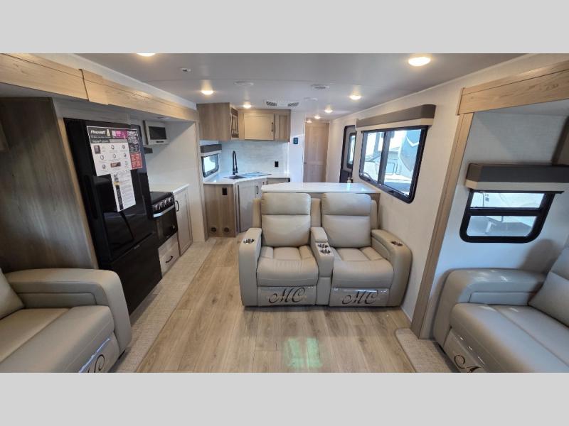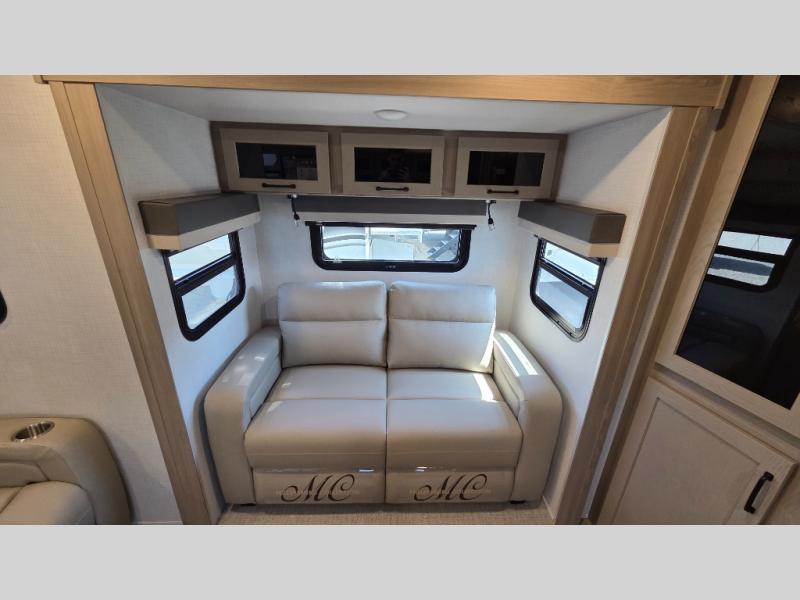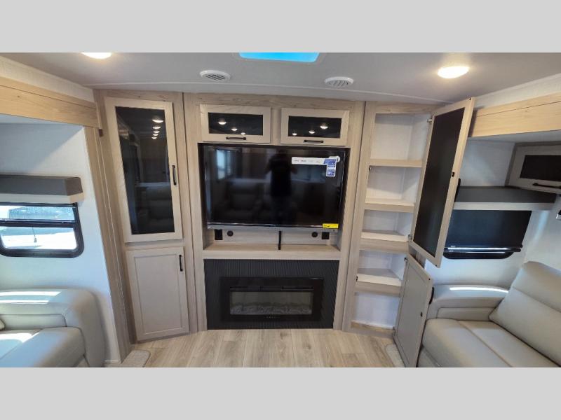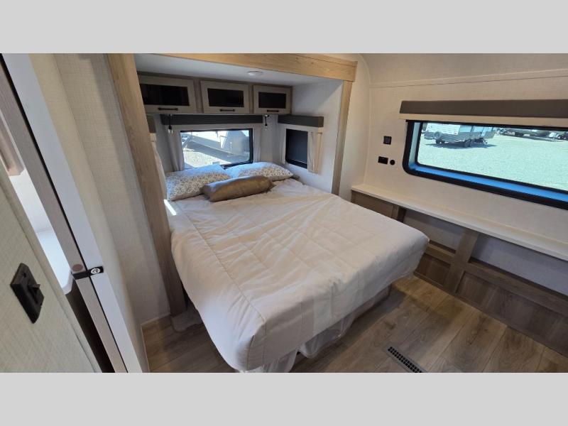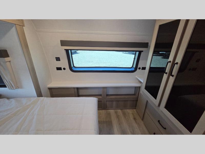 Weekends at the lake are made easy in this spacious travel trailer that can sleep six each night. Once you arrive at the campsite, unload your things from the exterior storage, set up the 21' awning, then head out on a trail to stretch your legs. You can freshen up in the dual entry bath when you return before preparing lunch for everyone. A three burner range comes standard, along with a 21" gas oven and microwave oven, and there is a table with bar stools that overlooks the rear living area for those who want to relax. Your guests can convert the rear living area into their bedroom at night since there are dual hide-a-bed sofas, and the rear entertainment center includes a Smart TV so they can watch a movie in bed. And check out the front master bedroom with its queen bed slide out, wardrobe, front shelf, and optional TV!
