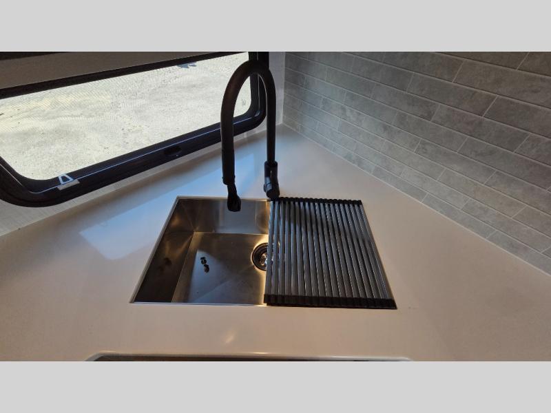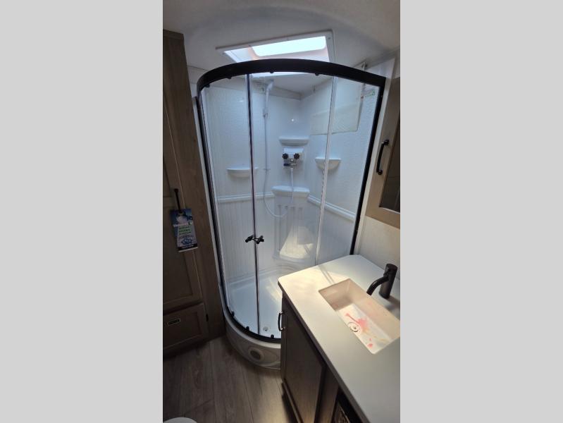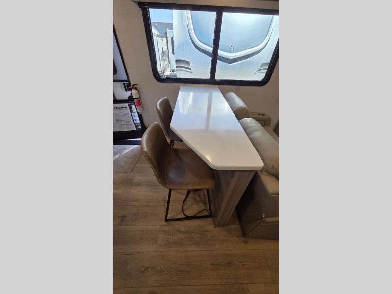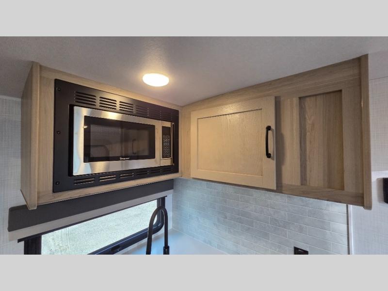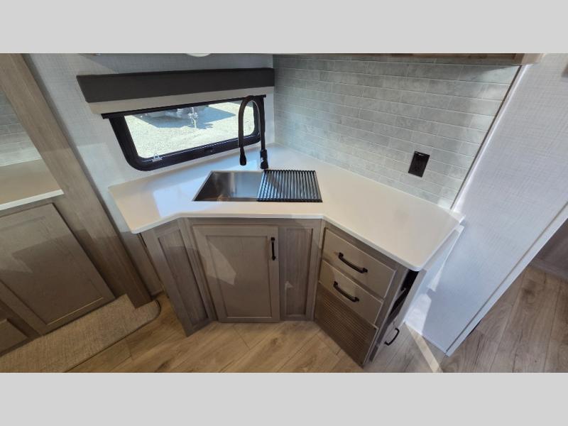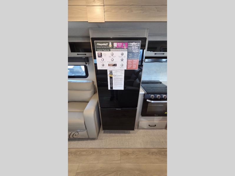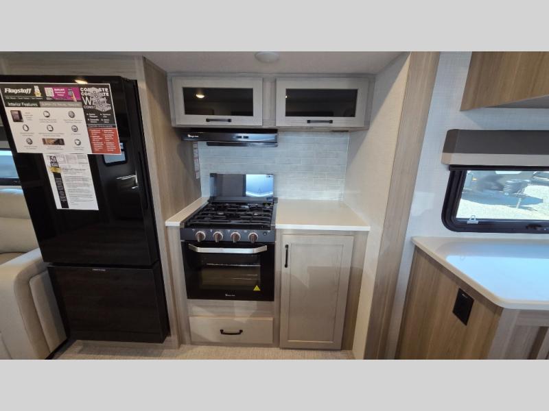 With any Flagstaff Super Lite travel trailer by Forest River the towing features include the TST tire pressure monitor system with a monitor providing safety on the road, Easy Lube axles and Nev-R adjust brakes, a power tongue jack for easy setup, and rear observation camera prep. Each is built with 6 sided aluminum framed side walls, end wall, front, floor and a roof, a plywood tongue and groove subfloor, electronically controlled heated holding tanks and an enclosed underbelly allowing you to travel during any season. The interior includes designer kitchen backsplash, solid surface kitchen countertops, Sedonwood cabinetry, and solid wood cabinet doors and drawers to make you feel right at home.