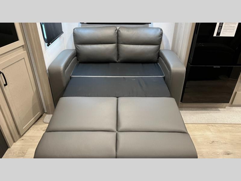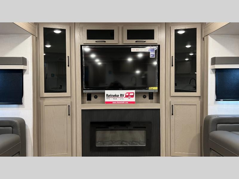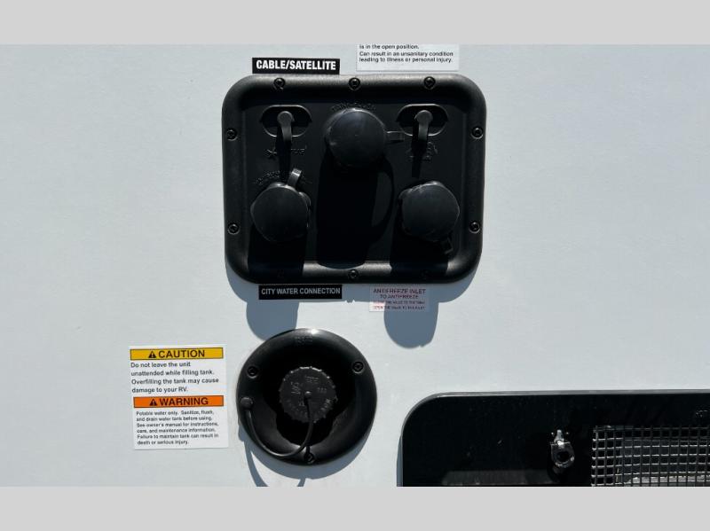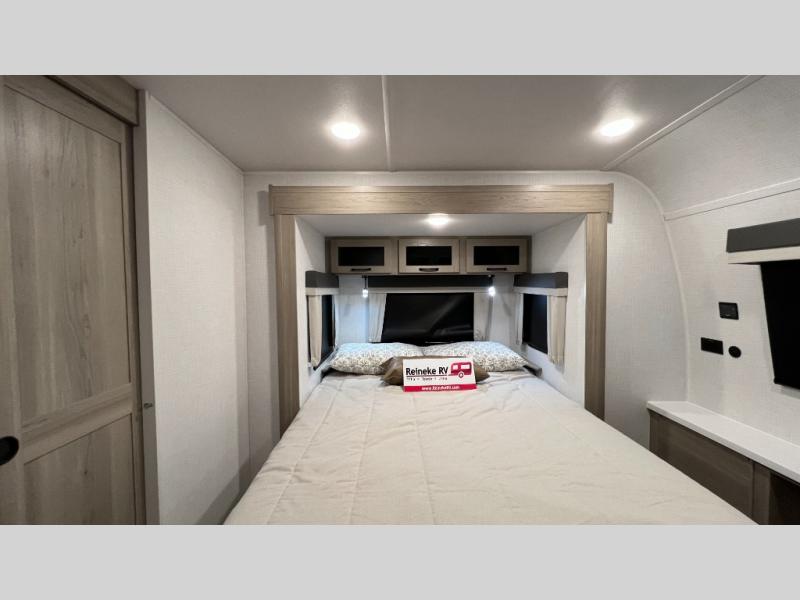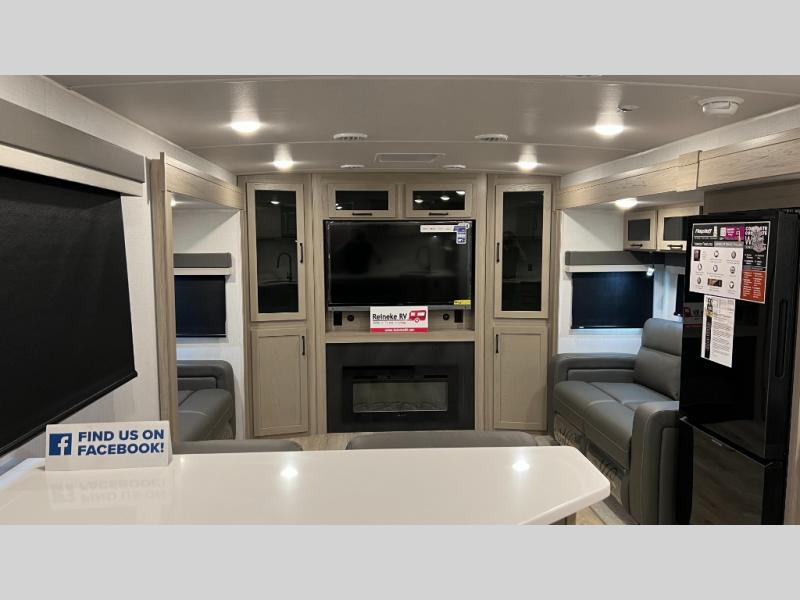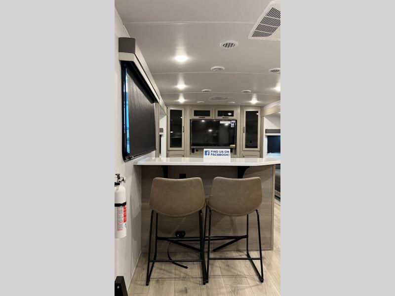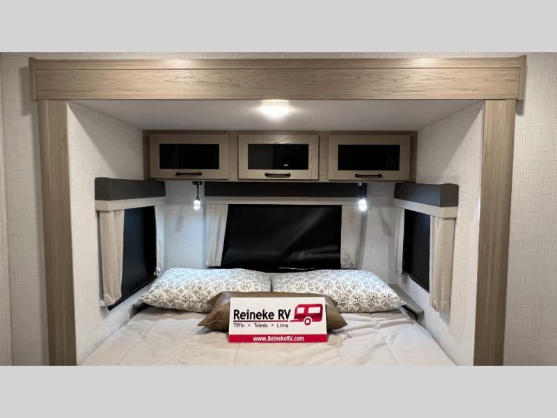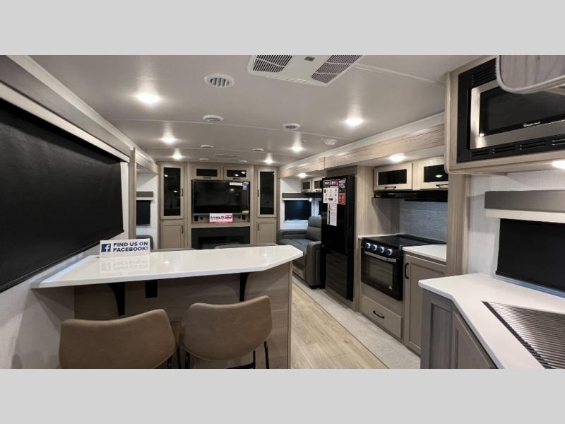 Weekends at the lake are made easy in this spacious travel trailer that can sleep six each night. Once you arrive at the campsite, unload your things from the exterior storage, set up the 21' awning, then head out on a trail to stretch your legs. You can freshen up in the dual entry bath when you return before preparing lunch for everyone. A three burner range comes standard, along with a 21" gas oven and microwave oven, and there is a table with bar stools that overlooks the rear living area for those who want to relax. Your guests can convert the rear living area into their bedroom at night since there are dual hide-a-bed sofas, and the rear entertainment center includes a Smart TV so they can watch a movie in bed. And check out the front master bedroom with its queen bed slide out, wardrobe and front shelf!