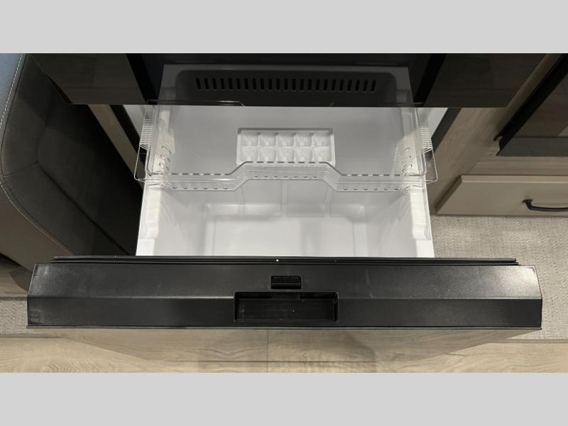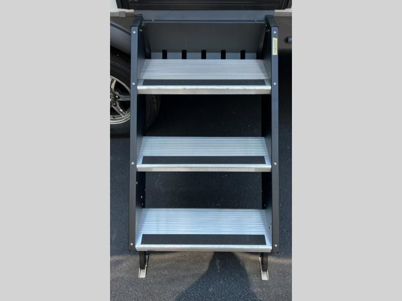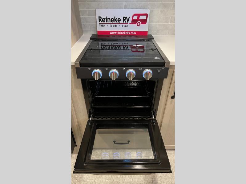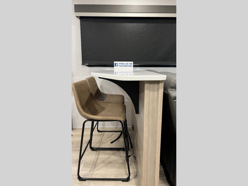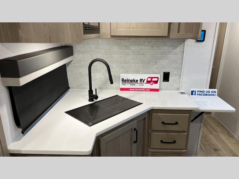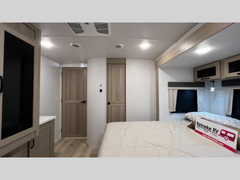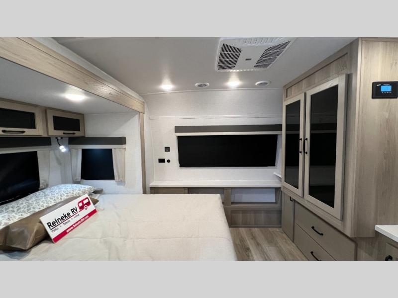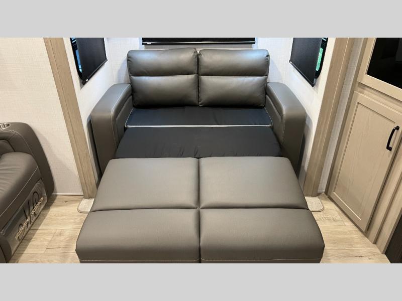 Weekends at the lake are made easy in this spacious travel trailer that can sleep six each night. Once you arrive at the campsite, unload your things from the exterior storage, set up the 21' awning, then head out on a trail to stretch your legs. You can freshen up in the dual entry bath when you return before preparing lunch for everyone. A three burner range comes standard, along with a 21" gas oven and microwave oven, and there is a table with bar stools that overlooks the rear living area for those who want to relax. Your guests can convert the rear living area into their bedroom at night since there are dual hide-a-bed sofas, and the rear entertainment center includes a Smart TV so they can watch a movie in bed. And check out the front master bedroom with its queen bed slide out, wardrobe and front shelf!