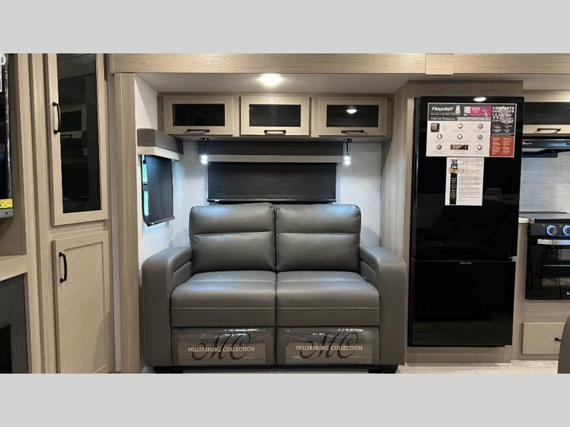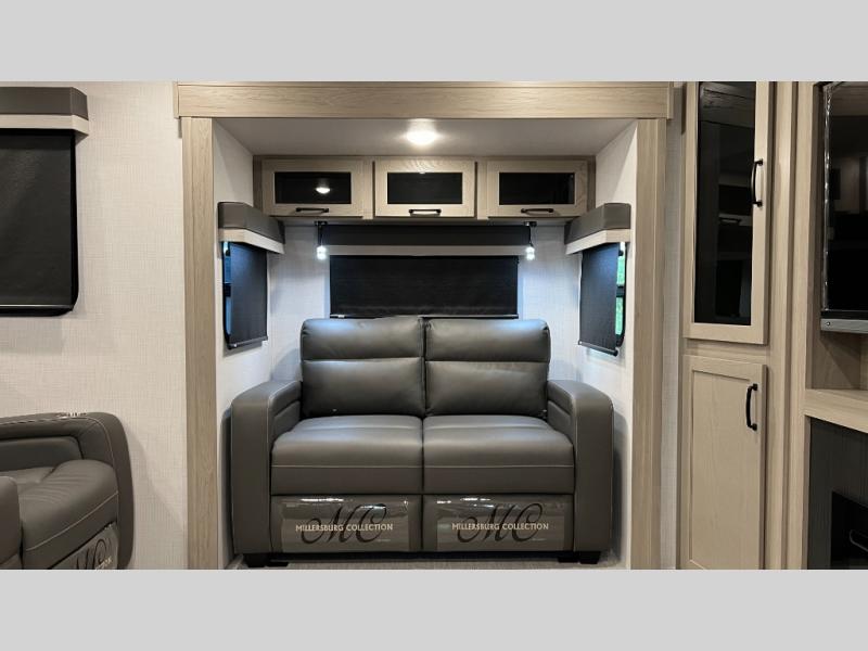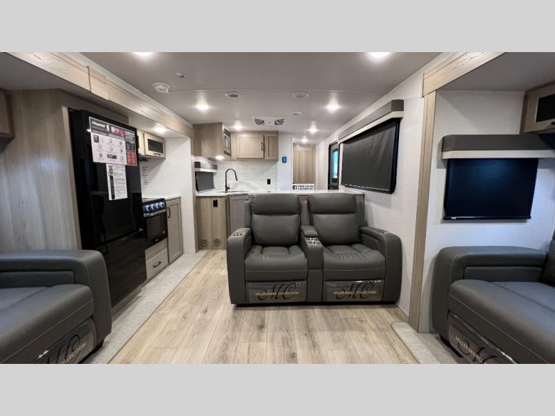 With Upgrades: 2nd 15K A/C w/ Heat, 3 Slide Toppers, Day / Night Roller Shades and Extra Maxxair. Solar Panel / Inverter, Table w/ Bar Stools, Opposing Living Room Slides, Dual Hide-A-Bed Sofas, Platinum Package & Enclosed Underbelly & Heated Holding Tanks