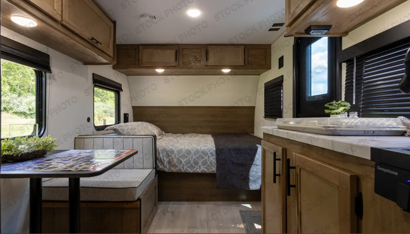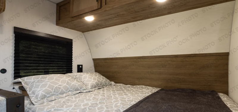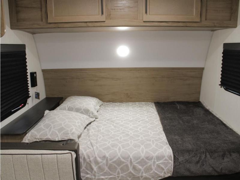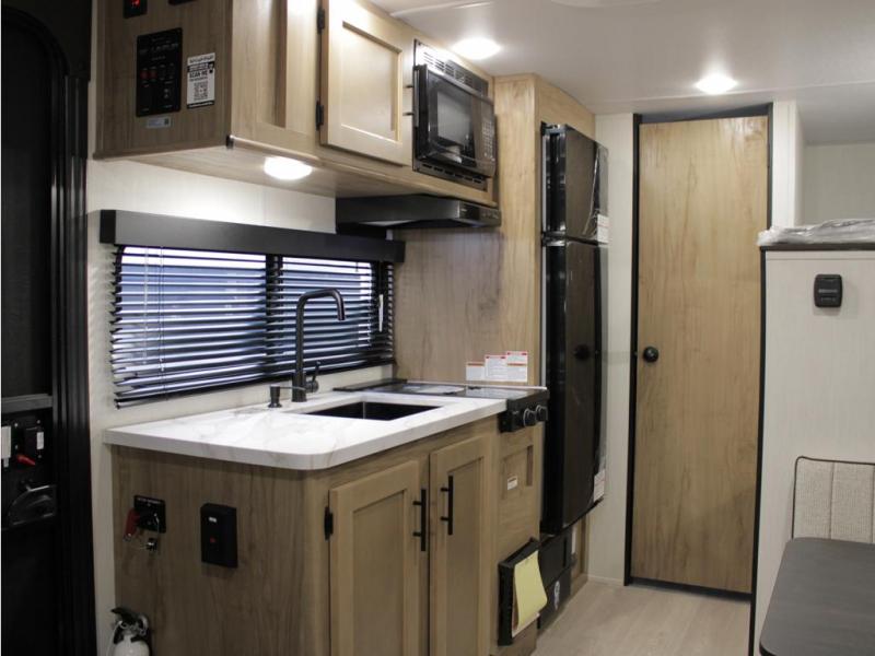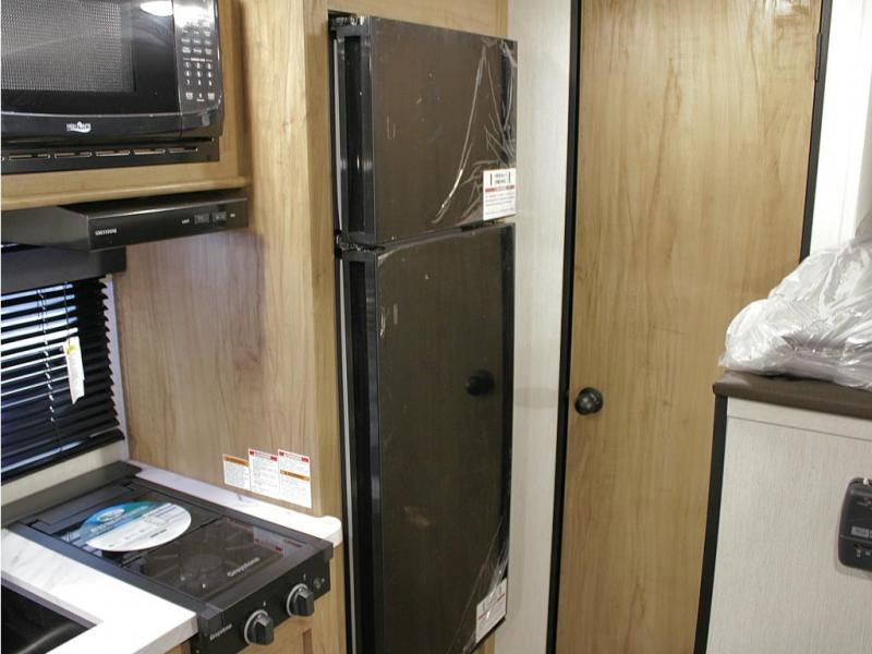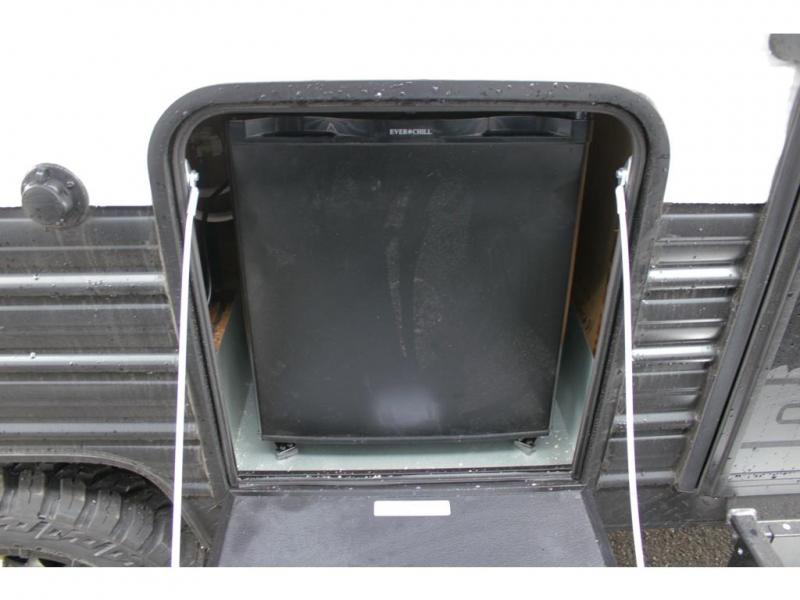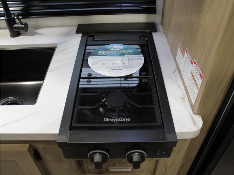 The whole family can sleep comfortably in this travel trailer! It has a set of bunk beds for the kids to sleep on, and you can sleep comfortably on the front queen bed with overhead cabinets and a shelf. There is even an exterior storage plus door that accesses the storage space under the bottom bunk. The chef will enjoy preparing their best home cooked meals either indoors with the high output cooktop or at the outside mini kitchen while staying protected by the 12' power awning!