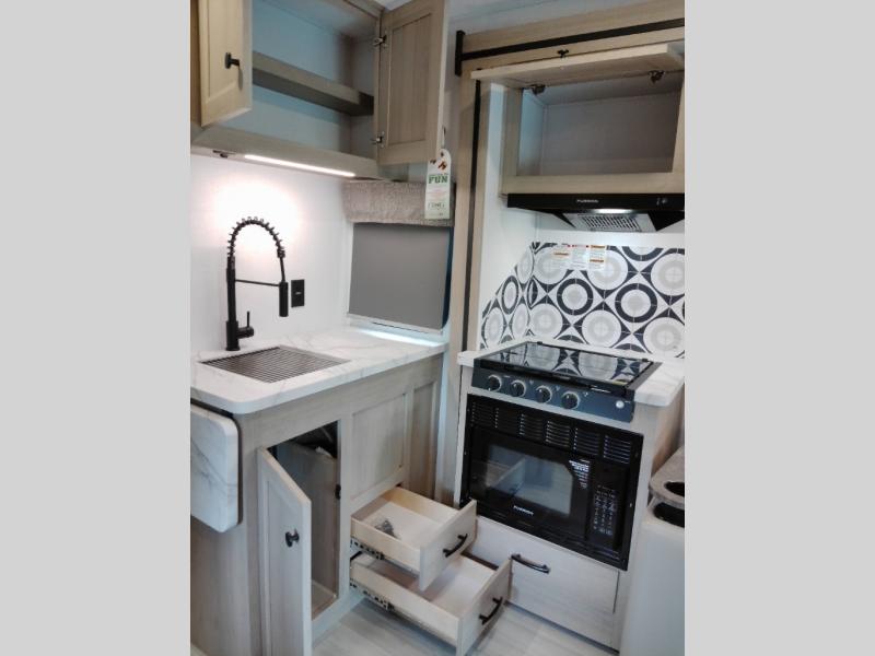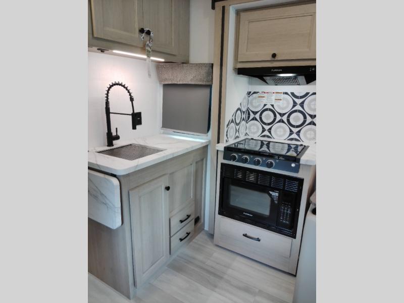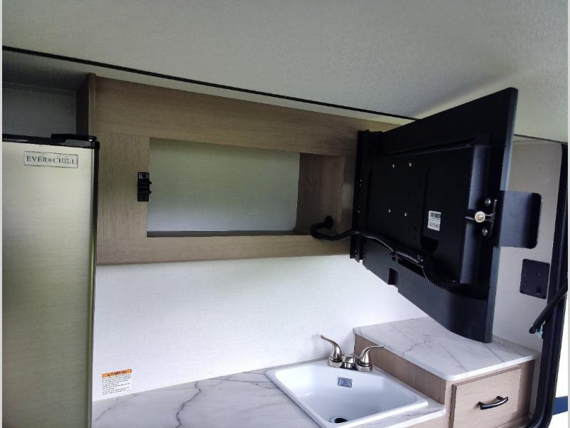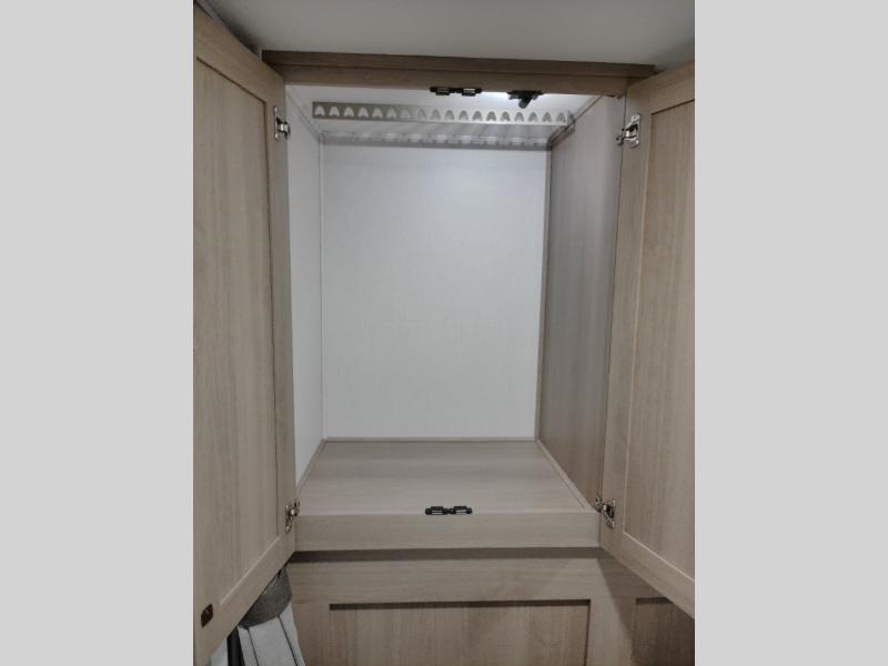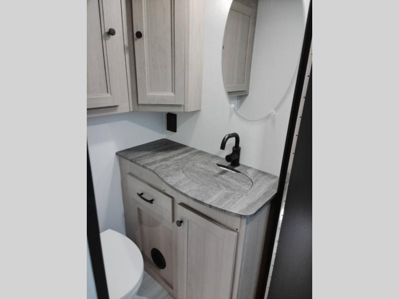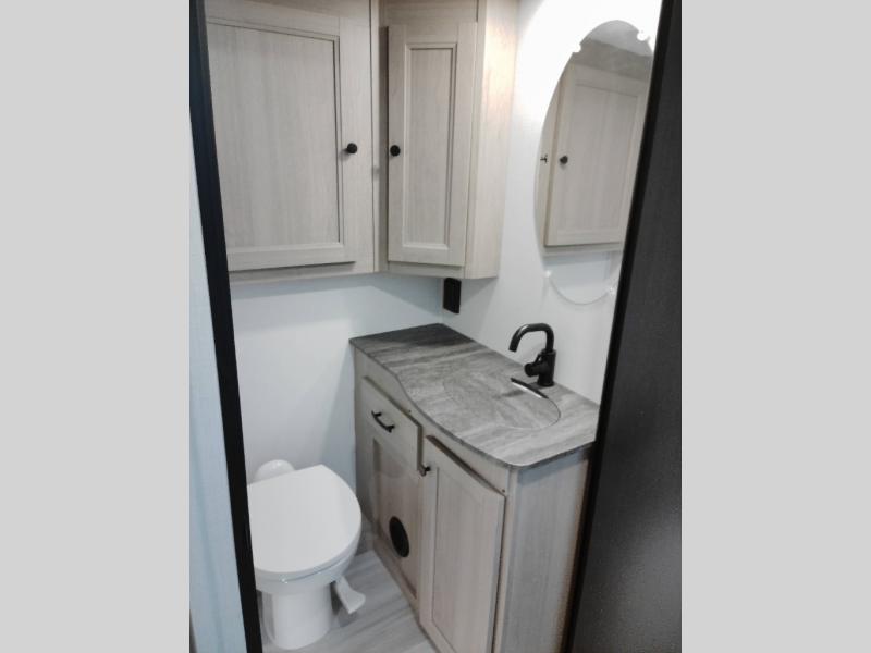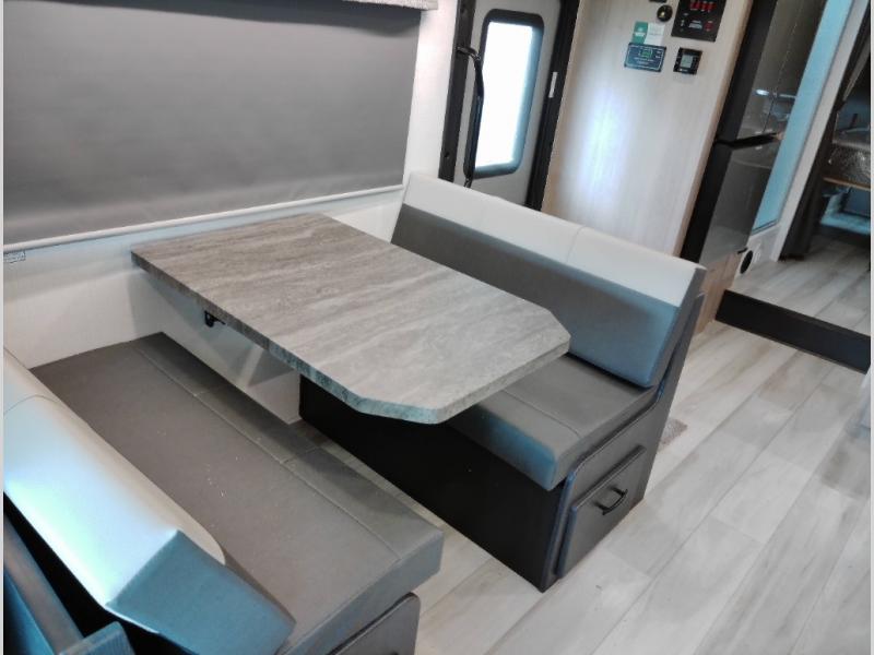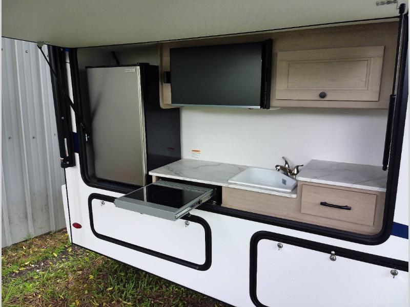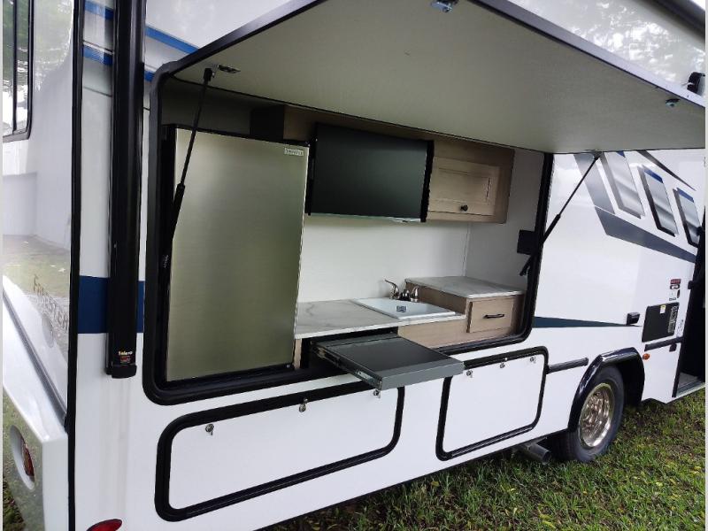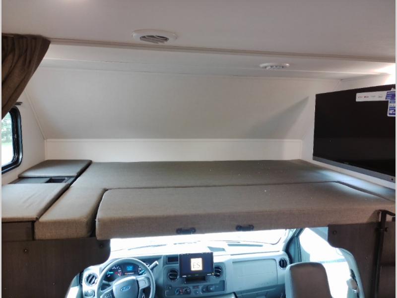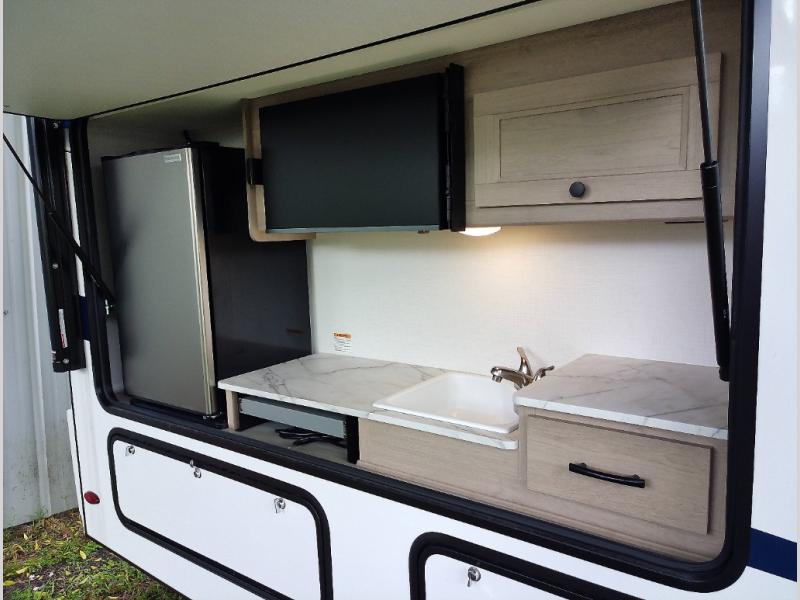The chef will love cooking with this motorhome! They can choose to cook either indoors with the three burner cooktop and flip-up countertop or head to the outside kitchen to breathe in some fresh air while they grill up some juicy burgers on the cooktop. The separated bathroom makes it easy for one to freshen up in the 24" x 36" shower while another uses the private toilet and sink with a medicine cabinet above it. The rear private bedroom has a 60" x 74" queen bed slide with nightstands to set your glass of water and wardrobes on either side of a linen closet with a 12V TV for your entertainment. The booth dinette and sofa also offer comfortable sleeping spaces once converted, as well as the 60" x 80" bunk over cab mat which can be switched out for an optional Trekker cap with a built-in entertainment center!