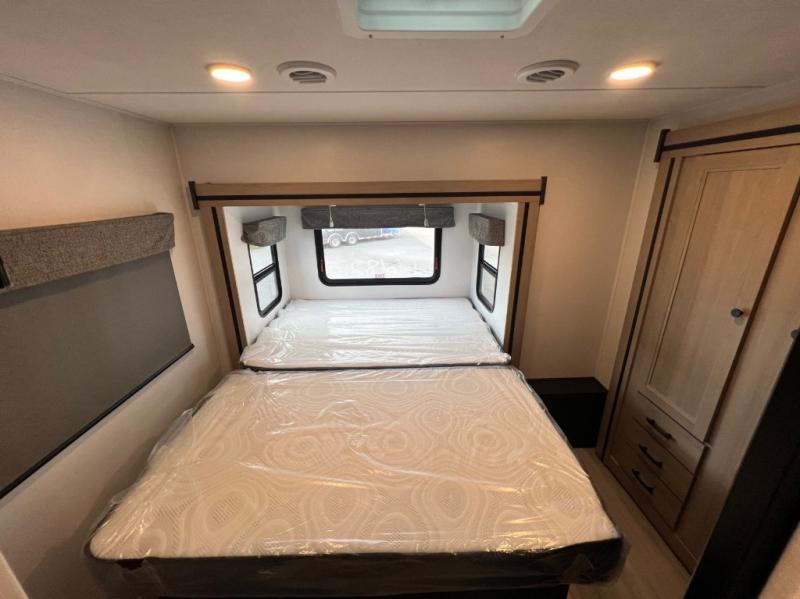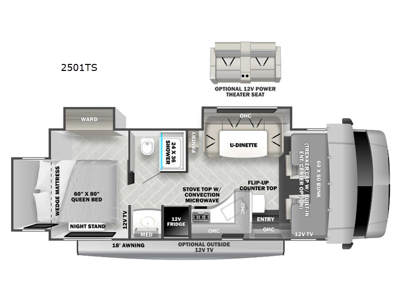 This motorhome has everything you will need for a fun and comfortable road trip! The rear private bedroom has a queen bed slide, a 12V TV, and a wardrobe to keep your clothes looking nice. Plus, it leads into the separated bathroom which has a private shower and a toilet across from a sink with a medicine cabinet. The 10.7 cu. ft. 12V refrigerator is big enough to store your perishables, the flip-up countertop will make meal prepping easier, and the three burner cooktop is just waiting for you to fry up some bacon. Enjoy all of your meals and game nights at the U-shaped dinette slide then transform it into an extra sleeping space if needed. Speaking of sleeping spaces, the 60" x 80" bunk over cab mat is a comfortable place for one to sleep or you can switch it out for an optional Trekker cap with a built-in entertainment center. The outdoor 28" TV adds entertainment to the outdoors.