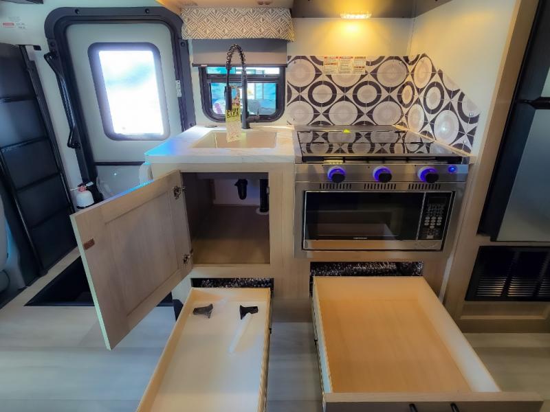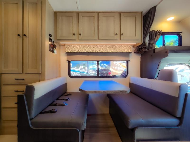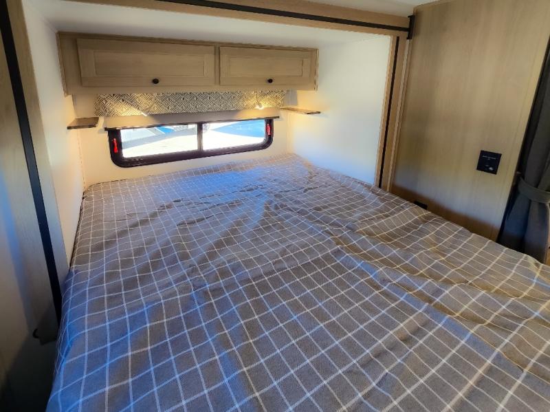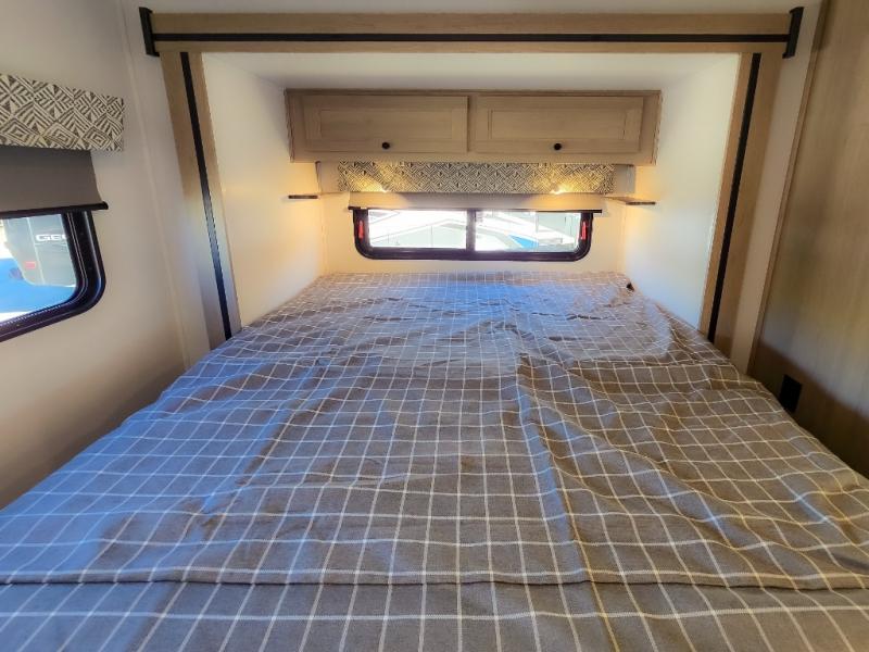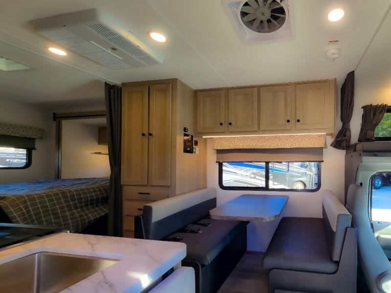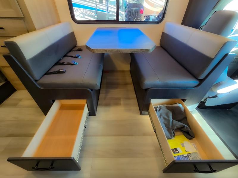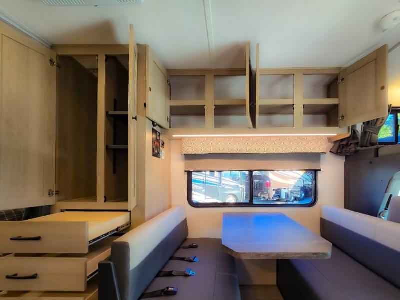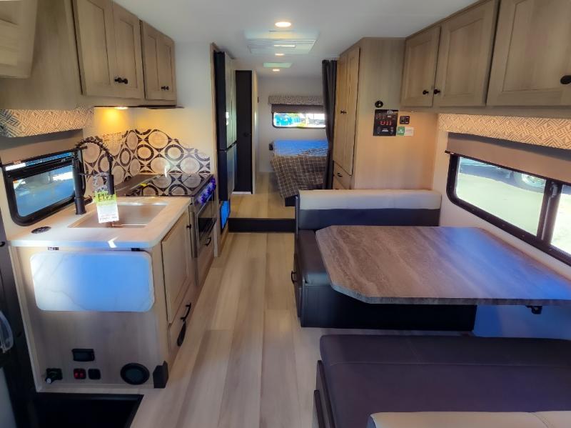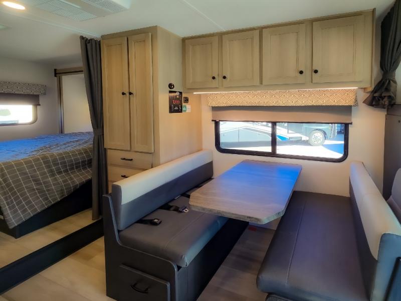 Enjoy trips near and far in this single slide out coach. The kitchen provides a 10.7 cu. ft. 12V refrigerator to store the cold items, a convection microwave and a recessed three-burner range to whip up meals. The private toilet and shower give you a place to get cleaned up, and the bathroom sink is just outside the door. This model includes a queen bed slide out with a wedge mattress, and there is a cab-over bunk for your guests. You can spend your evenings playing cards at the booth dinette, or head outdoors to relax under the 14' power awning with LED lights!