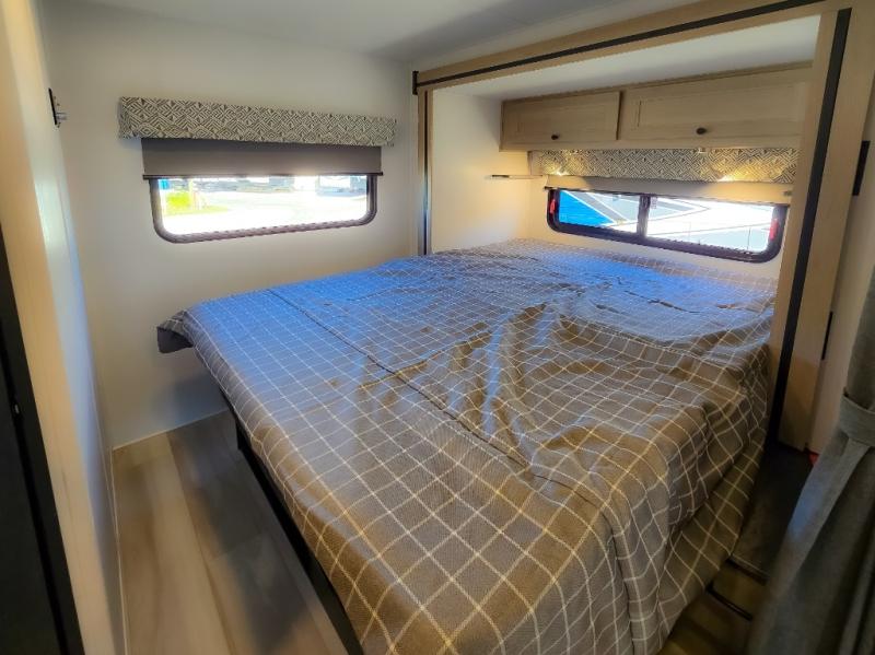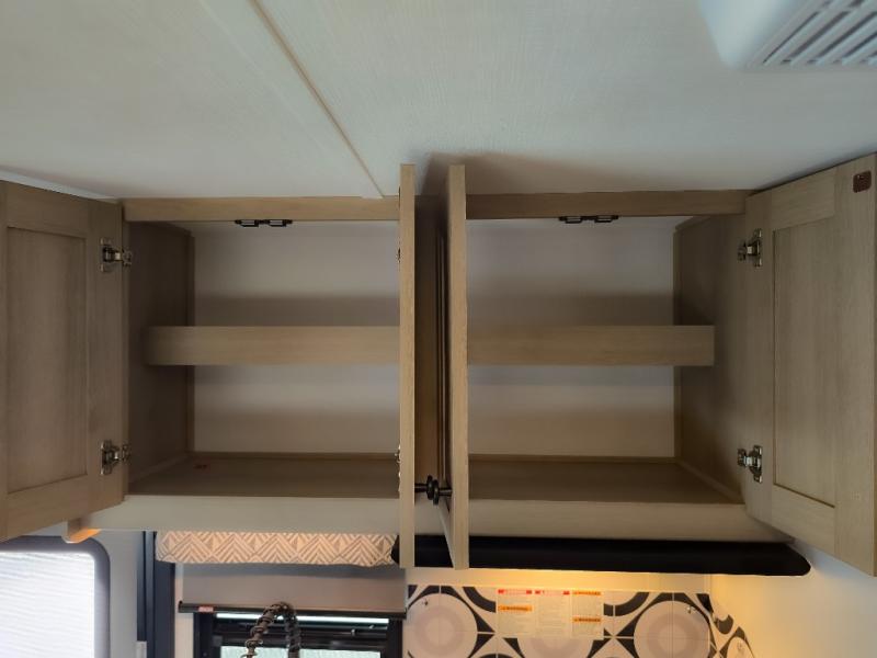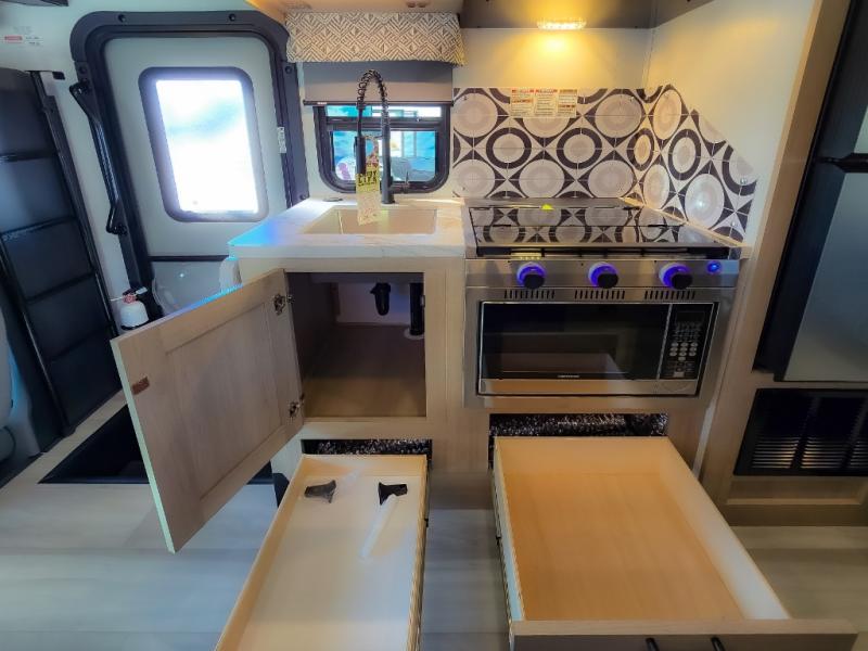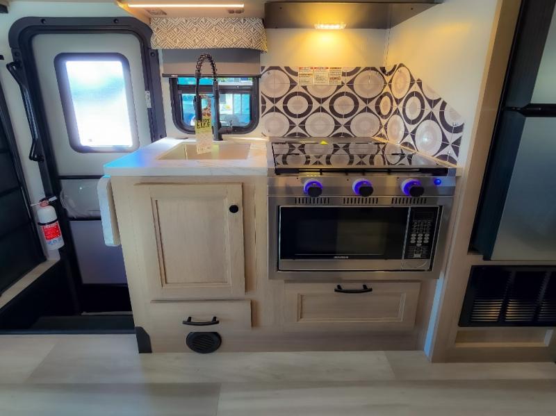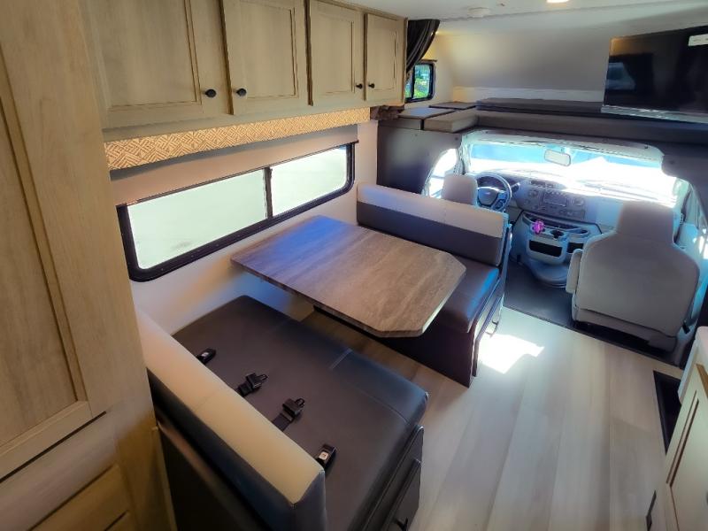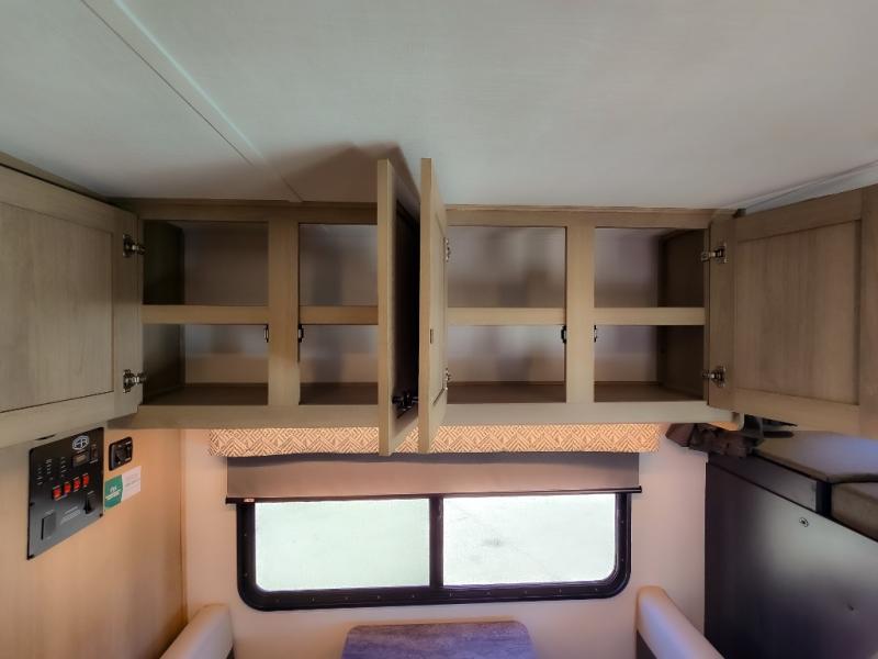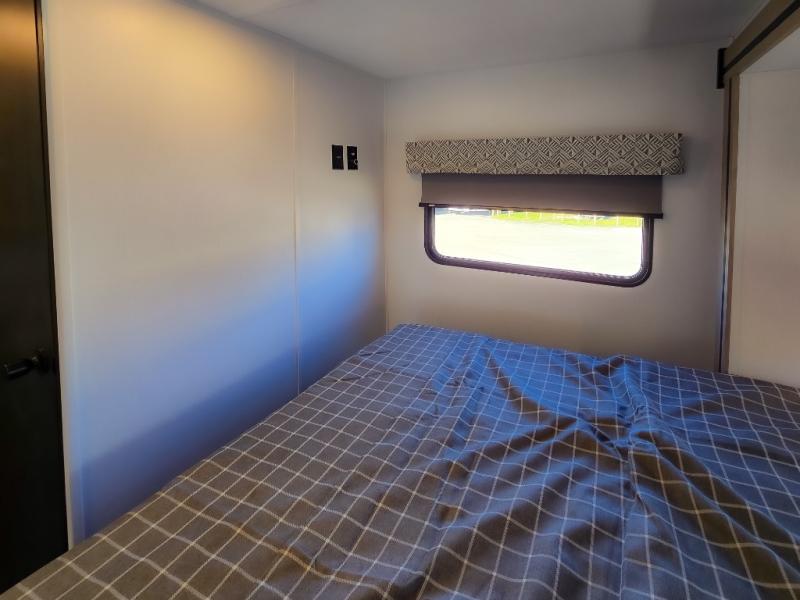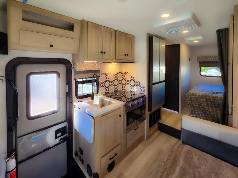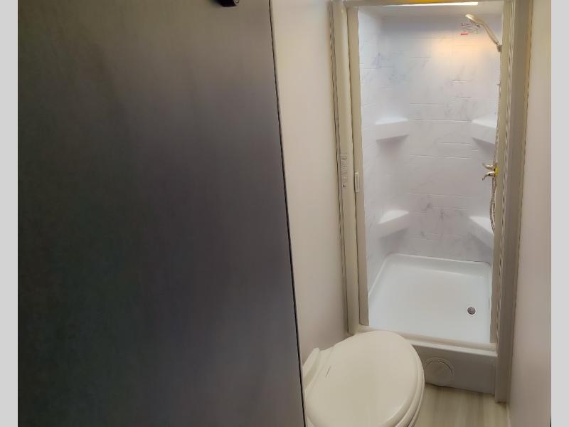 Enjoy trips near and far in this single slide out coach. The kitchen provides a 10.7 cu. ft. 12V refrigerator to store the cold items, a convection microwave and a recessed three-burner range to whip up meals. The private toilet and shower give you a place to get cleaned up, and the bathroom sink is just outside the door. This model includes a queen bed slide out with a wedge mattress, and there is a cab-over bunk for your guests. You can spend your evenings playing cards at the booth dinette, or head outdoors to relax under the 14' power awning with LED lights!