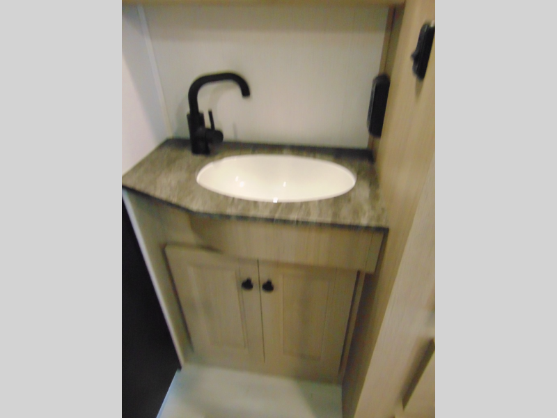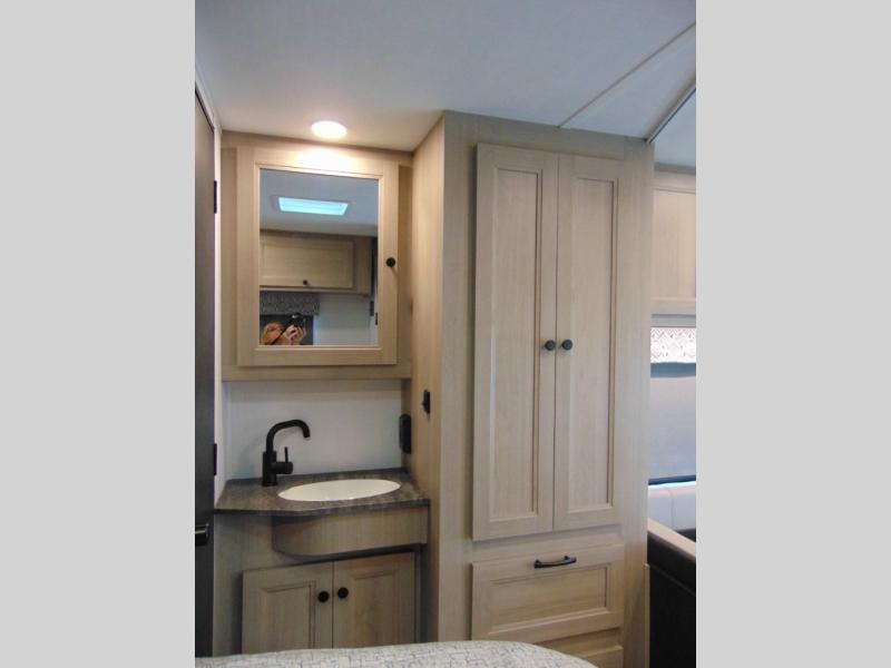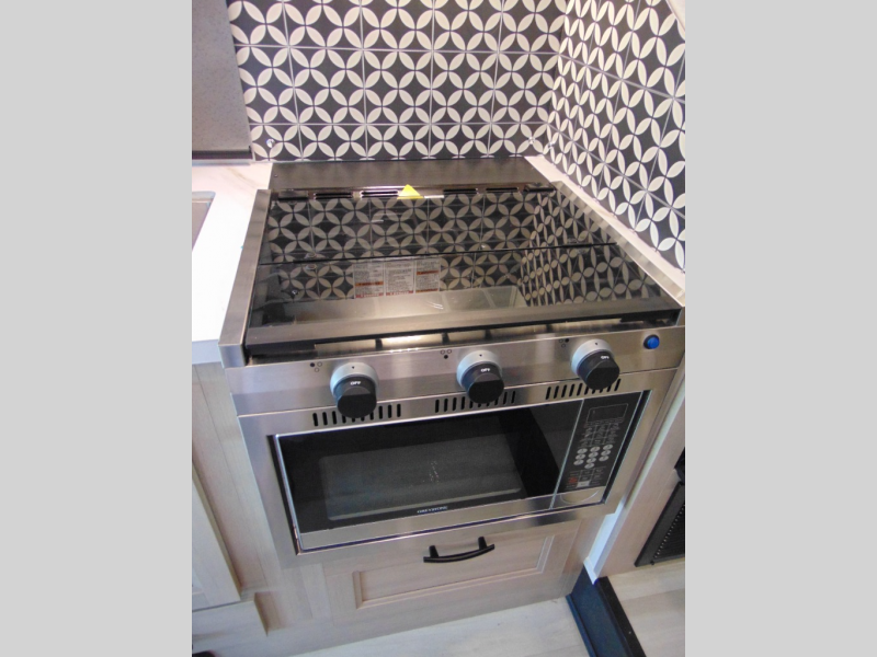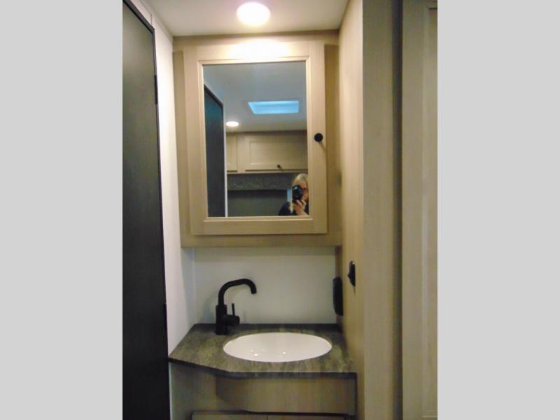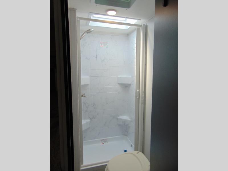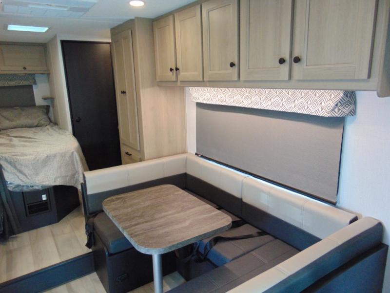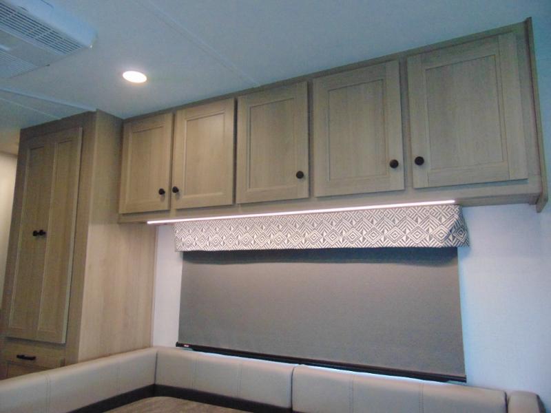Travel in style with your own accommodations in this coach. You'll find a queen-size cab-over bunk that can be utilized as extra sleeping space or even storage, plus the rear corner offers a queen bed. And don't forget about the U-dinette as extra sleeping space after dining, playing games and relaxing. The kitchen offers a 10.7 cu. ft. 12V refrigerator, a convection microwave, a recessed three-burner range, soft touch self-closing drawer guides and a cordless 12V charging plate. The private toilet and shower room gives you a place to get cleaned up, and the bathroom sink is just outside the door allowing someone else the ability to get ready at the same time.