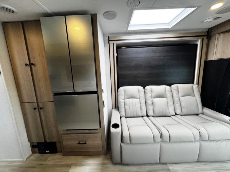 Trips across the state are made cozy in this single slide out coach for two! Once you've parked for the day, you can make lunch on the recessed induction cooktop or in the convection microwave. The sofa slide out provides a place to relax, and the Murphy bed can be folded out when you're ready for some shut-eye. You will appreciate how spacious the full rear bath is, and there is a wardrobe plus a linen closet here for ample storage. The cab-over bunk is only available with the Trekker Cap option; see dealer for more details.