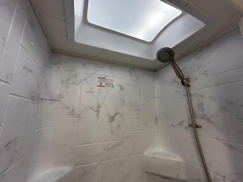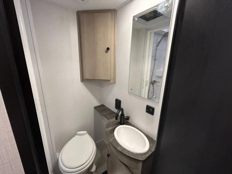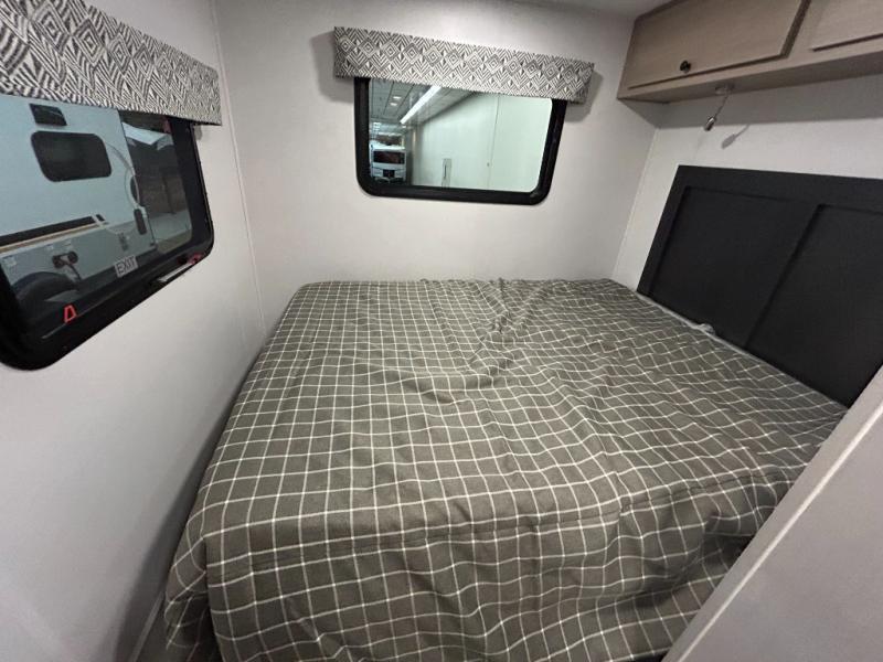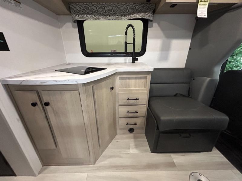 Looking for easy driving, comfortable sleeping arrangements, and a place to dine inside when you are on the road? This is the perfect couples coach with features like a wardrobe with drawers across from the side full bathroom with a shower, a double-size bed for two in the rear, plus full kitchen amenities. You will also find a 12V LED flat panel adjustable side TV and a 12V bedroom TV. There is an optional 190 watt 12V charging system available if you would like to add that feature for off-grid camping.