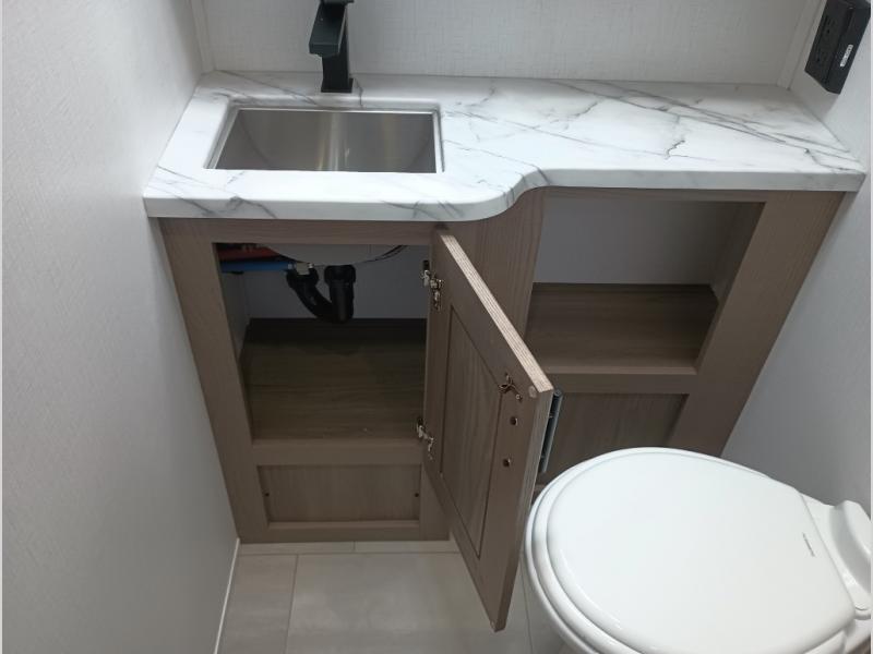 Ample counter space and storage for toiletries.