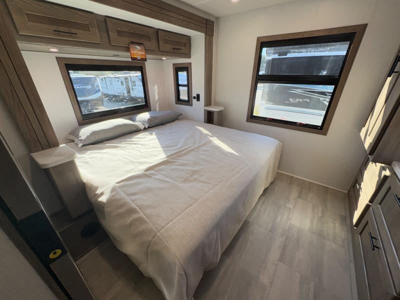 - King bed slide-out with dual nightstands and 110V/USB ports