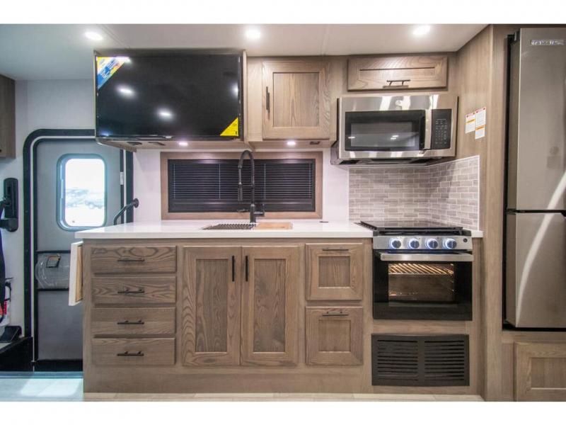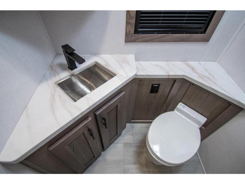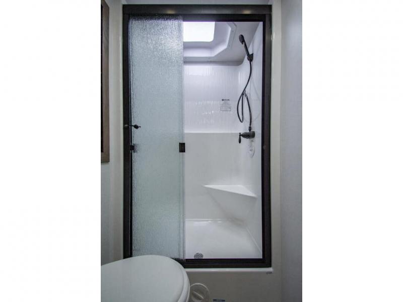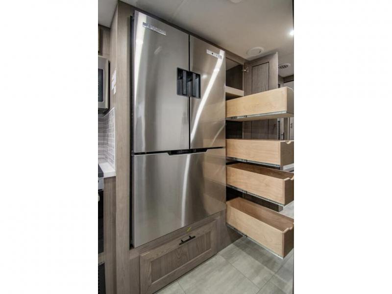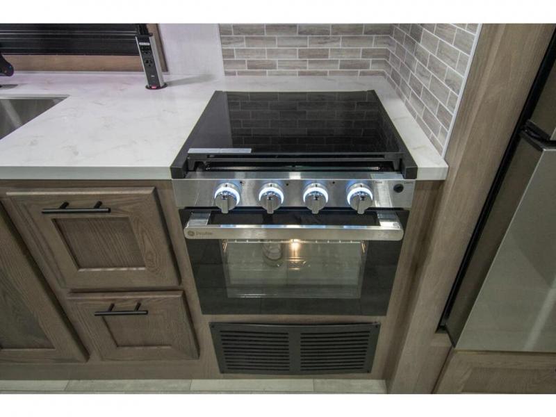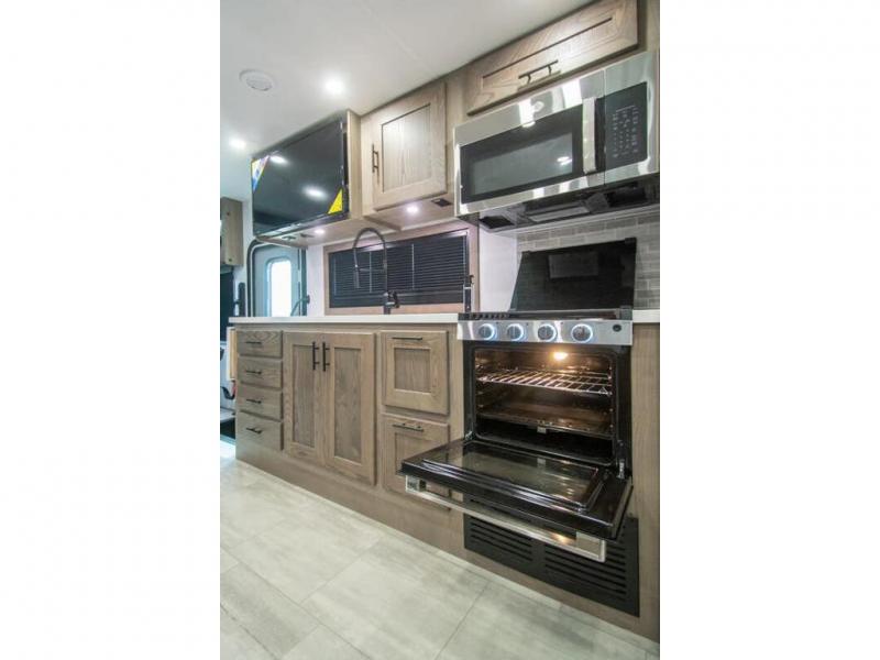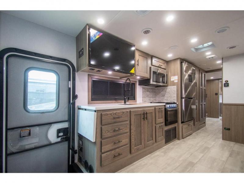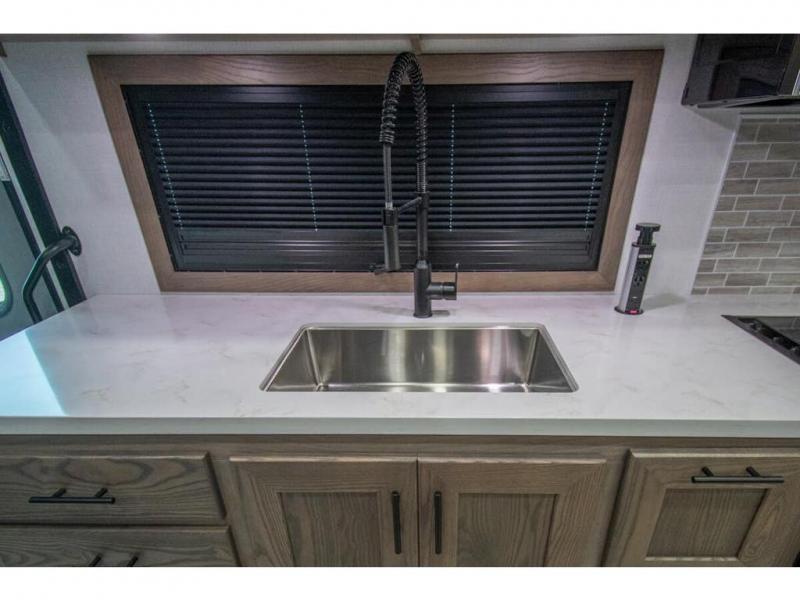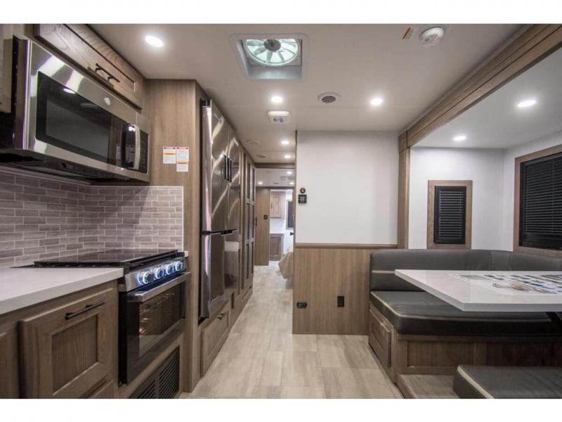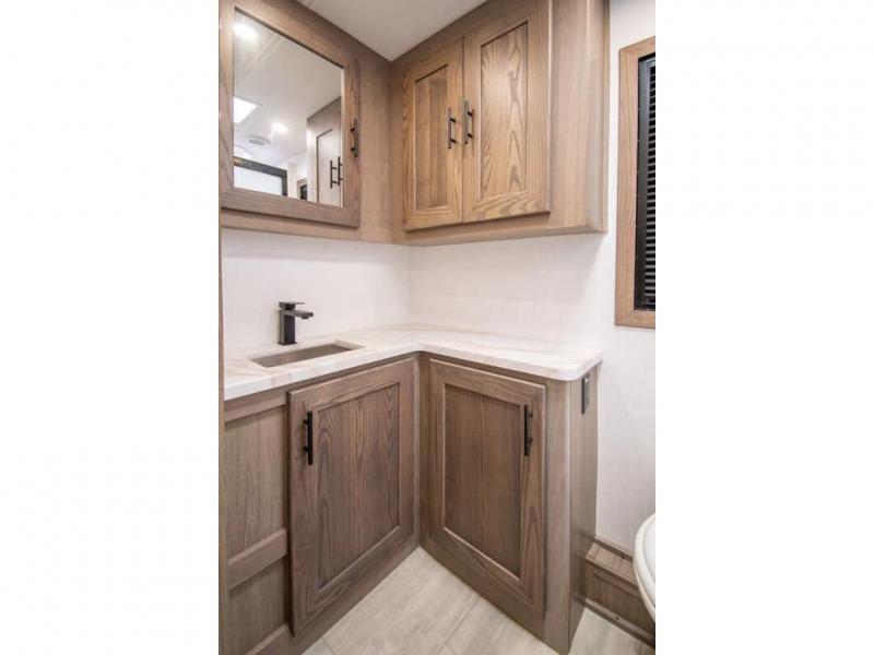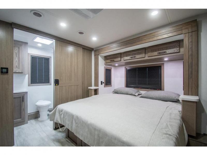 If you're looking for more space when you travel and a little more convenience, this coach may just be perfect for you! Not only will you enjoy a master bedroom with a full rear bath, but your guest will have the mid-coach half bath for easy use! A king bed slide out will provide a great night's rest each nigh, and you'll appreciate dual bedroom wardrobes to keep your clothes organized. There is also a wardrobe with stackable washer and dryer prep if you want the option to make laundry day easier. Head to the kitchen to prepare breakfast on the stainless steel three burner cooktop, or you can use the 30" residential over-the-range microwave. There is a wrap-around booth dinette where you can dine together plus 68" power theater seating across from the 32" 12V TV for easy viewing. This model also includes secure overhead storage above the cab where you can put luggage, lawn equipment, board games, and more!