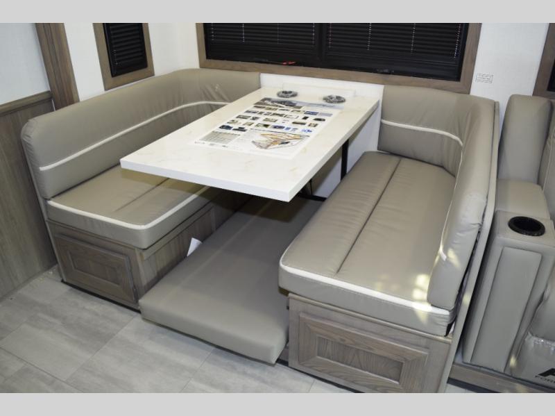 Rear living area with sofa and convertible dinette for relaxing and dining