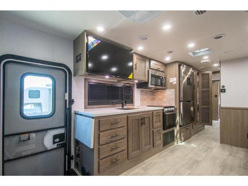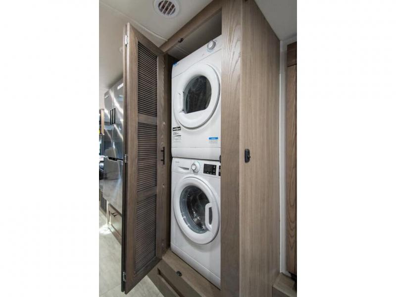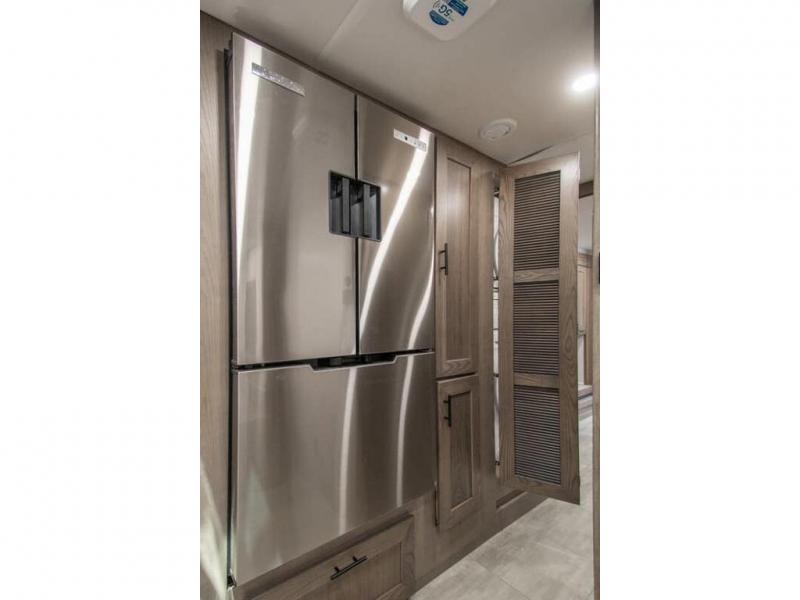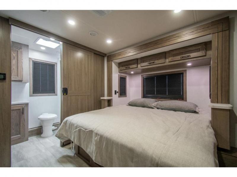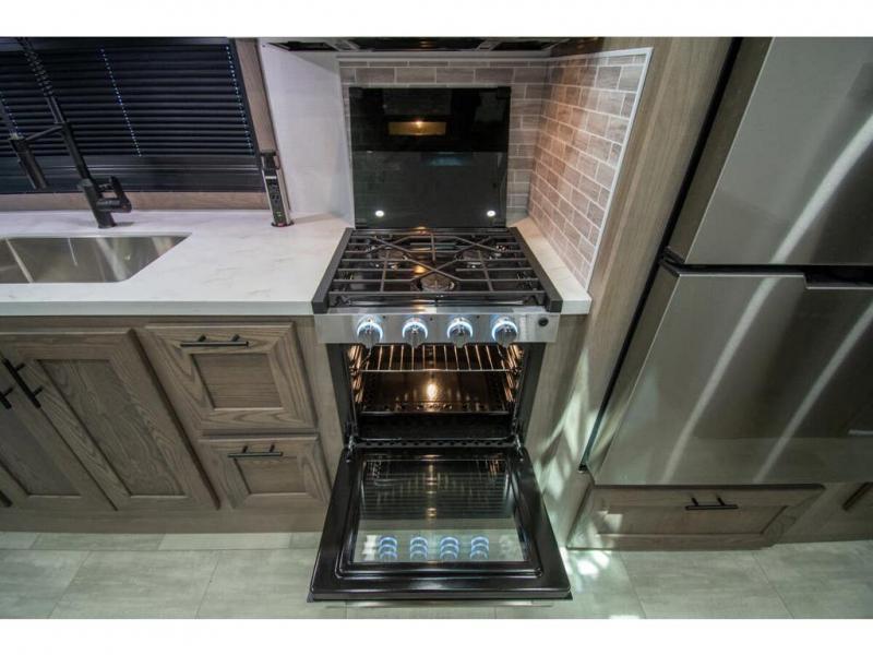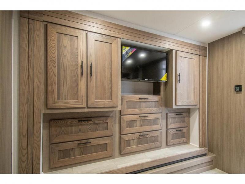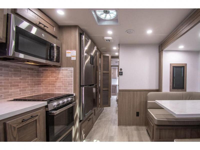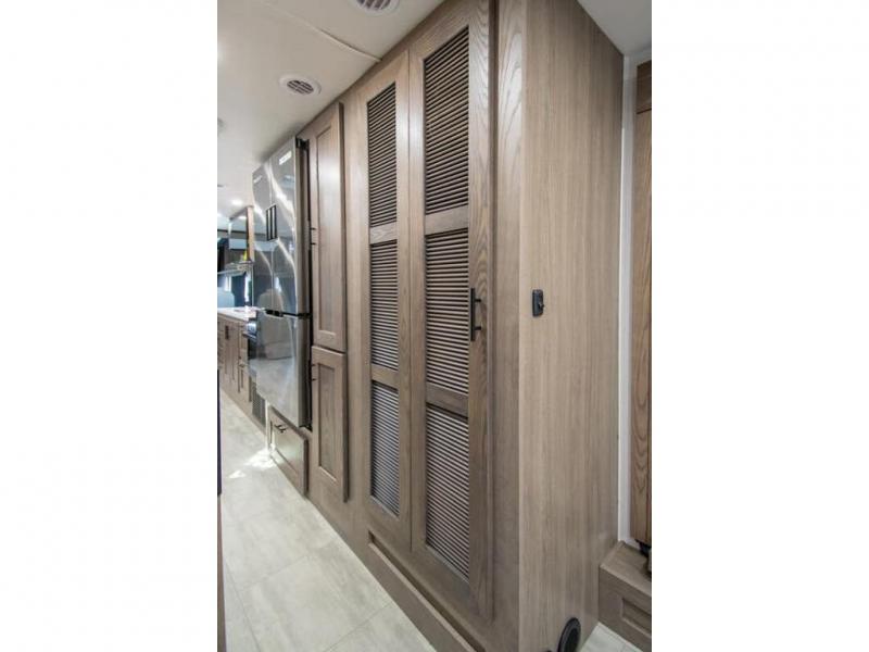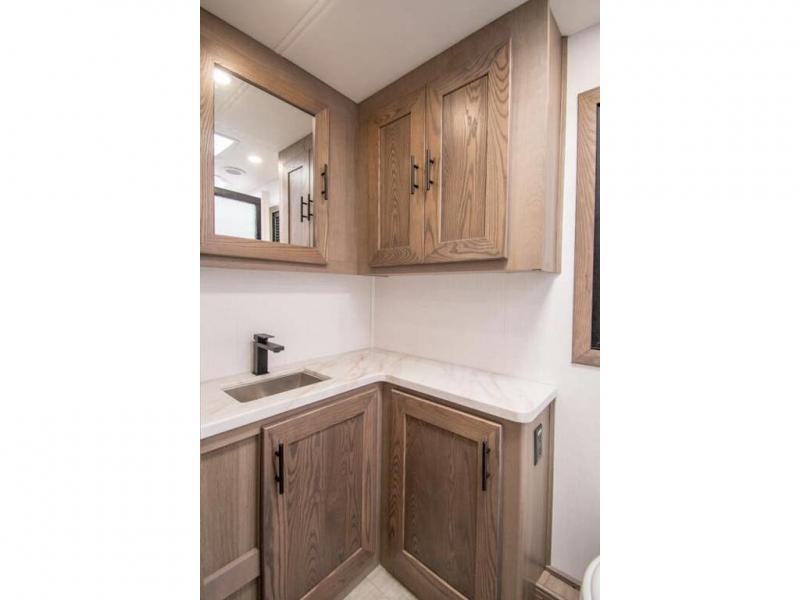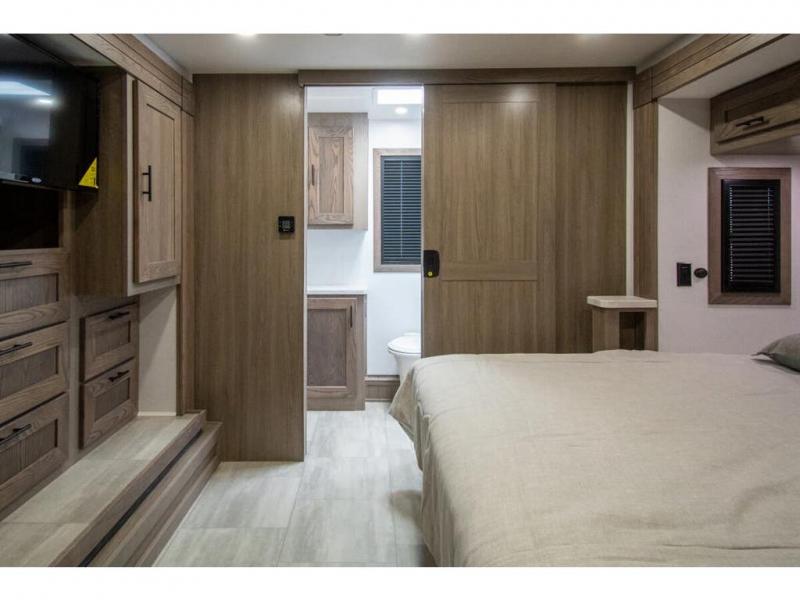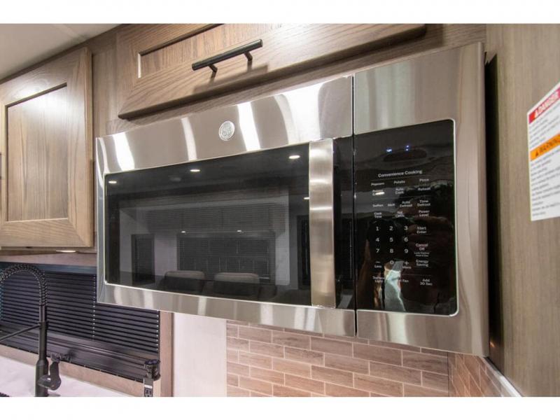 If you're looking for more space when you travel and a little more convenience, this coach may just be perfect for you! Not only will you enjoy a master bedroom with a full rear bath, but your guest will have the mid-coach half bath for easy use! A king bed slide out will provide a great night's rest each nigh, and you'll appreciate dual bedroom wardrobes to keep your clothes organized. There is also a wardrobe with stackable washer and dryer prep if you want the option to make laundry day easier. Head to the kitchen to prepare breakfast on the stainless steel three burner cooktop, or you can use the 30" residential over-the-range microwave. There is a wrap-around booth dinette where you can dine together plus 68" power theater seating across from the 32" 12V TV for easy viewing. This model also includes secure overhead storage above the cab where you can put luggage, lawn equipment, board games, and more!