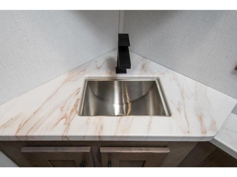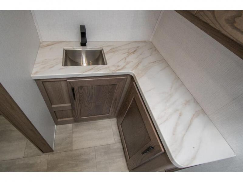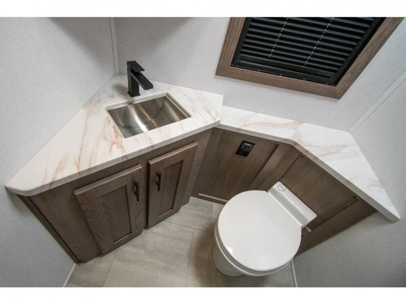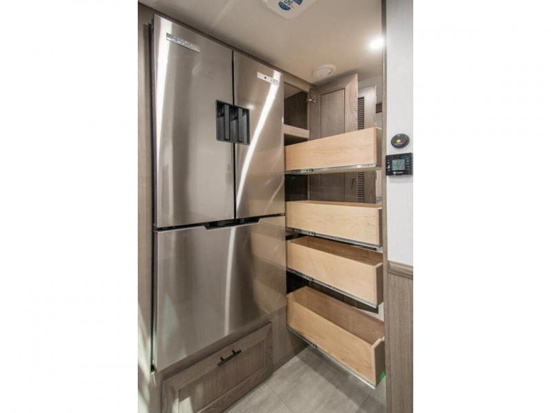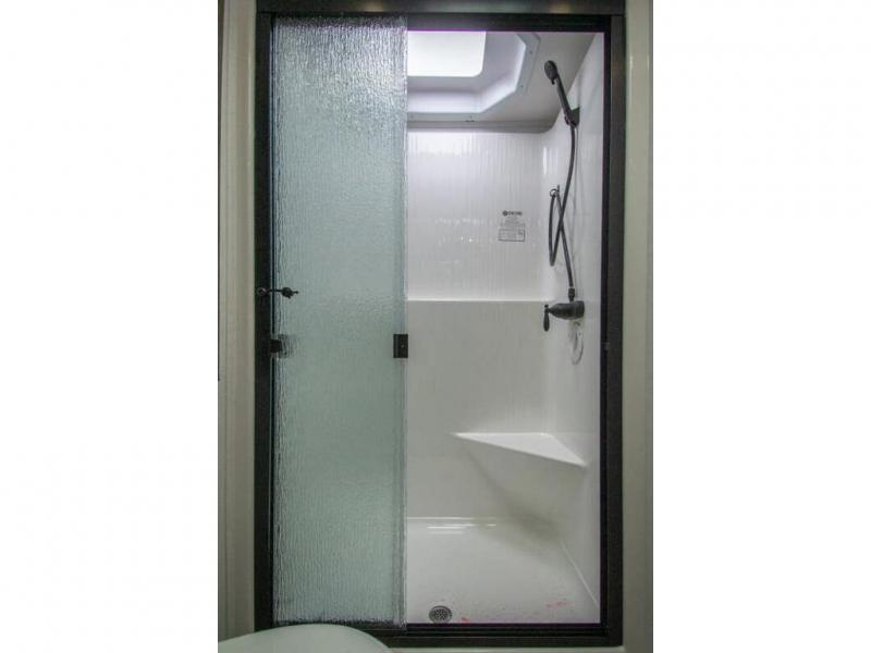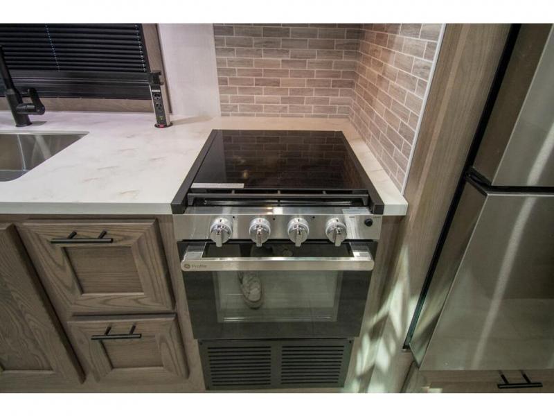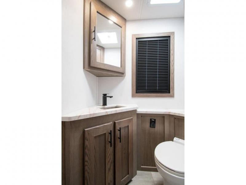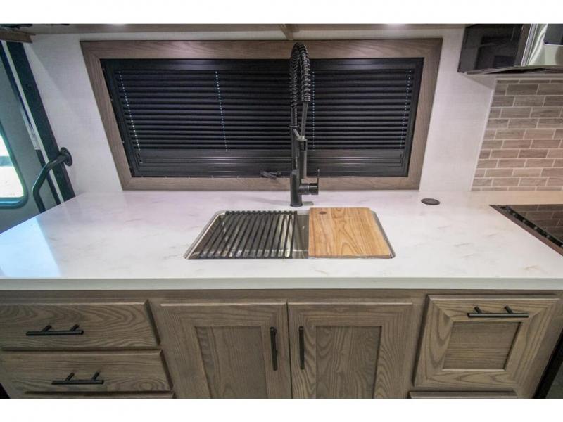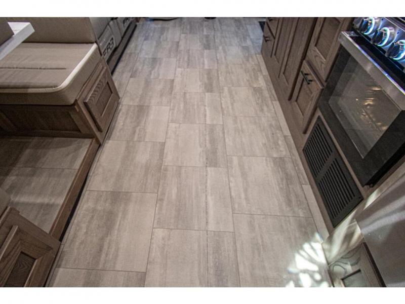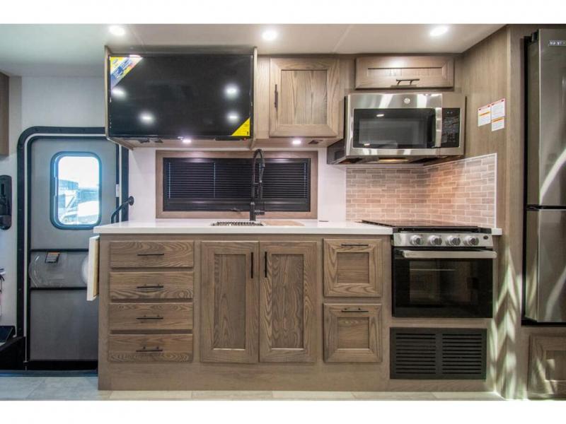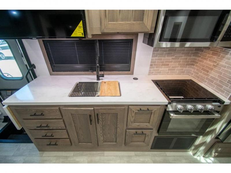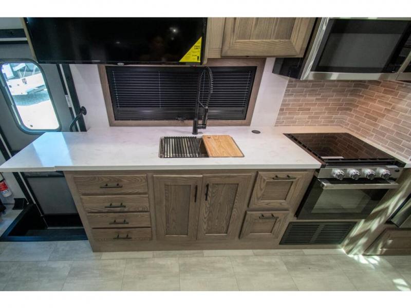 If you're looking for more space when you travel and a little more convenience, this coach may just be perfect for you! Not only will you enjoy a master bedroom with a full rear bath, but your guest will have the mid-coach half bath for easy use! A king bed slide out will provide a great night's rest each nigh, and you'll appreciate dual bedroom wardrobes to keep your clothes organized. There is also a wardrobe with stackable washer and dryer prep if you want the option to make laundry day easier. Head to the kitchen to prepare breakfast on the stainless steel three burner cooktop, or you can use the 30" residential over-the-range microwave. There is a wrap-around booth dinette where you can dine together plus 68" power theater seating across from the 32" 12V TV for easy viewing. This model also includes secure overhead storage above the cab where you can put luggage, lawn equipment, board games, and more!