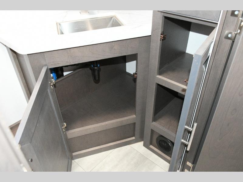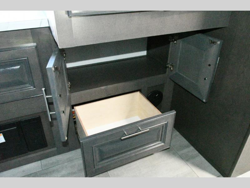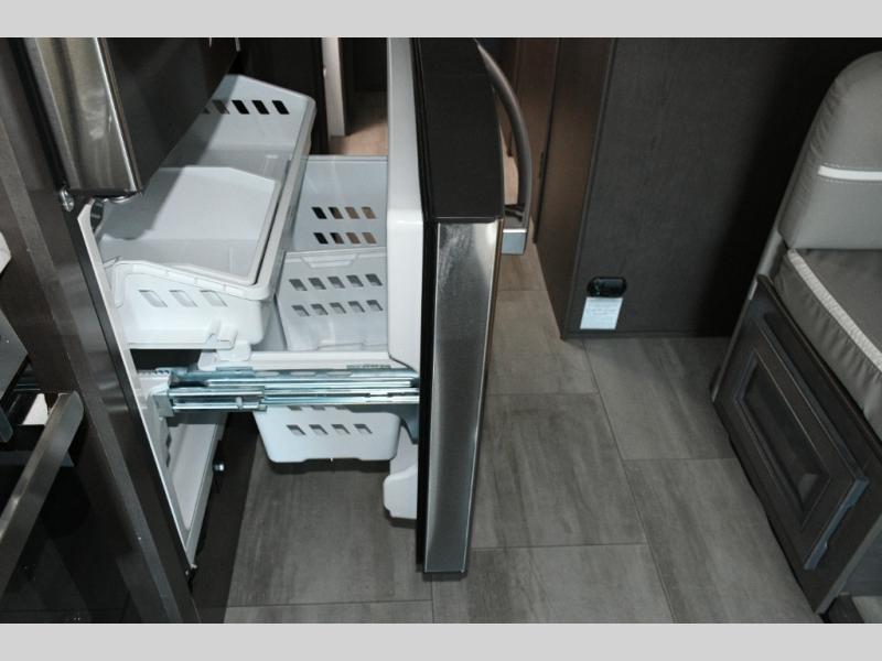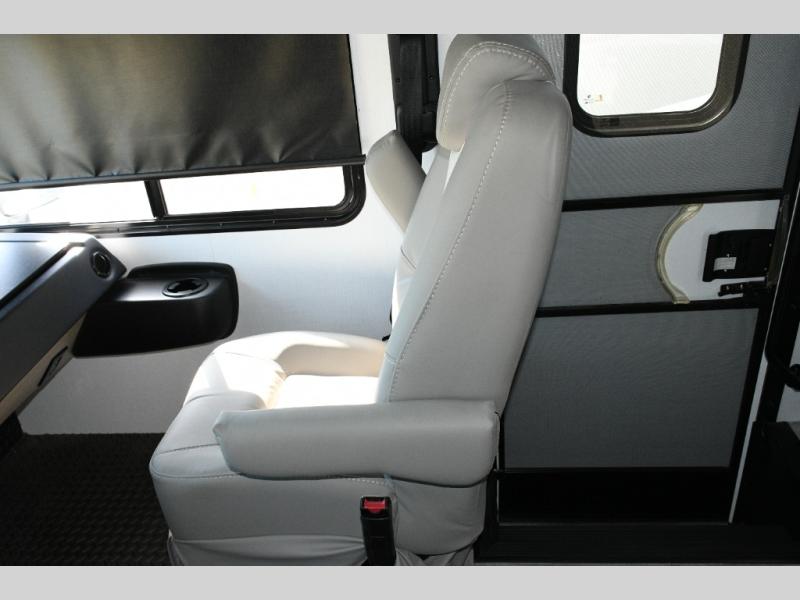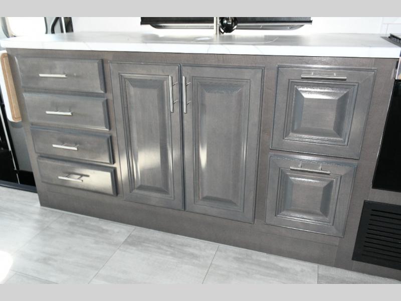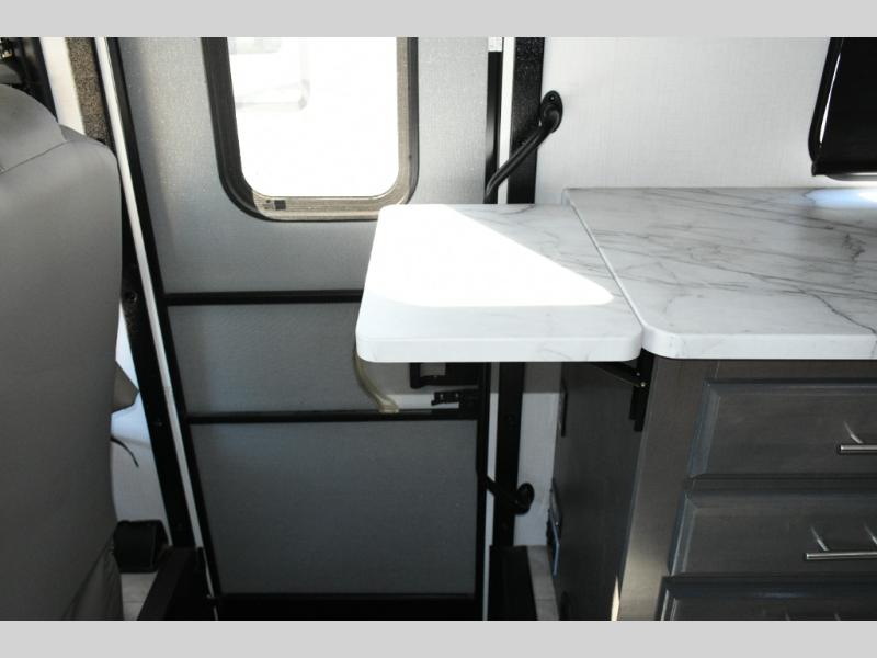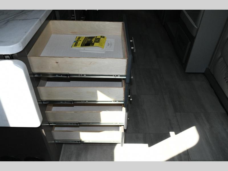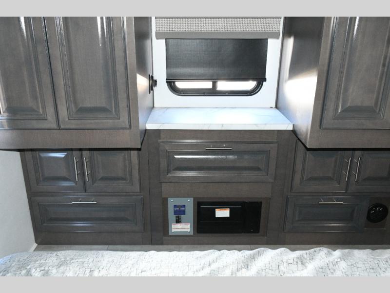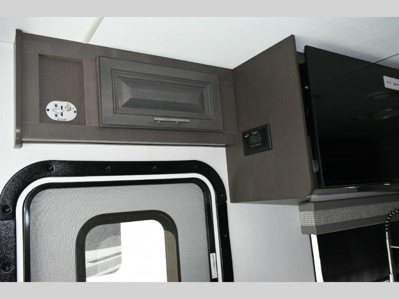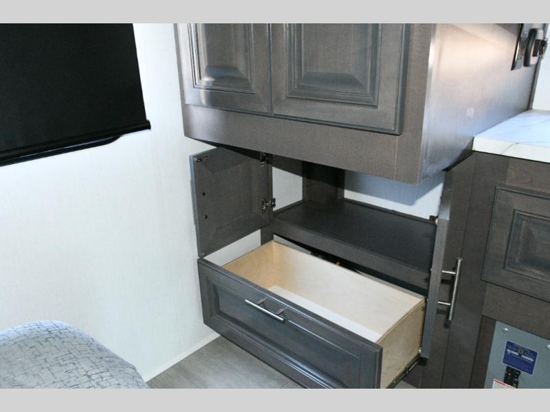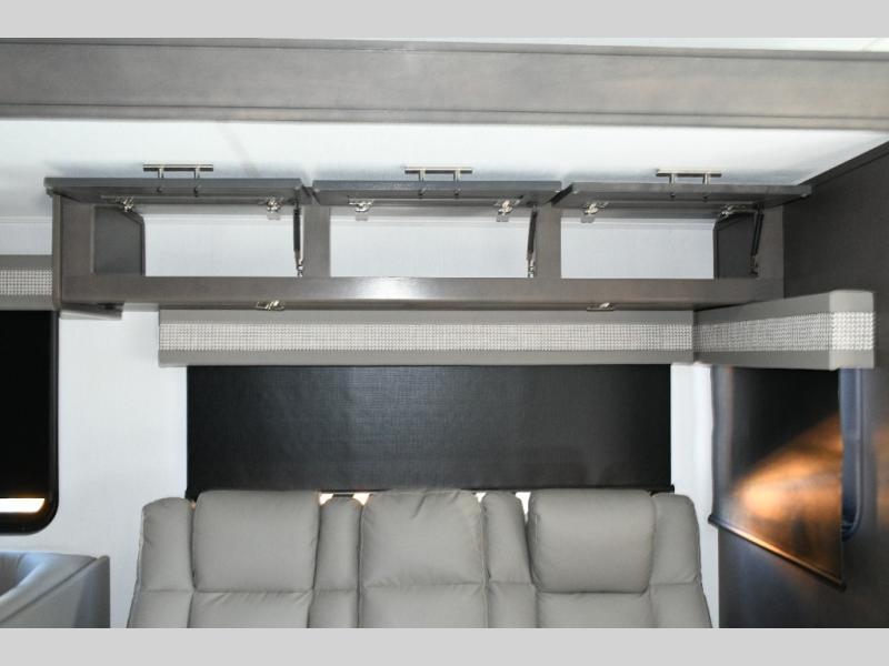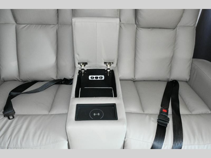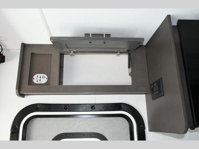 The galley kitchen is equipped for every meal, featuring a three-burner cooktop, large 18 cu. ft. residential refrigerator, microwave, and pantry with shelves. Outside, enjoy entertainment on the exterior system, or take advantage of the solar panel and controller to stay powered while off-grid. The passenger workstation allows you to work or plan your next adventure while on the road.