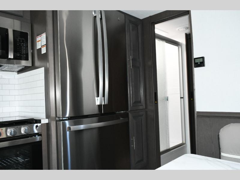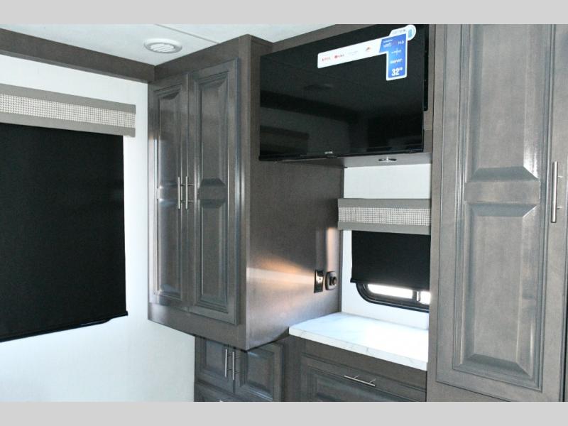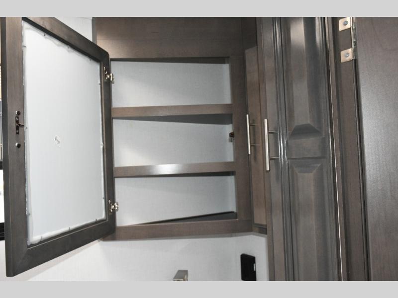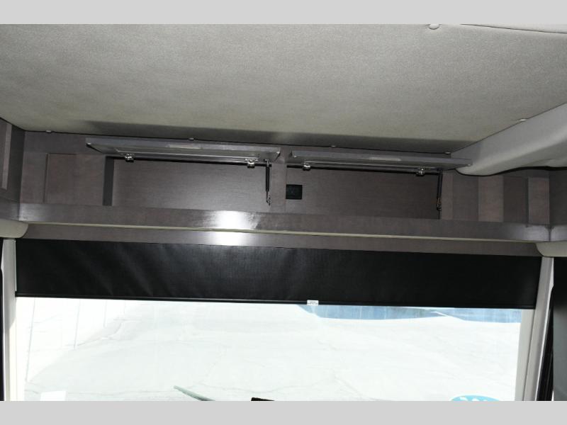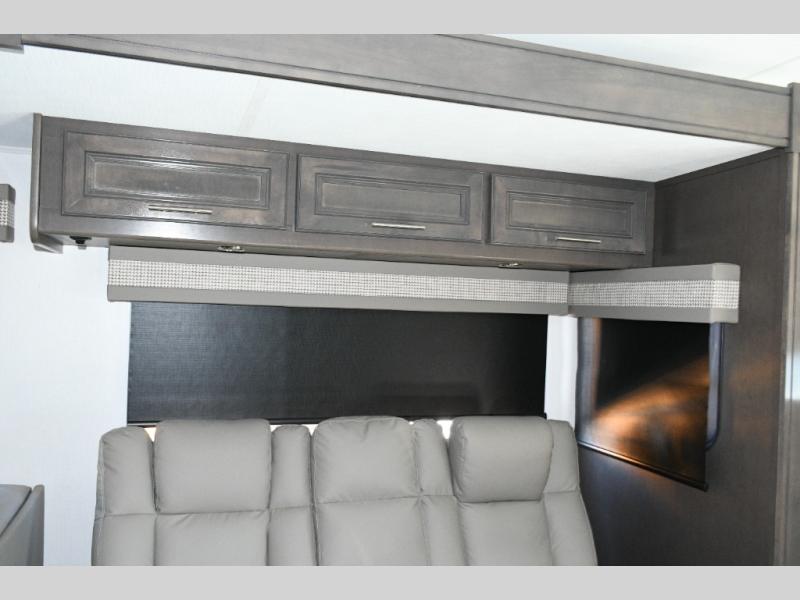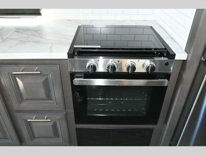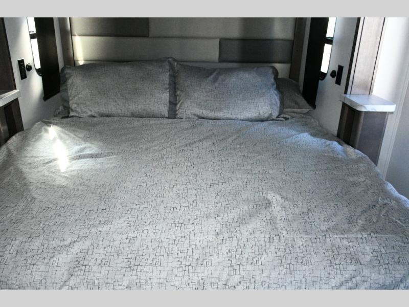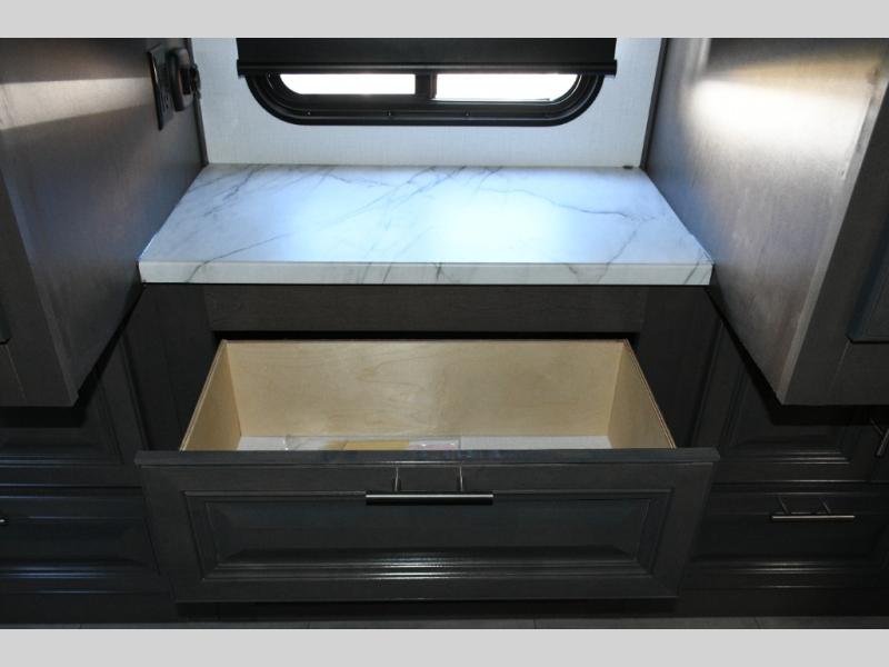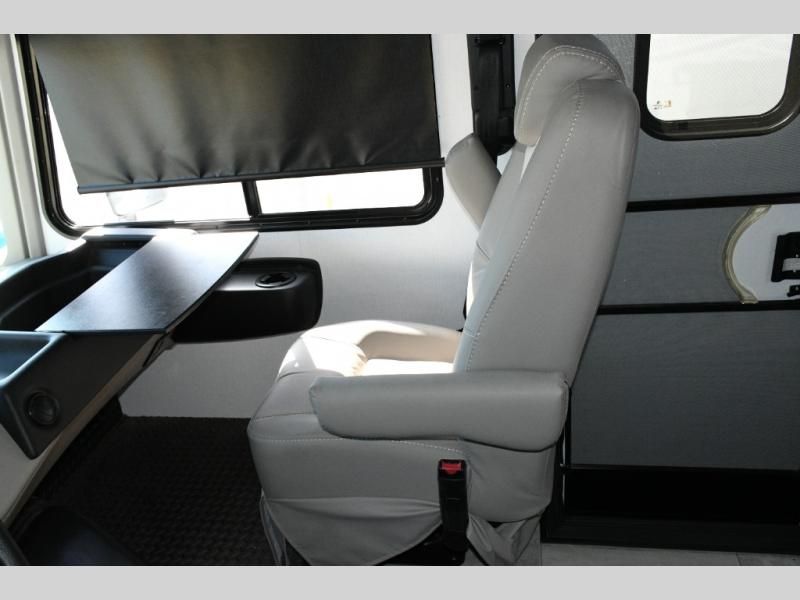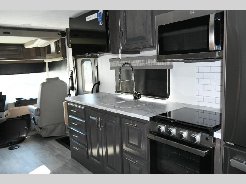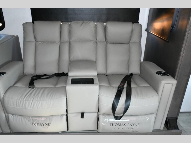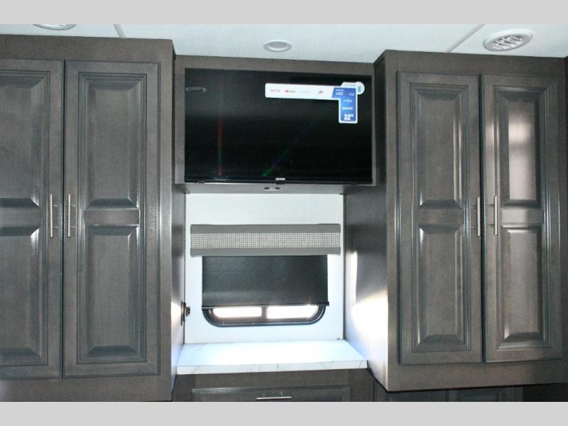 The galley kitchen is equipped for every meal, featuring a three-burner cooktop, large 18 cu. ft. residential refrigerator, microwave, and pantry with shelves. Outside, enjoy entertainment on the exterior system, or take advantage of the solar panel and controller to stay powered while off-grid. The passenger workstation allows you to work or plan your next adventure while on the road.