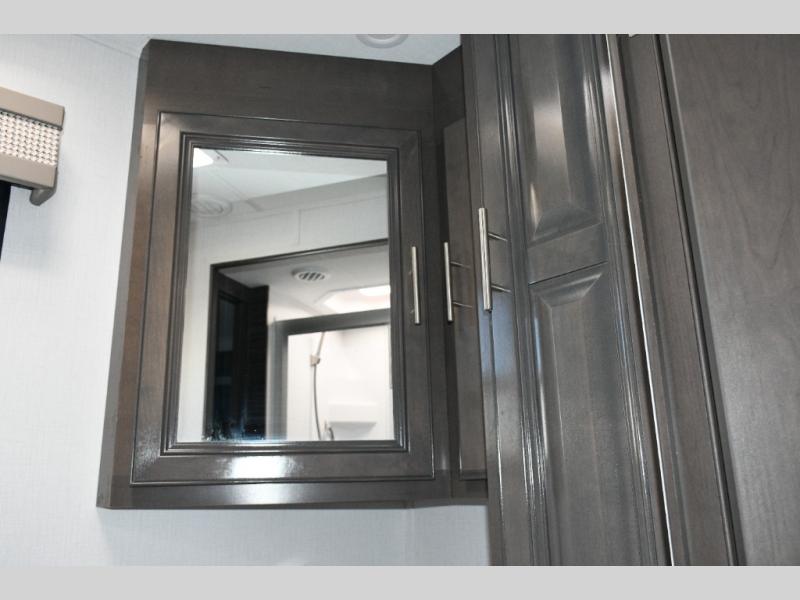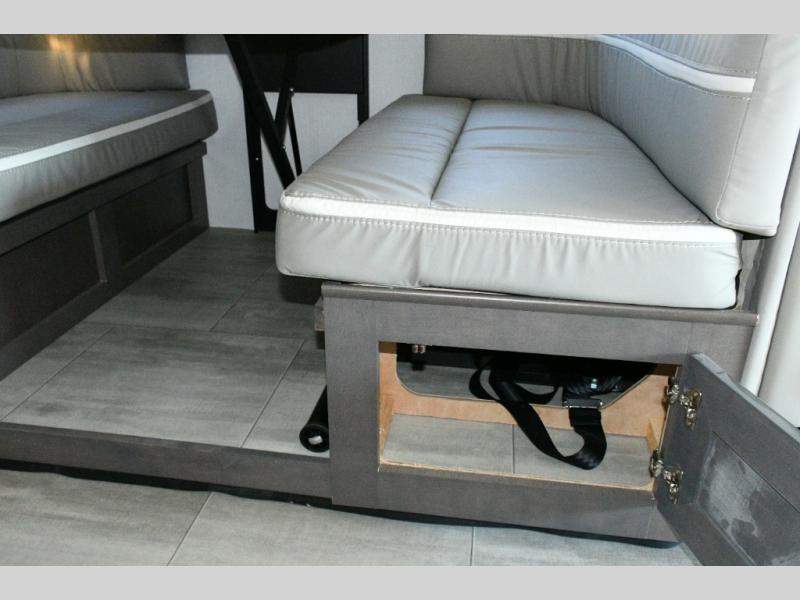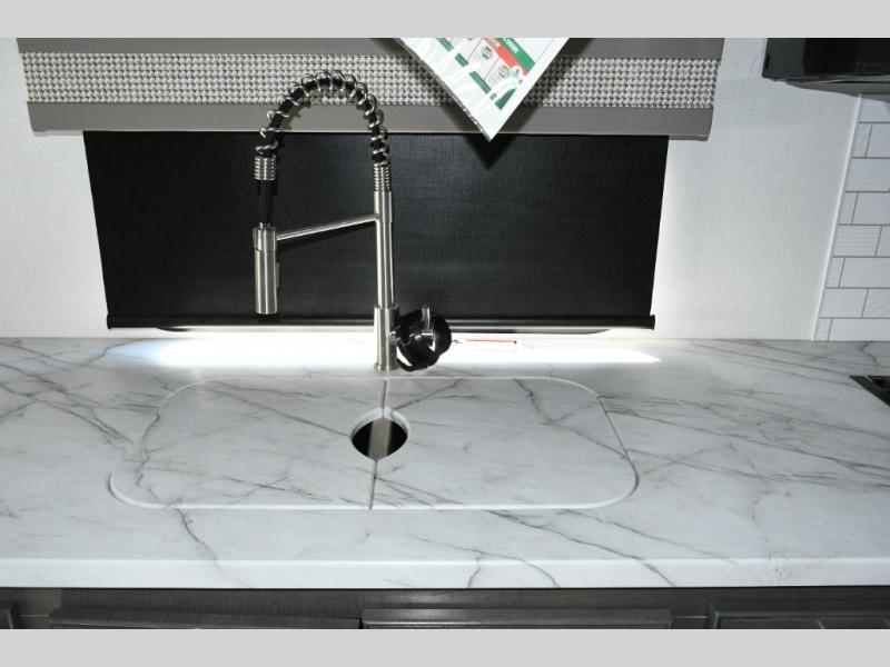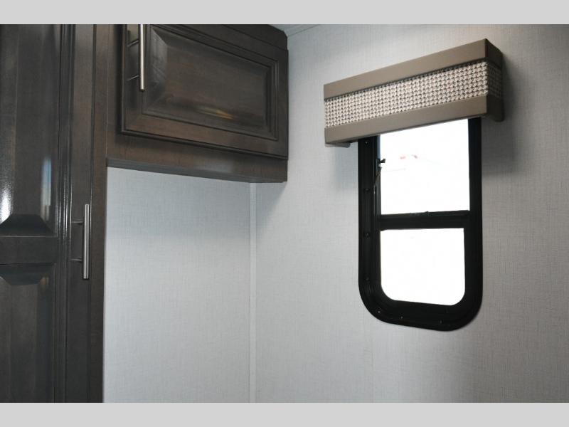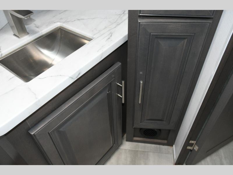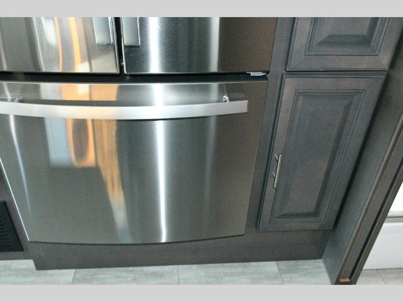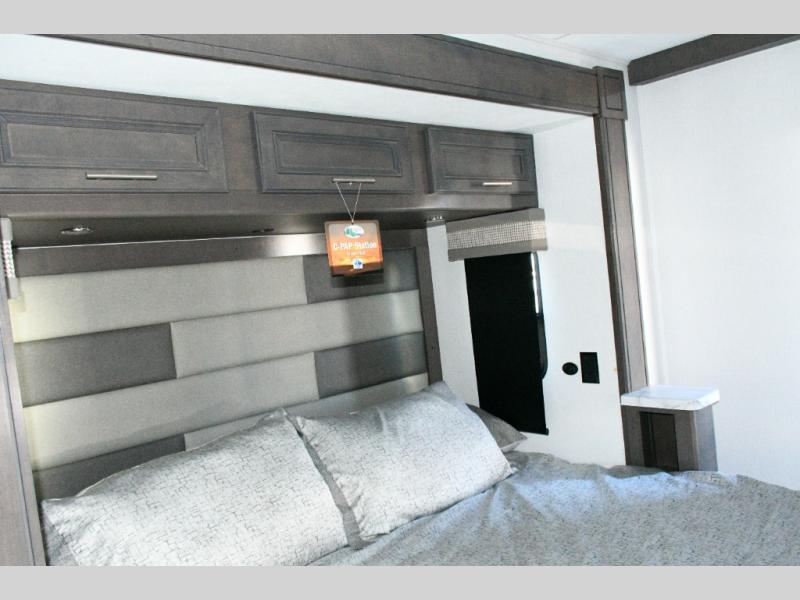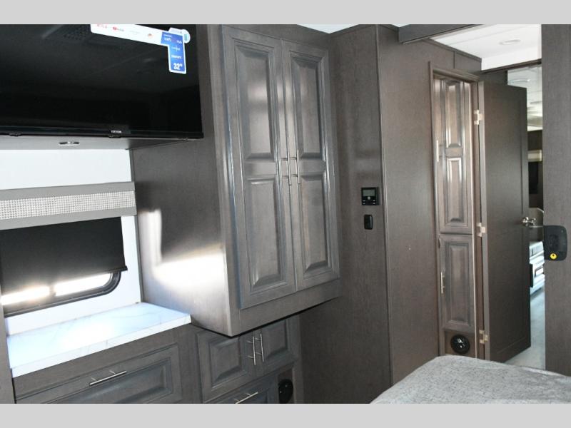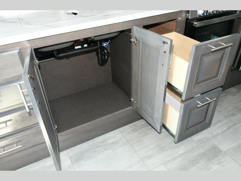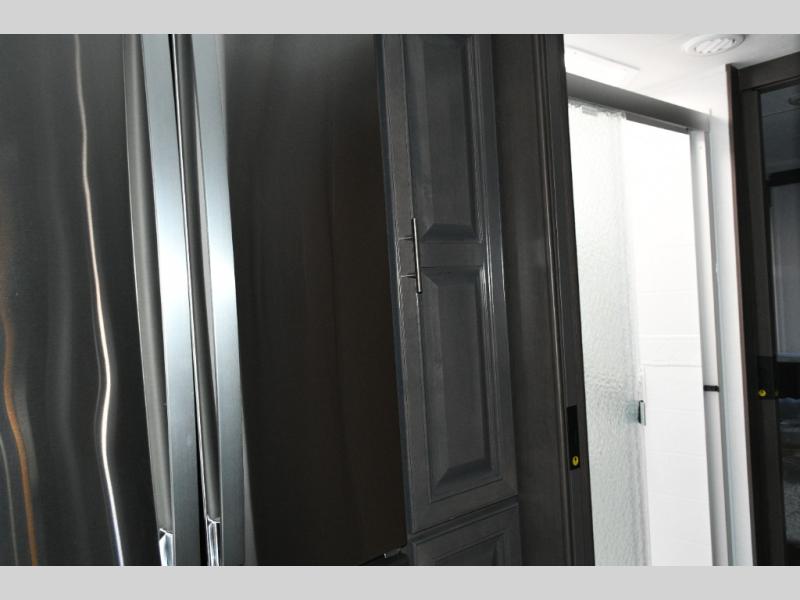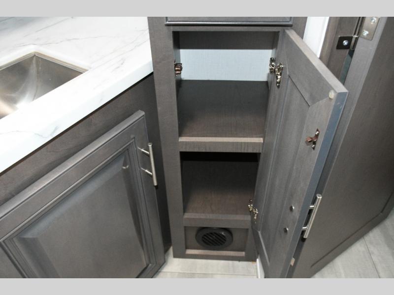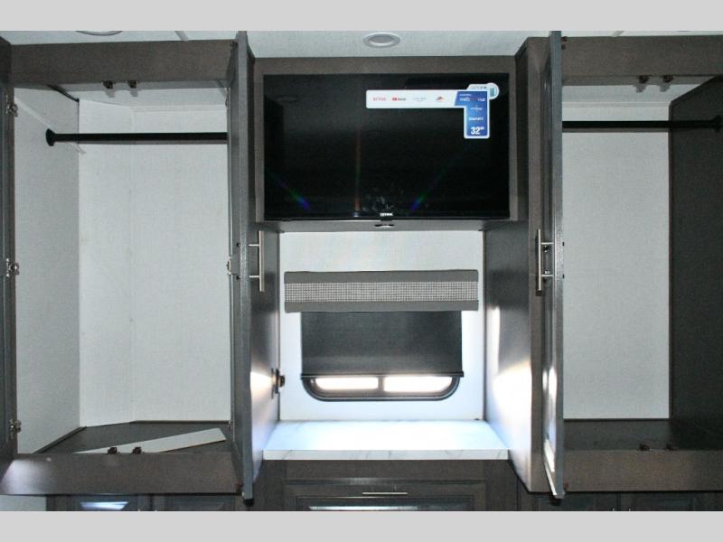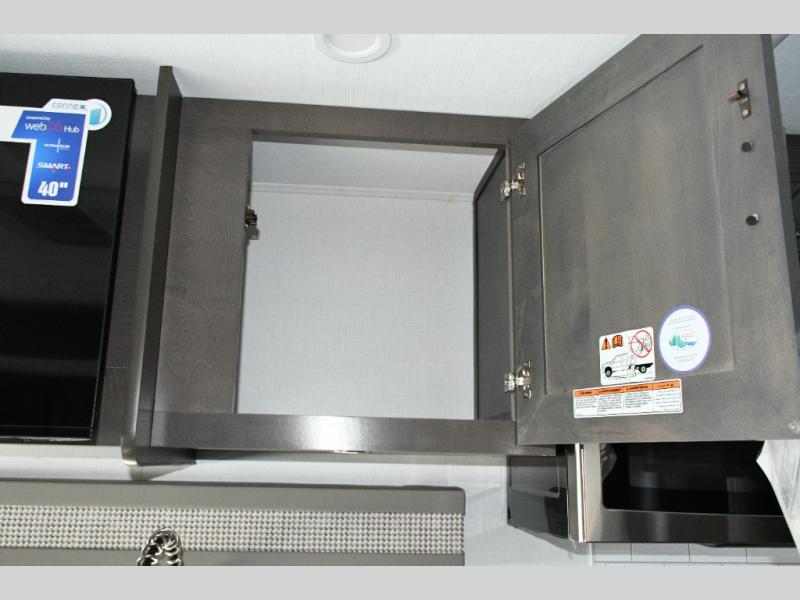 The galley kitchen is equipped for every meal, featuring a three-burner cooktop, large 18 cu. ft. residential refrigerator, microwave, and pantry with shelves. Outside, enjoy entertainment on the exterior system, or take advantage of the solar panel and controller to stay powered while off-grid. The passenger workstation allows you to work or plan your next adventure while on the road.