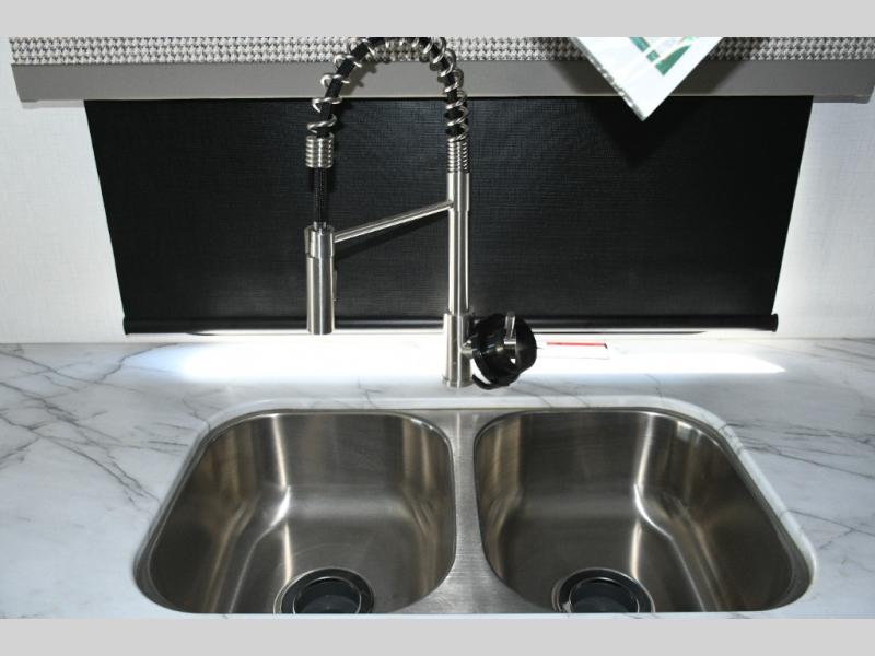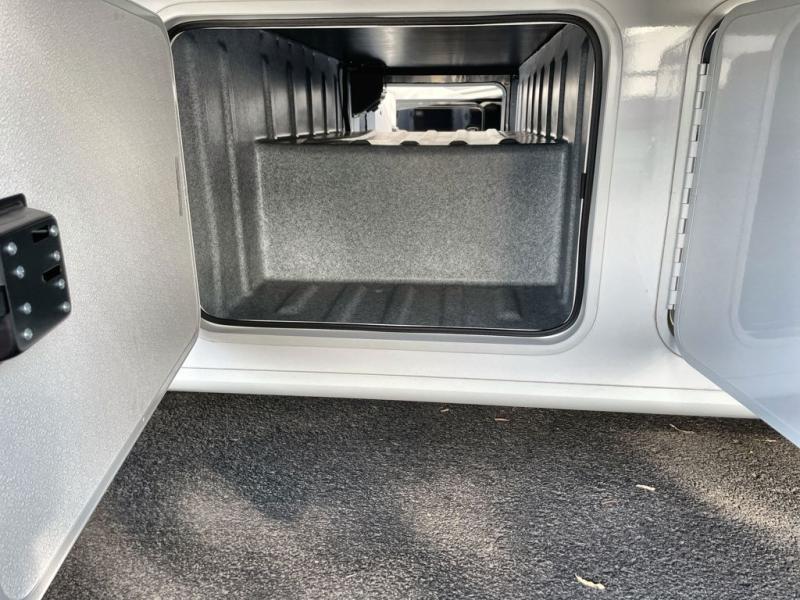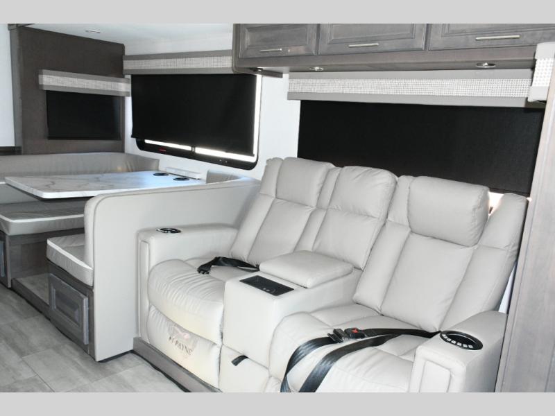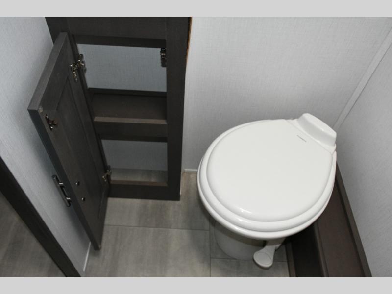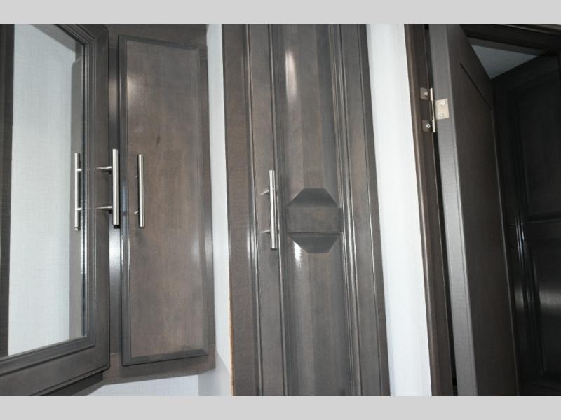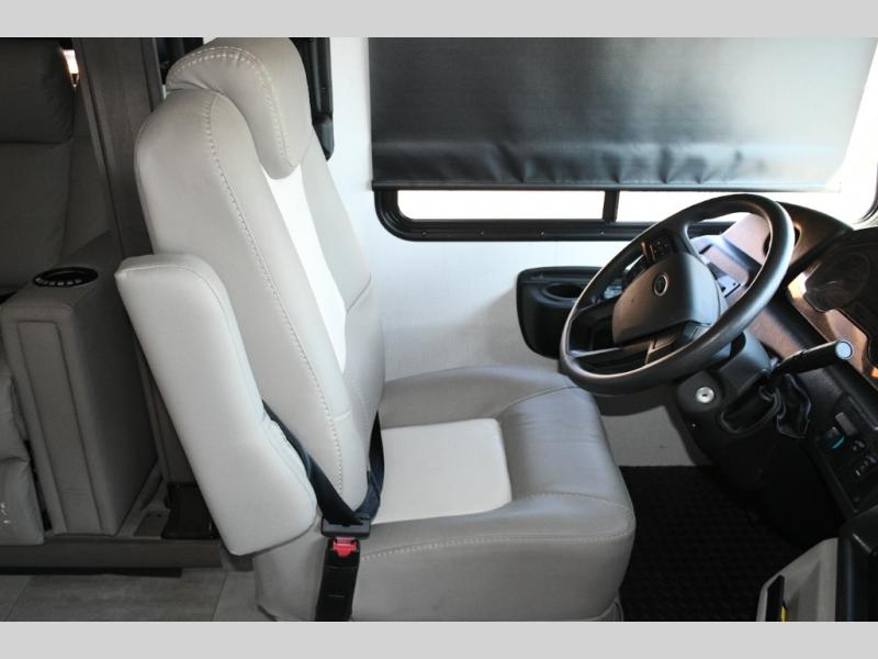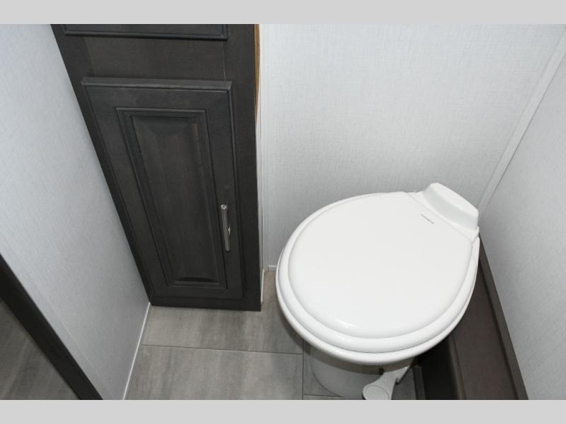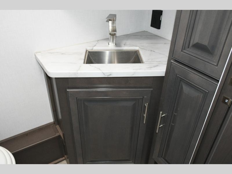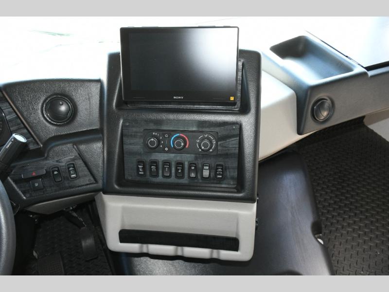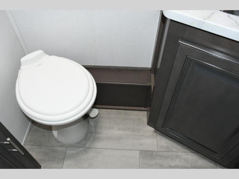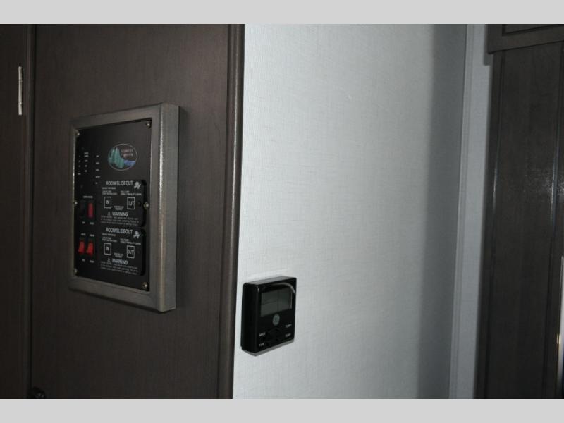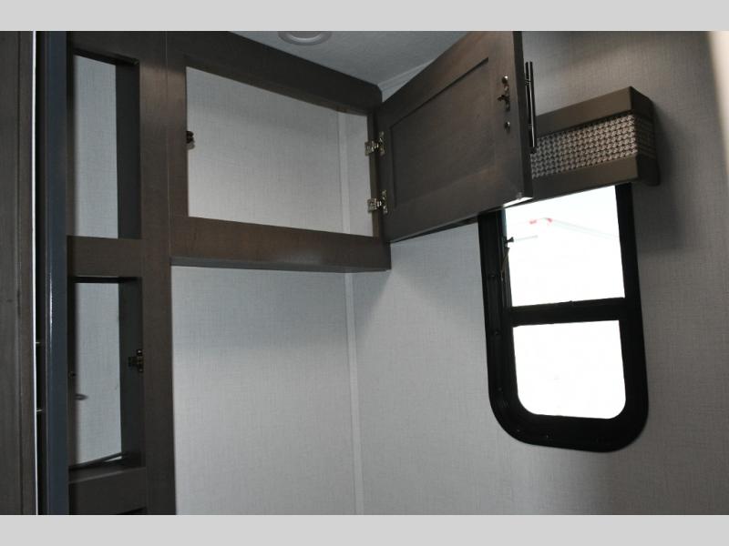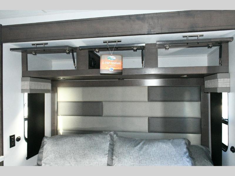 The galley kitchen is equipped for every meal, featuring a three-burner cooktop, large 18 cu. ft. residential refrigerator, microwave, and pantry with shelves. Outside, enjoy entertainment on the exterior system, or take advantage of the solar panel and controller to stay powered while off-grid. The passenger workstation allows you to work or plan your next adventure while on the road.