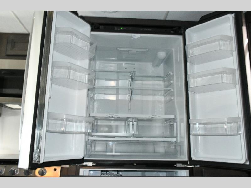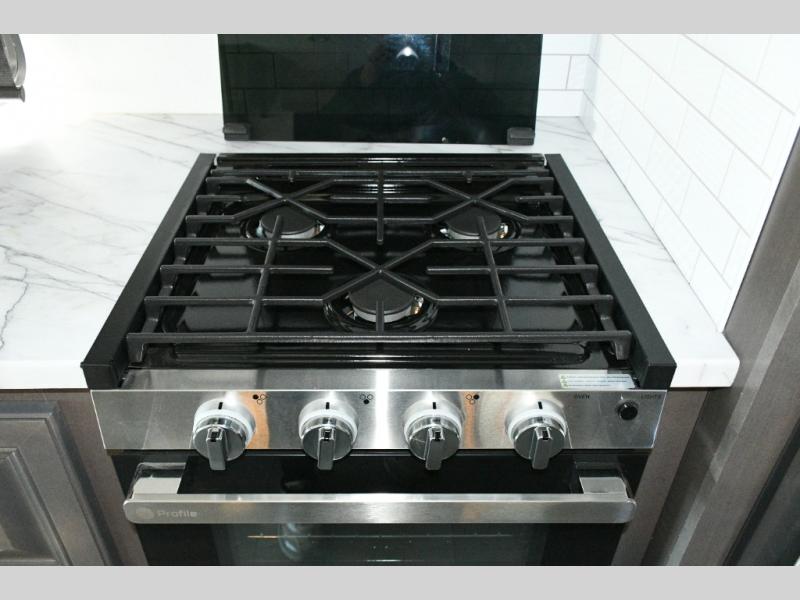 The galley kitchen is equipped for every meal, featuring a three-burner cooktop, large 18 cu. ft. residential refrigerator, microwave, and pantry with shelves.