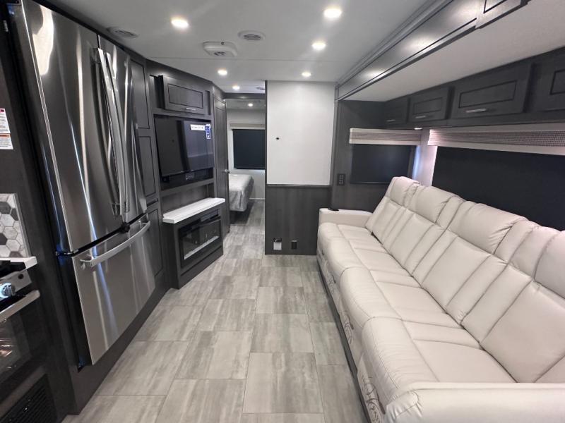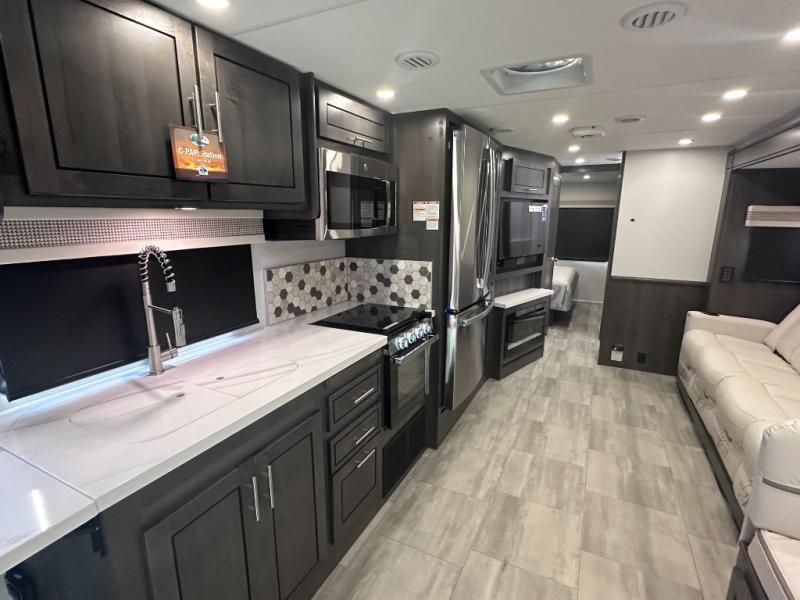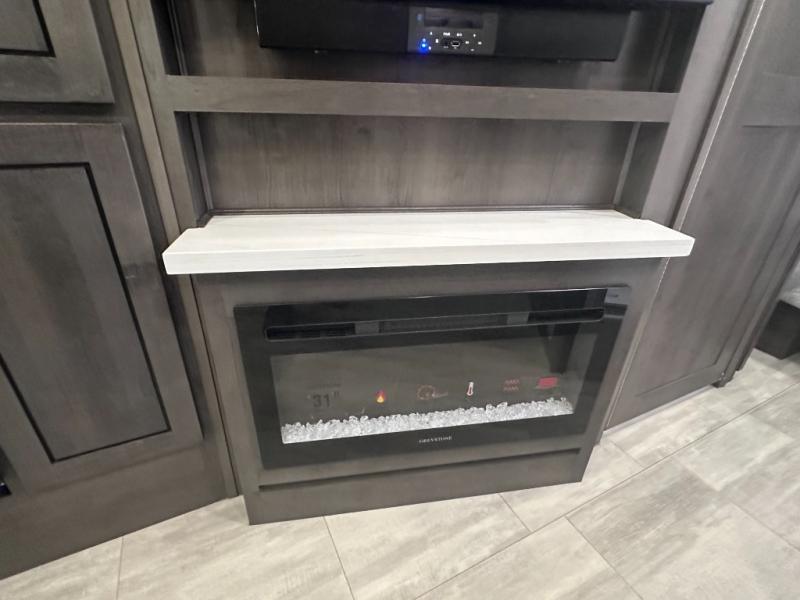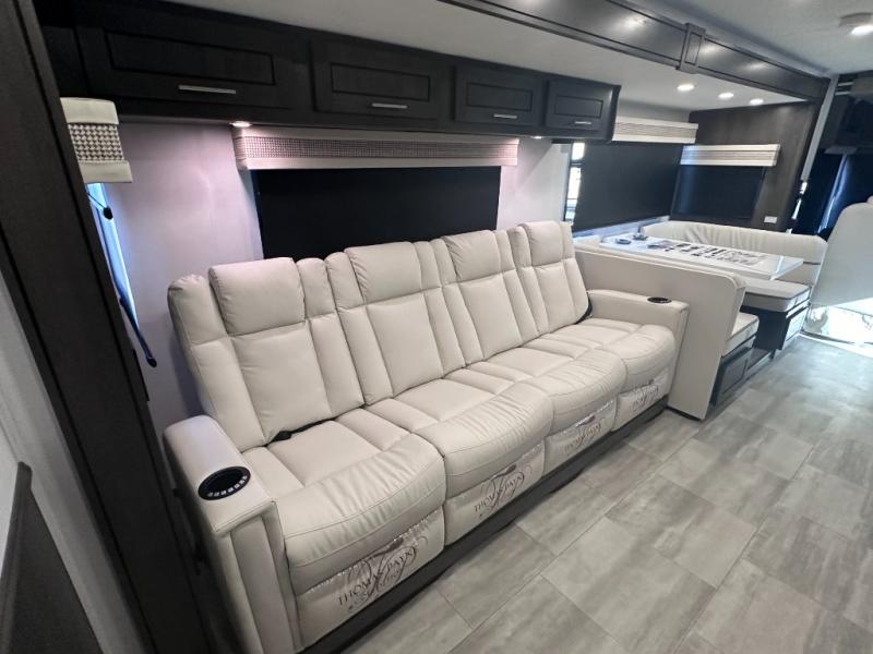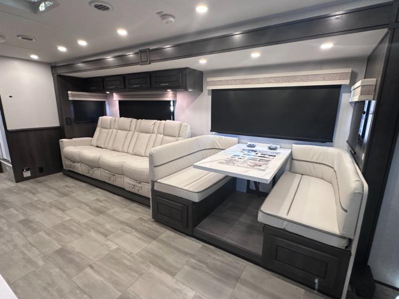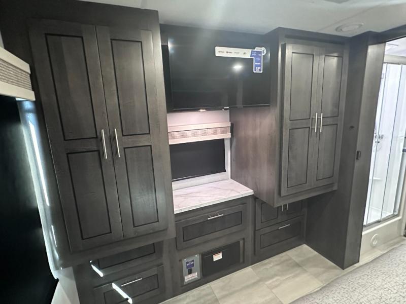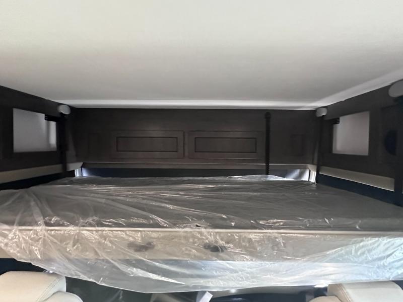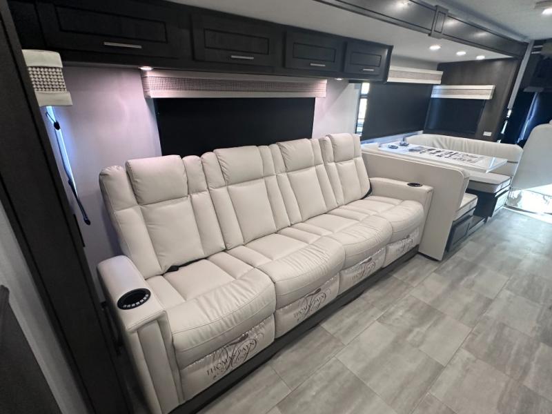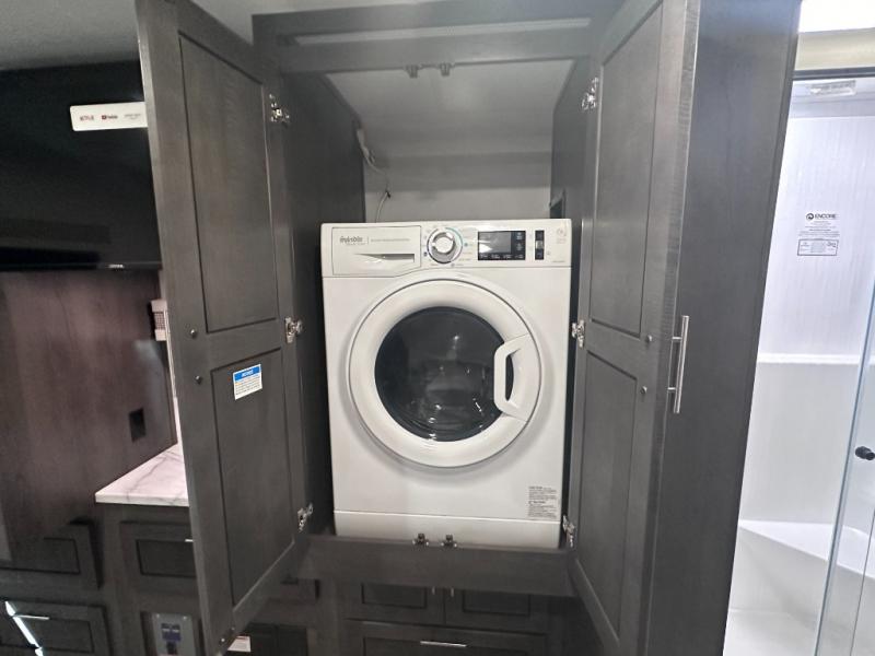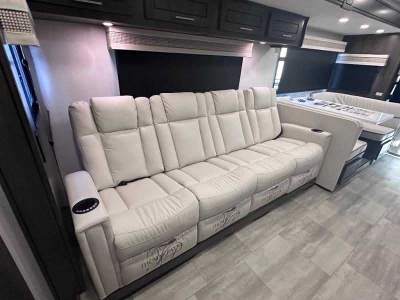 You will love the spacious living entertainment in this motorhome! There is a Thomas Payne 4-person theater seating that reclines with adjustable headrests, heat, massage and has pop-up 110V outlets. There is also a 5,000 BTU fireplace with a 40" LED TV to watch your favorite movies in true comfort. The kitchen has everything you need to prepare your best home cooked meals including a brush nickel designer faucet with a pull out spray wand for easy clean up, and you can enjoy all of your meals at the Dream Dinette. You will appreciate having your own private retreat with the rear bedroom which has a 72" x 80" king bed slide across from a dresser with a 32" LED TV, a wardrobe on one side, and another wardrobe on the other with an optional combo washer and dryer. There is also a power front overhead bunk for more sleeping space!