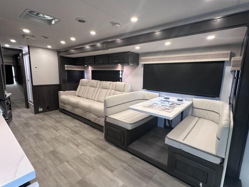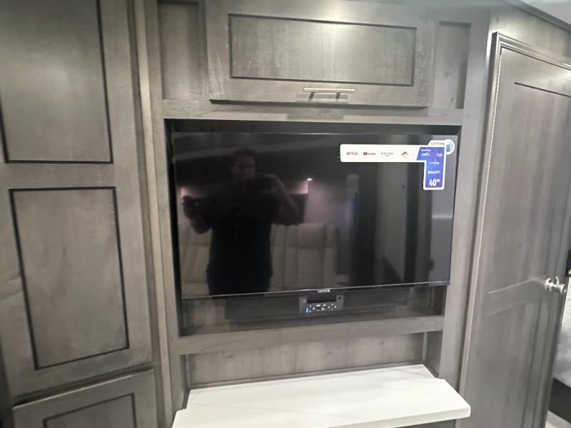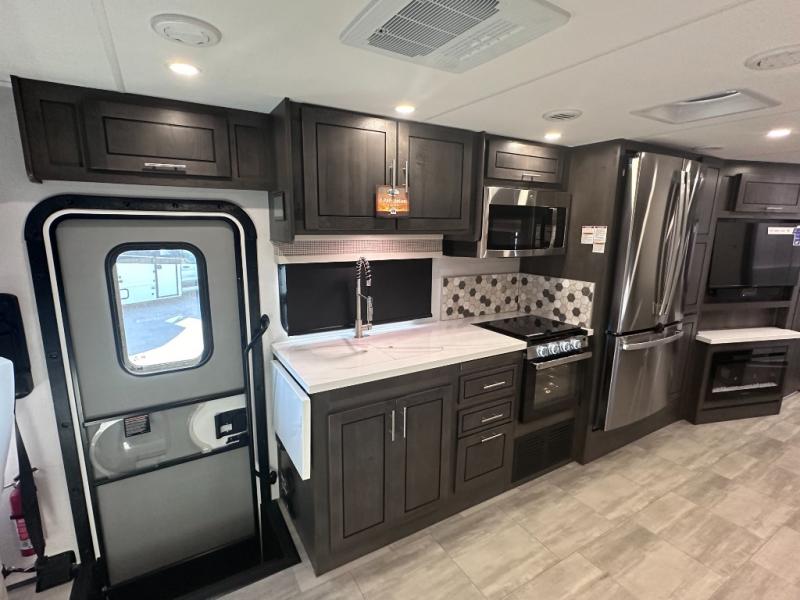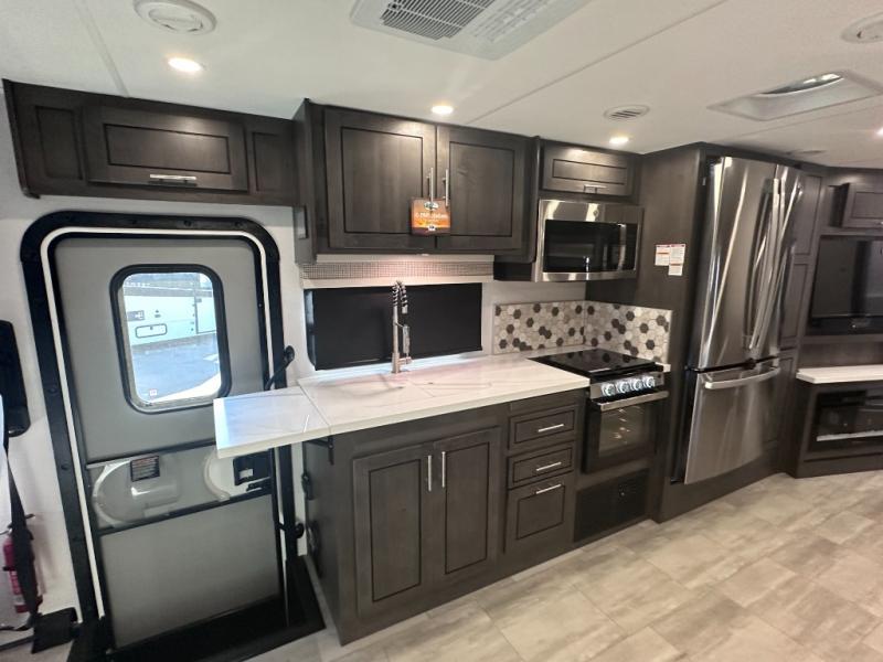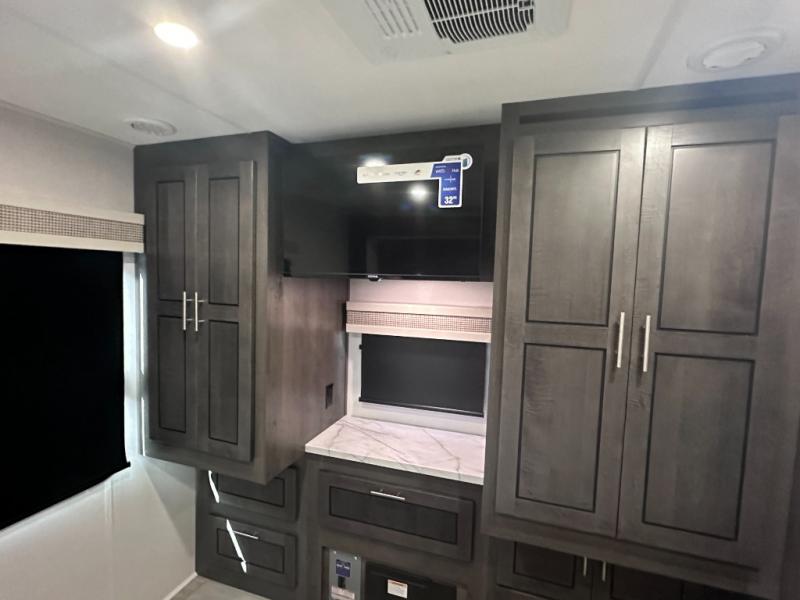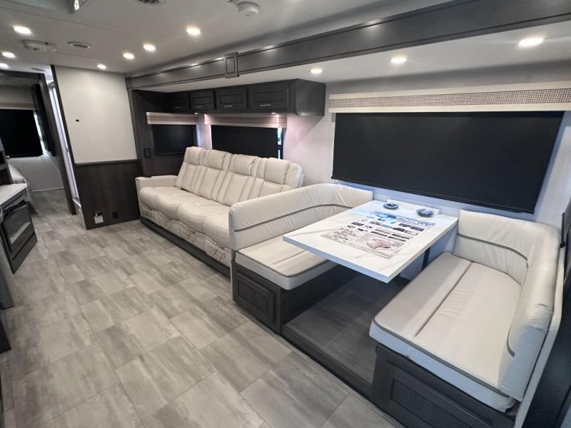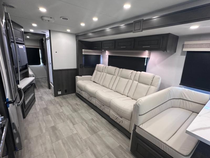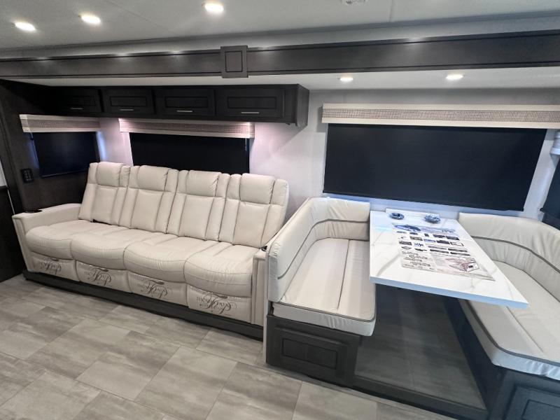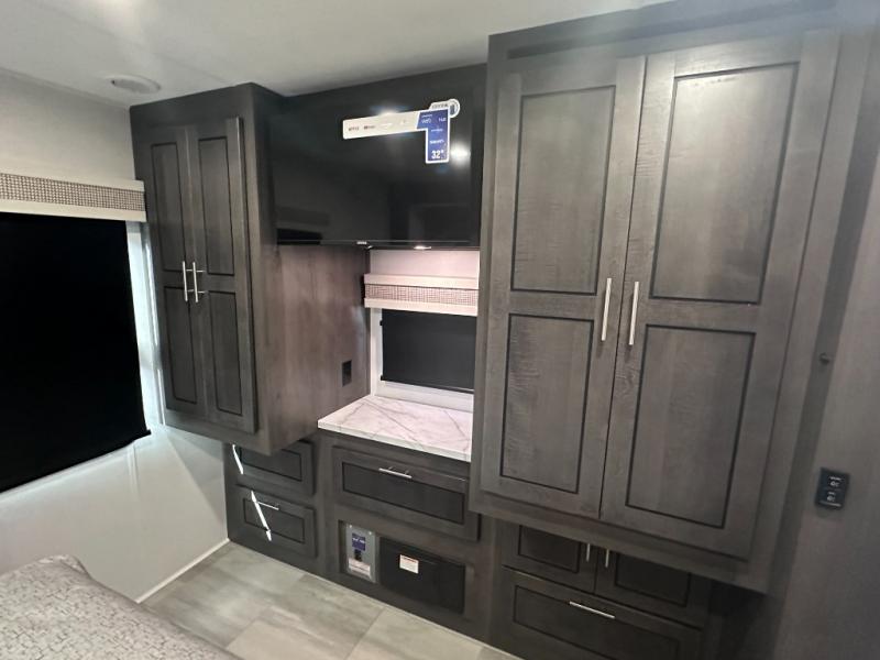 You will love the spacious living entertainment in this motorhome! There is a Thomas Payne 4-person theater seating that reclines with adjustable headrests, heat, massage and has pop-up 110V outlets. There is also a 5,000 BTU fireplace with a 40" LED TV to watch your favorite movies in true comfort. The kitchen has everything you need to prepare your best home cooked meals including a brush nickel designer faucet with a pull out spray wand for easy clean up, and you can enjoy all of your meals at the Dream Dinette. You will appreciate having your own private retreat with the rear bedroom which has a 72" x 80" king bed slide across from a dresser with a 32" LED TV, a wardrobe on one side, and another wardrobe on the other with an optional combo washer and dryer. There is also a power front overhead bunk for more sleeping space!