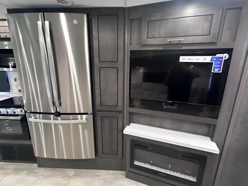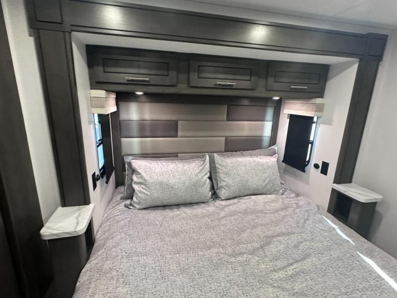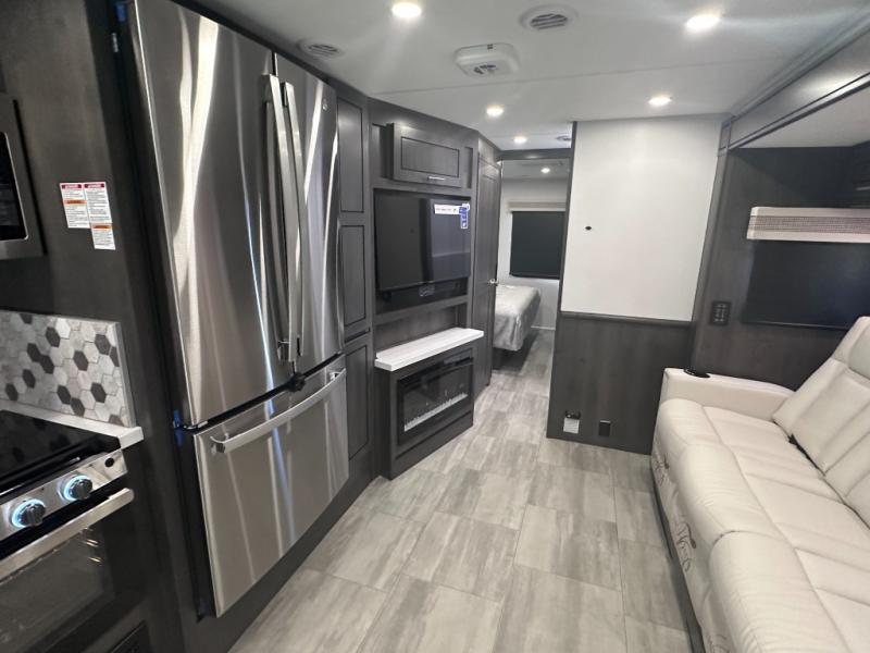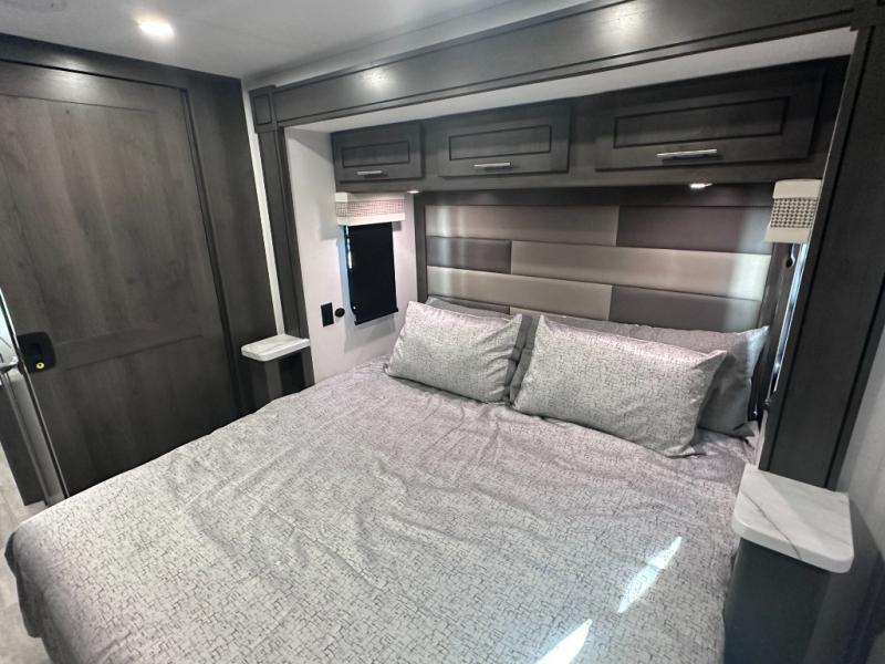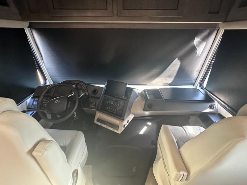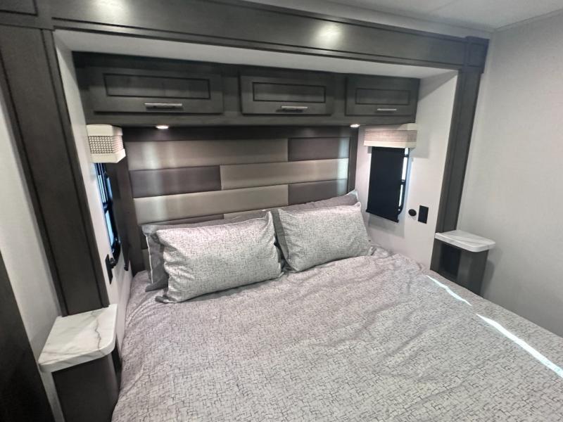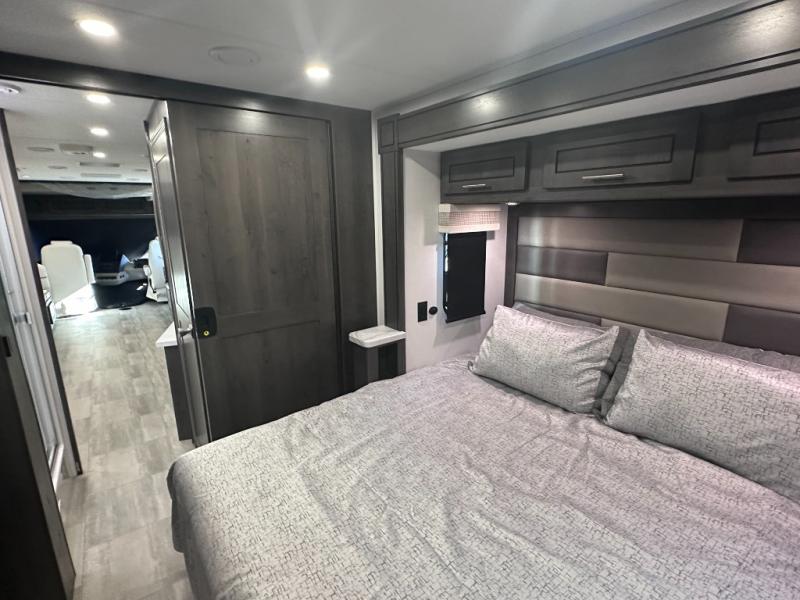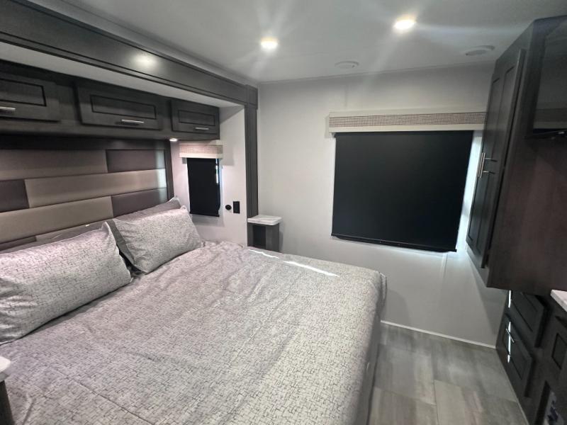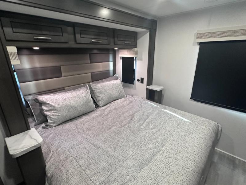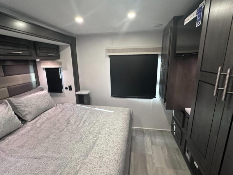 You will love the spacious living entertainment in this motorhome! There is a Thomas Payne 4-person theater seating that reclines with adjustable headrests, heat, massage and has pop-up 110V outlets. There is also a 5,000 BTU fireplace with a 40" LED TV to watch your favorite movies in true comfort. The kitchen has everything you need to prepare your best home cooked meals including a brush nickel designer faucet with a pull out spray wand for easy clean up, and you can enjoy all of your meals at the Dream Dinette. You will appreciate having your own private retreat with the rear bedroom which has a 72" x 80" king bed slide across from a dresser with a 32" LED TV, a wardrobe on one side, and another wardrobe on the other with an optional combo washer and dryer. There is also a power front overhead bunk for more sleeping space!