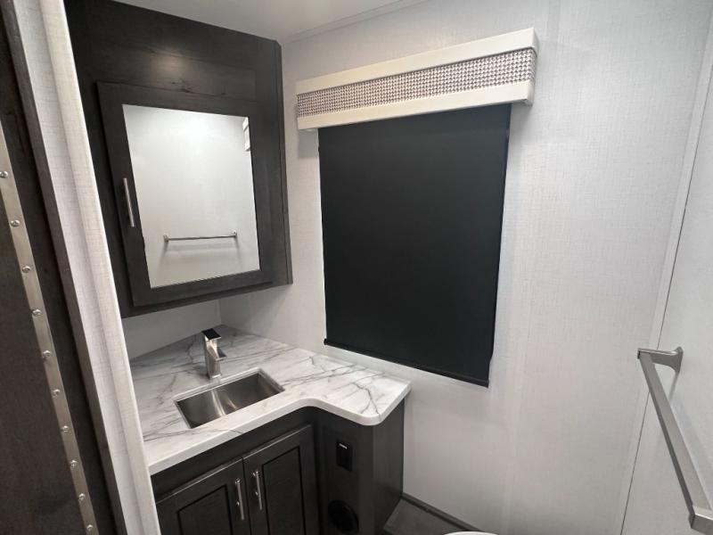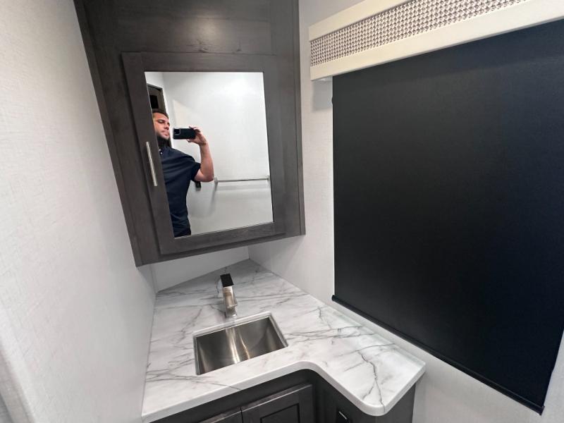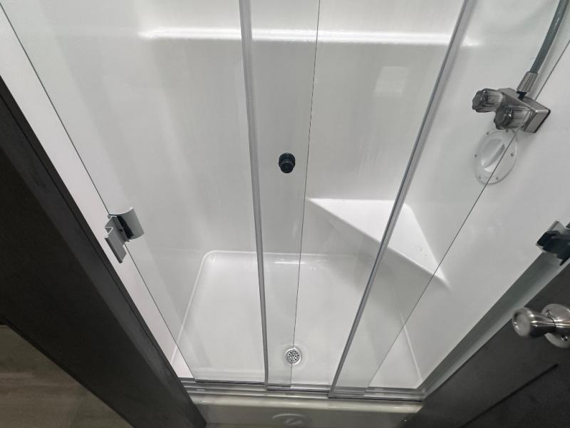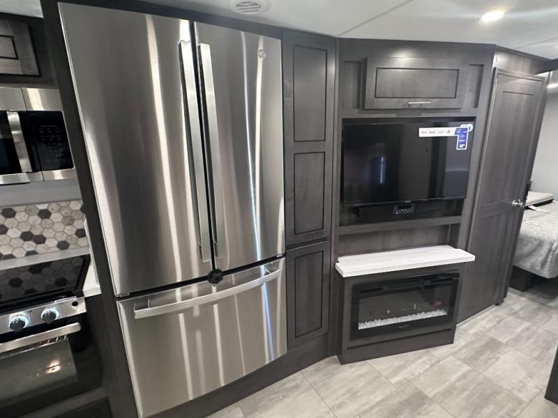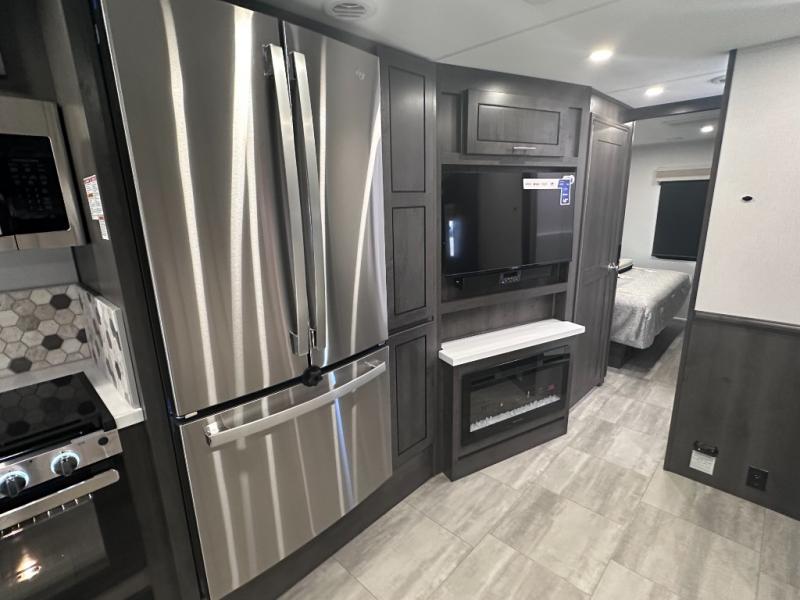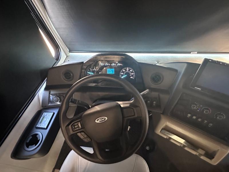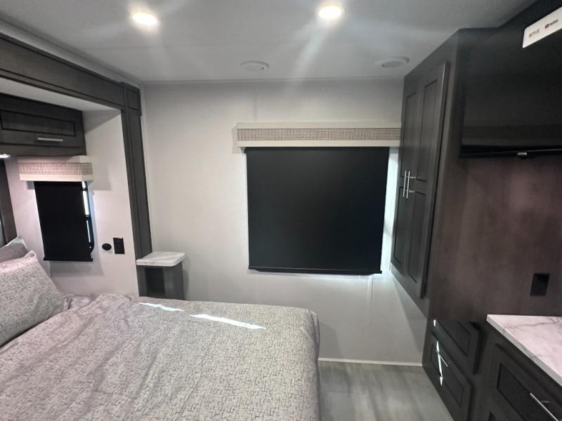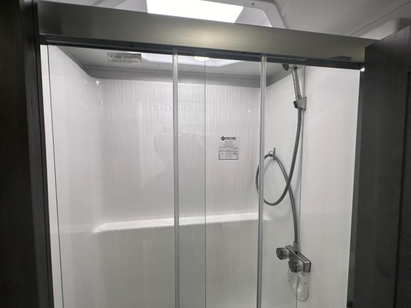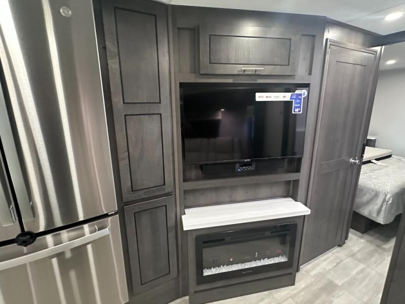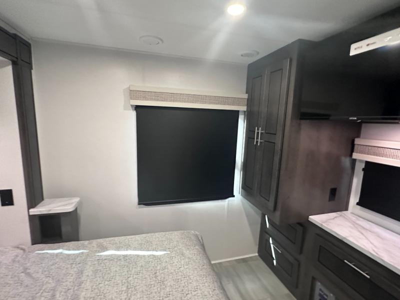 You will love the spacious living entertainment in this motorhome! There is a Thomas Payne 4-person theater seating that reclines with adjustable headrests, heat, massage and has pop-up 110V outlets. There is also a 5,000 BTU fireplace with a 40" LED TV to watch your favorite movies in true comfort. The kitchen has everything you need to prepare your best home cooked meals including a brush nickel designer faucet with a pull out spray wand for easy clean up, and you can enjoy all of your meals at the Dream Dinette. You will appreciate having your own private retreat with the rear bedroom which has a 72" x 80" king bed slide across from a dresser with a 32" LED TV, a wardrobe on one side, and another wardrobe on the other with an optional combo washer and dryer. There is also a power front overhead bunk for more sleeping space!