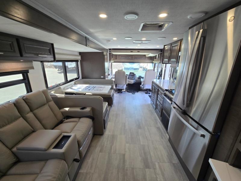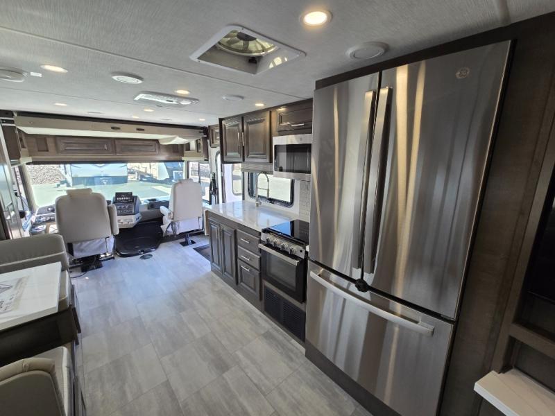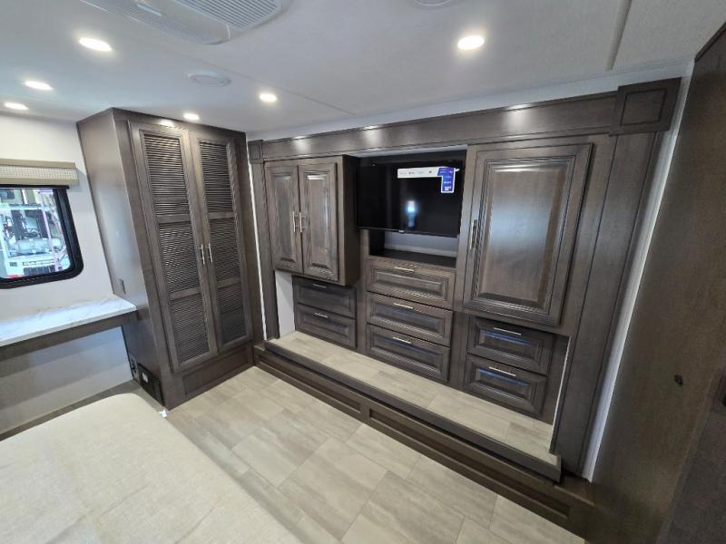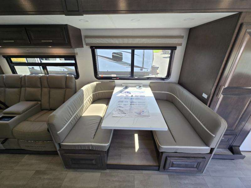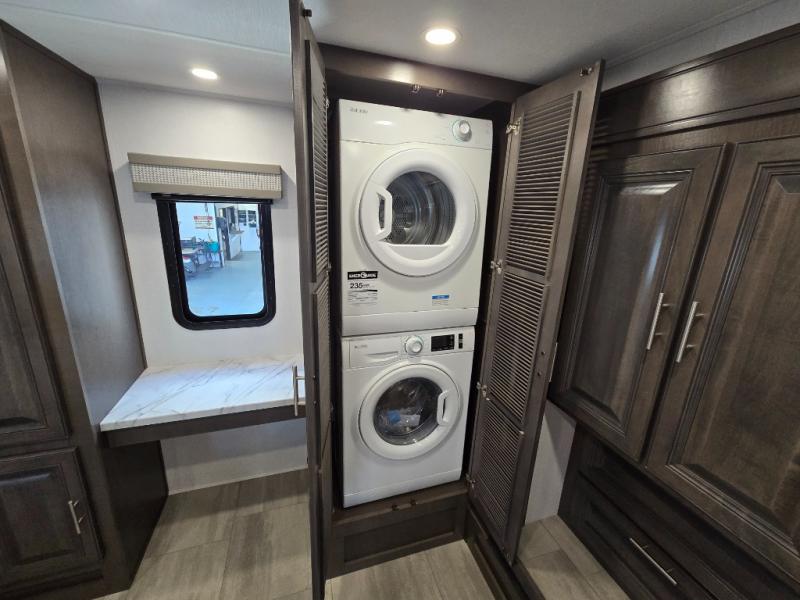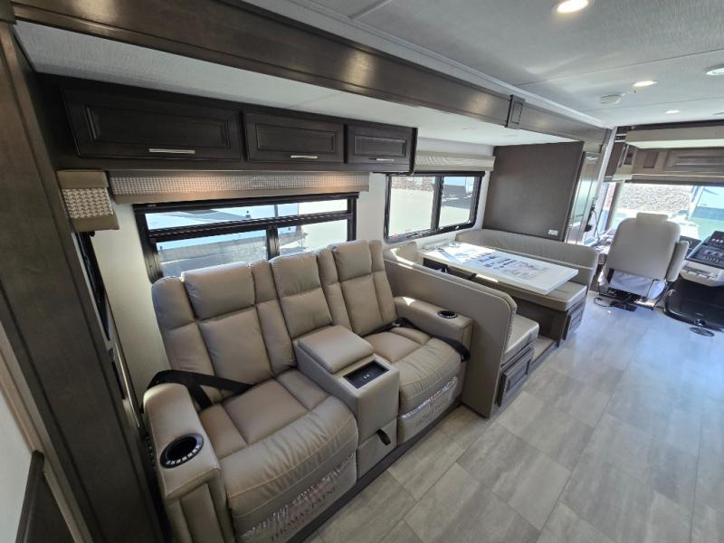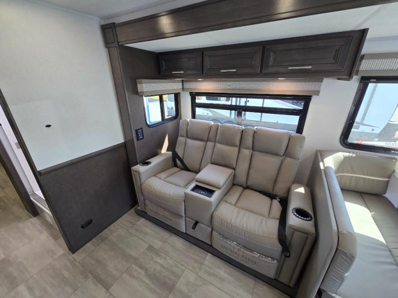 You won't believe all that the rear private bedroom has to offer in this motorhome! It features a 72" x 80" king bed slide with overhead cabinets, a dresser with a 32" TV and overhead cabinets, wardrobes on either side of the dresser, and a desk with wardrobes on either. And one of the wardrobes features an optional stacked washer and dryer for convenience! The split-style bathroom makes it easy for one person to freshen up in the shower with a seat while another uses the private toilet and sink. After a long day of traveling, you can relax on either the Thomas Payne theater seating with heat and massage across from the 5,000 BTU fireplace with a 40" LED TV above it or play a game and eat a meal at the Dream Dinette. There is also a power front overhead bunk for more sleeping space!