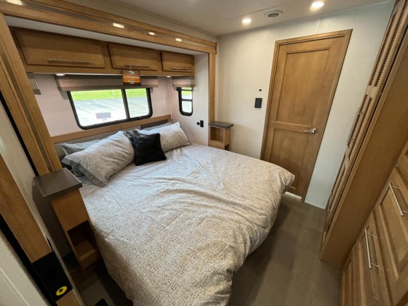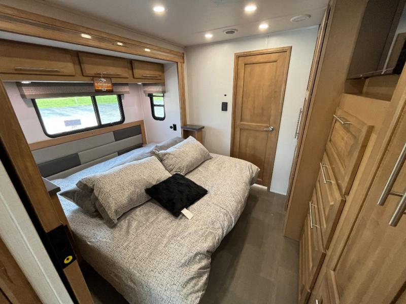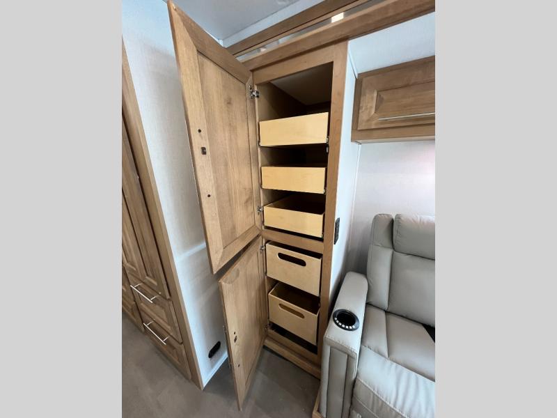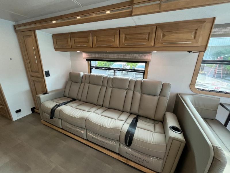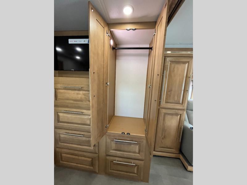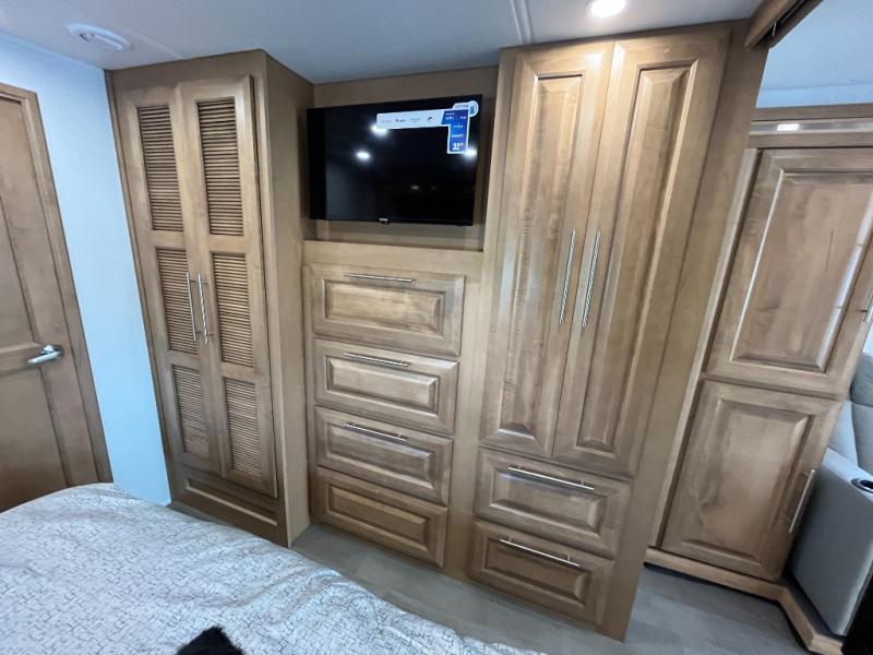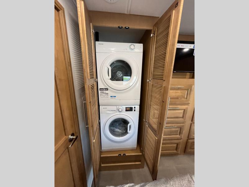 Comfort and convenience is found all throughout this motorhome! Starting with the full rear master bath that has a shower with a seat and a dual sink vanity, plus it leads into the private bedroom. Inside the bedroom is a 72" x 80" Power Tilt king bed slide with overhead cabinets across from a dresser with overhead cabinets and a 32" LED TV, a wardrobe, and another wardrobe that is prepped to add an optional stackable washer and dryer. The half bathroom is conveniently near the fully equipped kitchen so you can get back to creating your best home cooked meals fast. Relax in true comfort each night by either playing games at the booth dinette or on the theater seating that comes with power recline, heat, and massage!