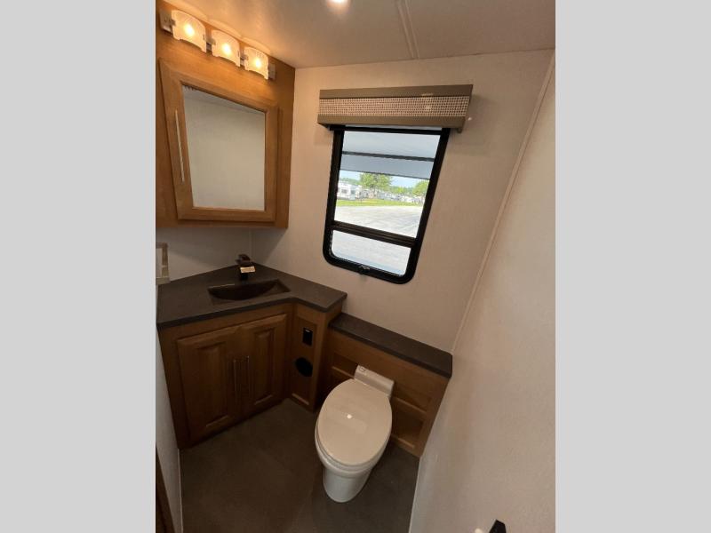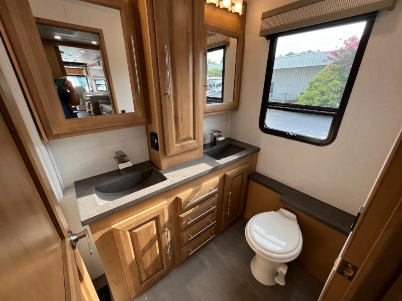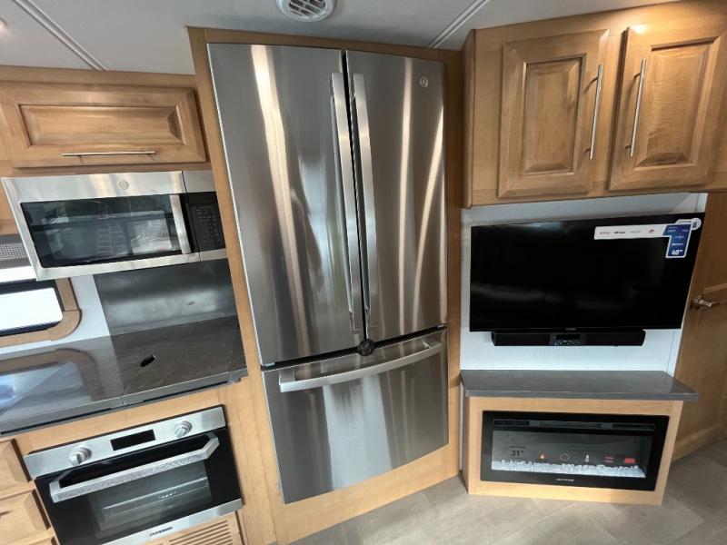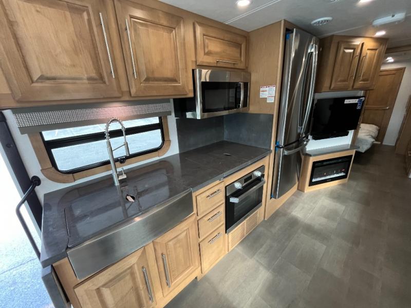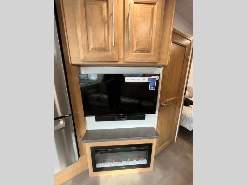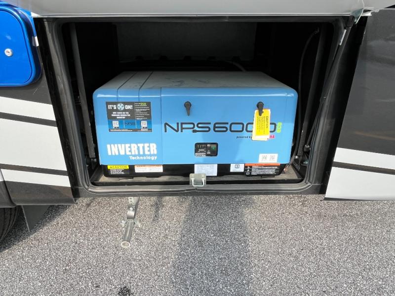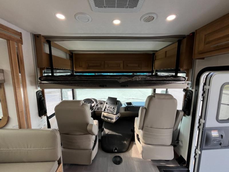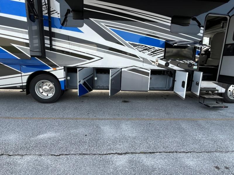 Comfort and convenience is found all throughout this motorhome! Starting with the full rear master bath that has a shower with a seat and a dual sink vanity, plus it leads into the private bedroom. Inside the bedroom is a 72" x 80" Power Tilt king bed slide with overhead cabinets across from a dresser with overhead cabinets and a 32" LED TV, a wardrobe, and another wardrobe that is prepped to add an optional stackable washer and dryer. The half bathroom is conveniently near the fully equipped kitchen so you can get back to creating your best home cooked meals fast. Relax in true comfort each night by either playing games at the booth dinette or on the theater seating that comes with power recline, heat, and massage!