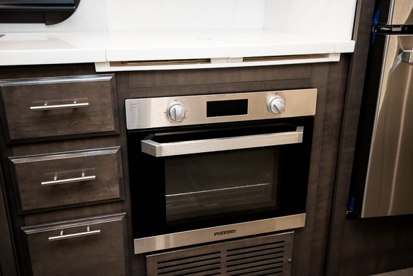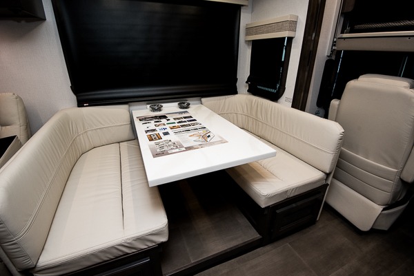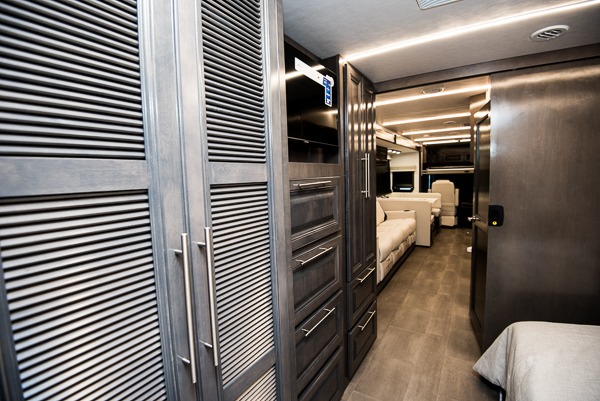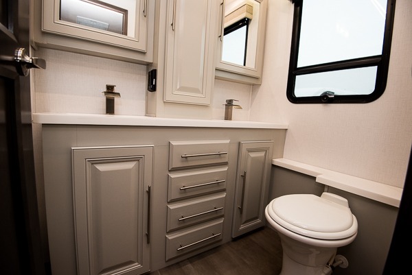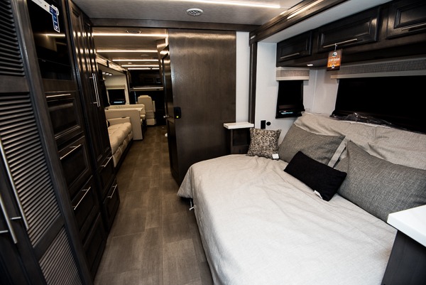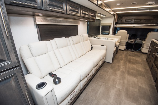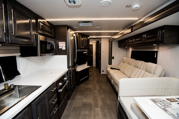 Comfort and convenience is found all throughout this motorhome! Starting with the full rear master bath that has a shower with a seat and a dual sink vanity, plus it leads into the private bedroom. Inside the bedroom is a 72" x 80" Power Tilt king bed slide with overhead cabinets across from a dresser with overhead cabinets and a 32" LED TV, a wardrobe, and another wardrobe that is prepped to add an optional stackable washer and dryer. The half bathroom is conveniently near the fully equipped kitchen so you can get back to creating your best home cooked meals fast. Relax in true comfort each night by either playing games at the booth dinette or on the theater seating that comes with power recline, heat, and massage!