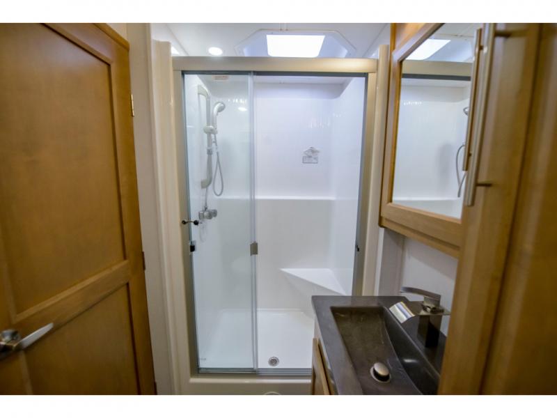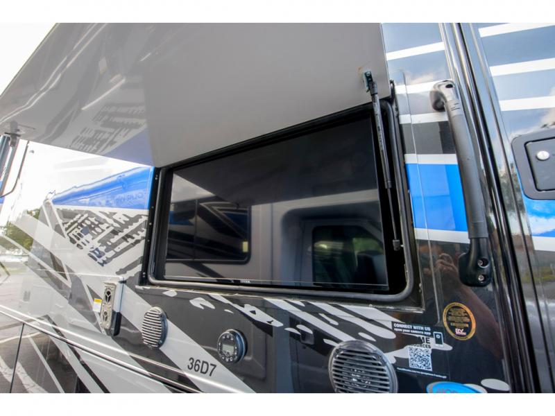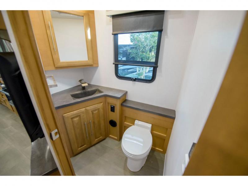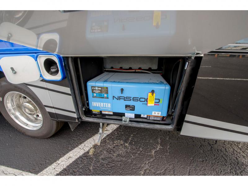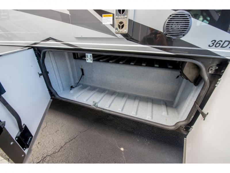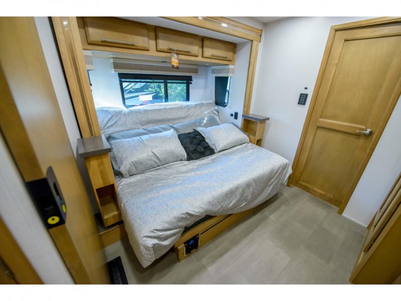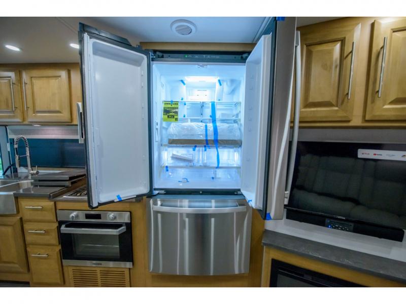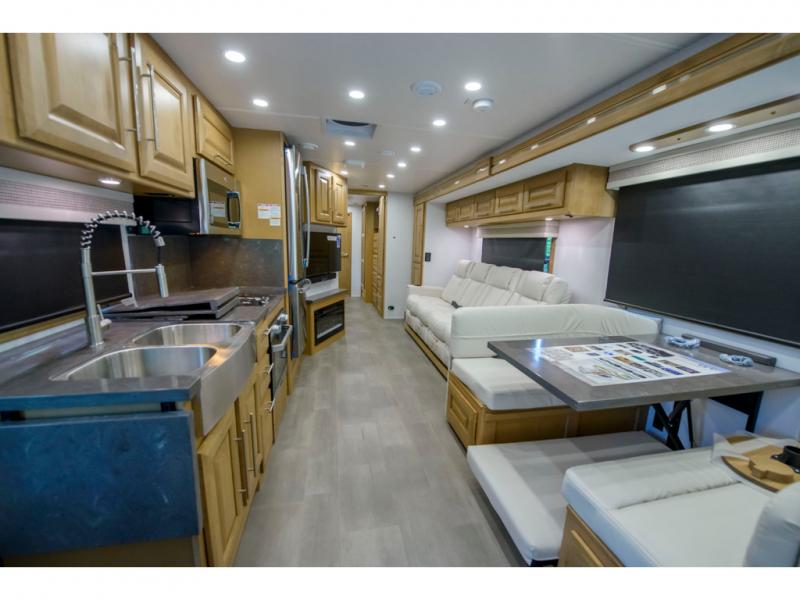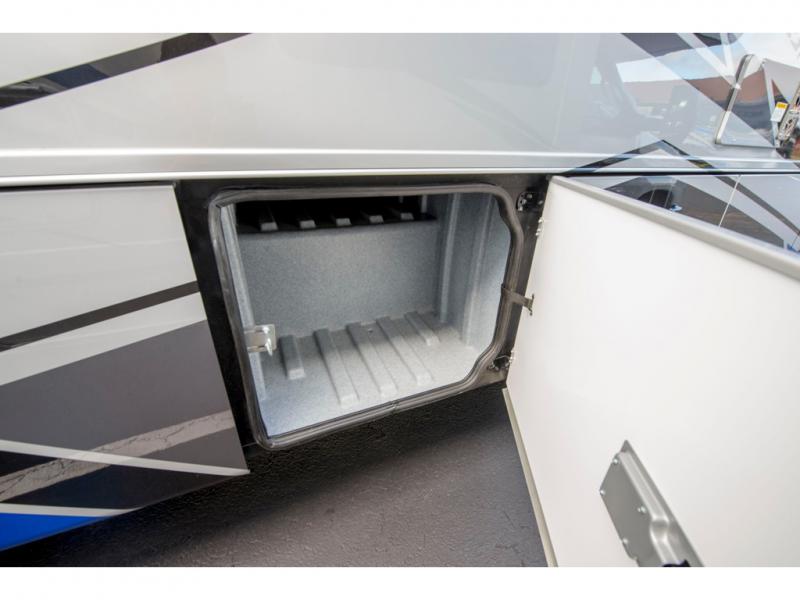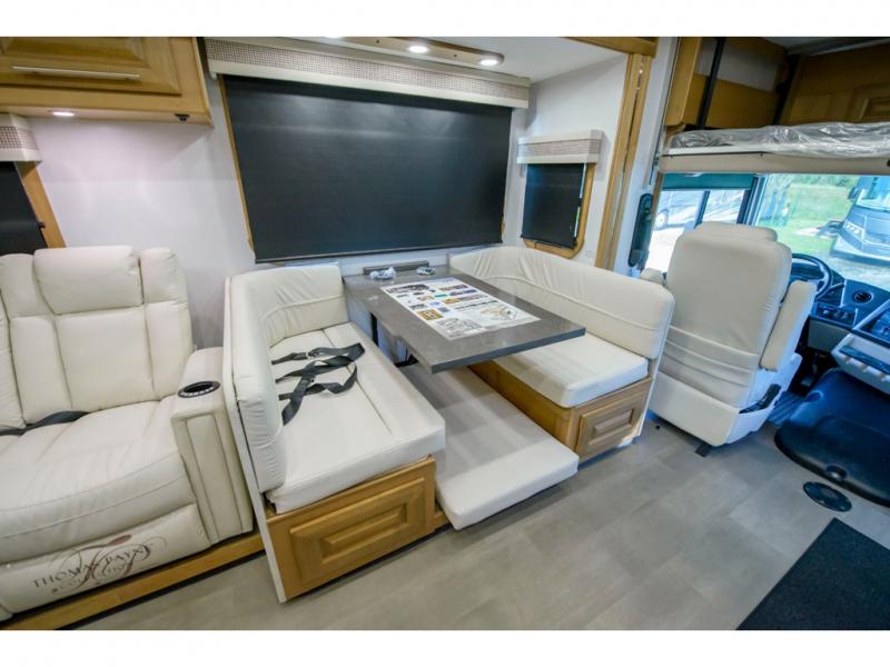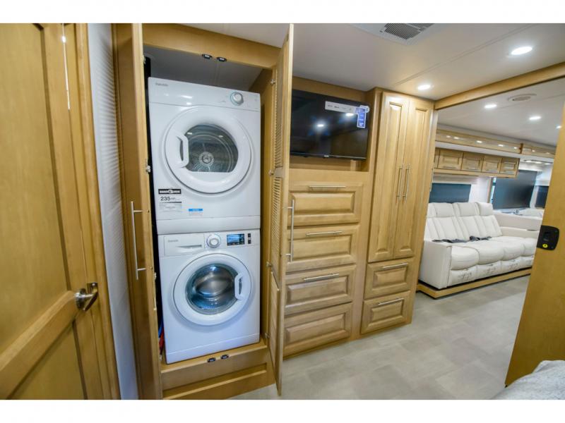 Comfort and convenience is found all throughout this motorhome! Starting with the full rear master bath that has a shower with a seat and a dual sink vanity, plus it leads into the private bedroom. Inside the bedroom is a 72" x 80" Power Tilt king bed slide with overhead cabinets across from a dresser with overhead cabinets and a 32" LED TV, a wardrobe, and another wardrobe that is prepped to add an optional stackable washer and dryer. The half bathroom is conveniently near the fully equipped kitchen so you can get back to creating your best home cooked meals fast. Relax in true comfort each night by either playing games at the booth dinette or on the theater seating that comes with power recline, heat, and massage!