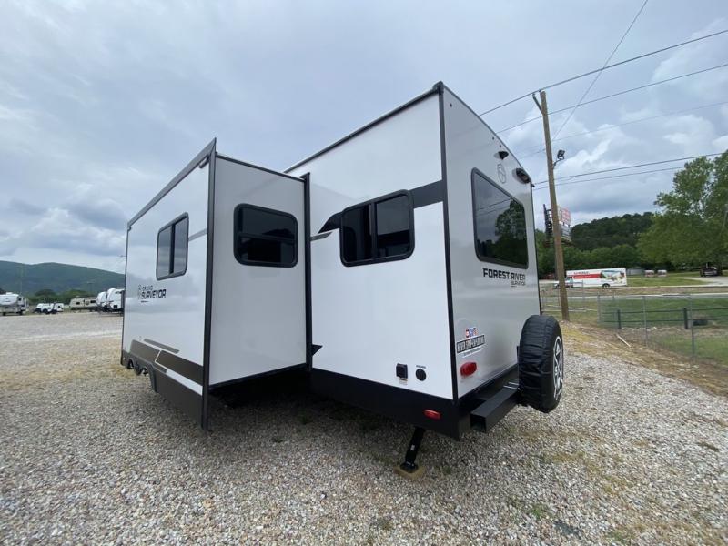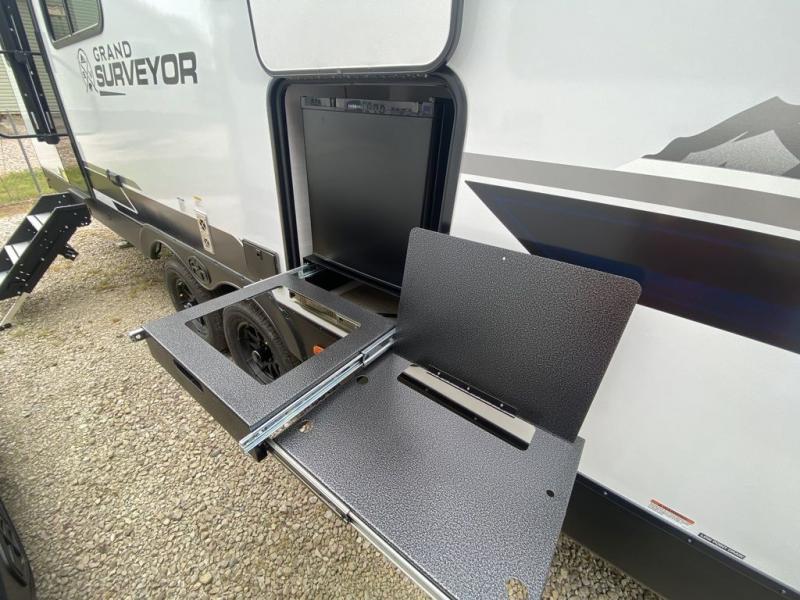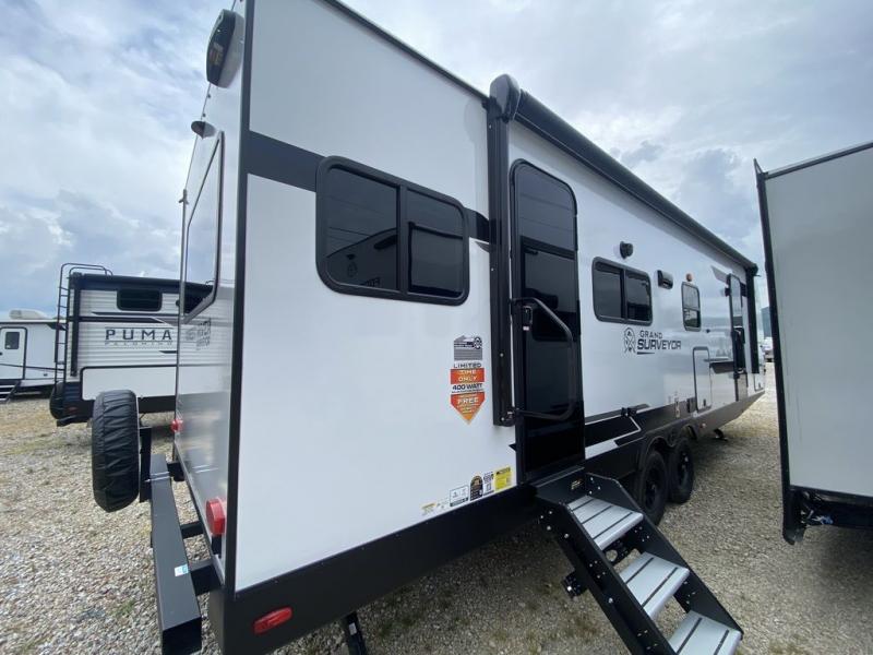 With any Grand Surveyor travel trailer by Forest River you will enjoy turn-key ready-to-go features and quality construction! Each model includes Azdel composite walls and a gel coated fiberglass front cap with an automotive style tinted windshield for a sleek look. There are friction hinge black glass entry door(s), an adjustable platform step with a night light, plus Goodyear tires and a power tongue jack for easy towing. The interior will have you feeling right at home with roller shades, residential faucets, sinks, and bathroom vanity, plus Surf(x) seamless countertops throughout. You can also plan for adventure with a 2" rear accessory and exterior spray port, and there are slam latch exterior baggage doors throughout to keep all your gear secure. Other stand-out features include a central vacuum system, Two (2) 200 watt solar panels with a 30 amp controller, a tankless water heater, carpet-free interiors, and the list goes on!