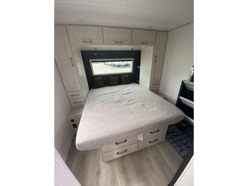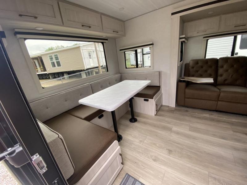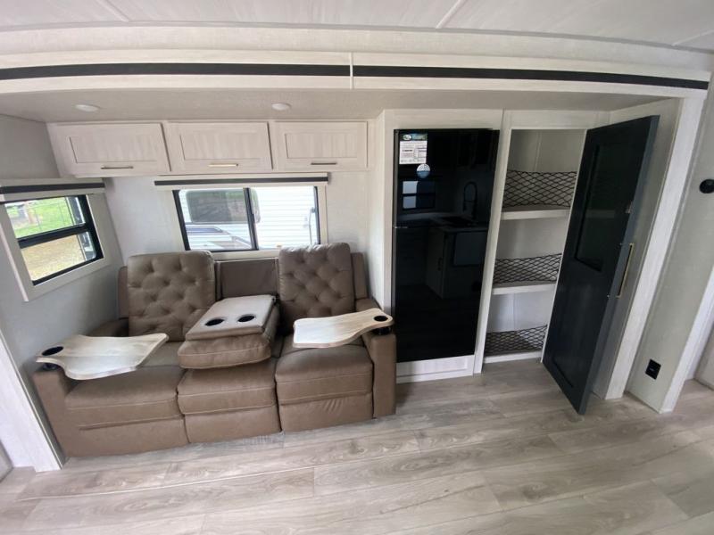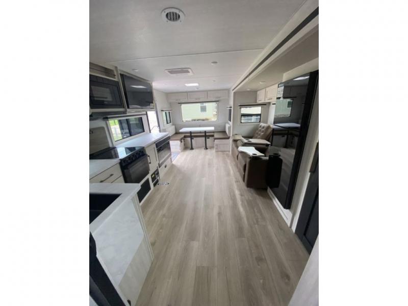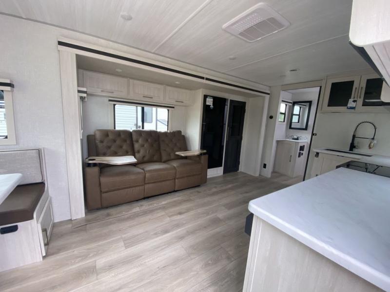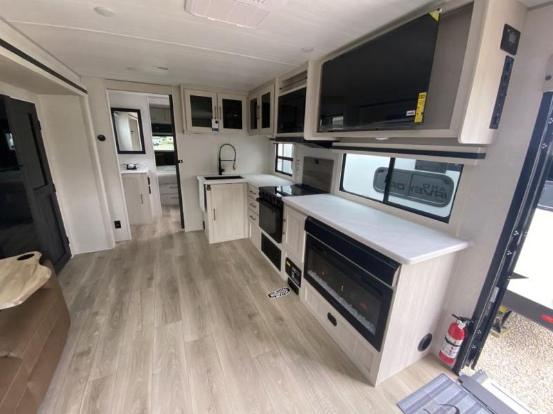 Camping your favorite site has never been more relaxing than in this travel trailer. You can comfortably sleep five to six each night with the custom king bed in the front master bedroom, plus the tri-fold sofa and booth dinette in the rear living area. There is also a walk-through bath that will easily accessible for everyone to use. Whip up your best meals on the residential range, or head outdoors to cook on the gas griddle included within the outdoor kitchen. You'll also find a sink and a refrigerator, and a 21' power awning with LED lights to create the perfect outdoor living space. After a day outdoors, you can relax by the fireplace or watch a movie on the HD TV, and there is a large kitchen pantry to stock up on snacks!