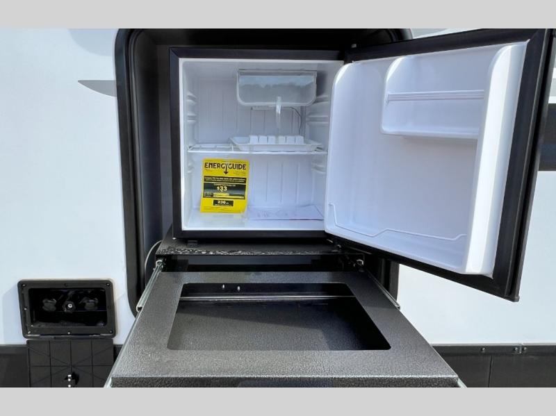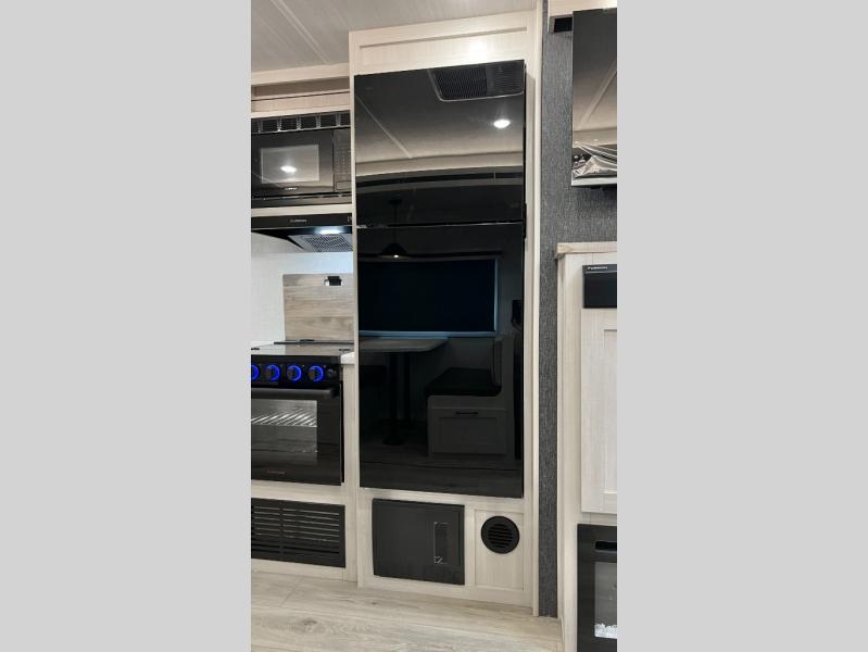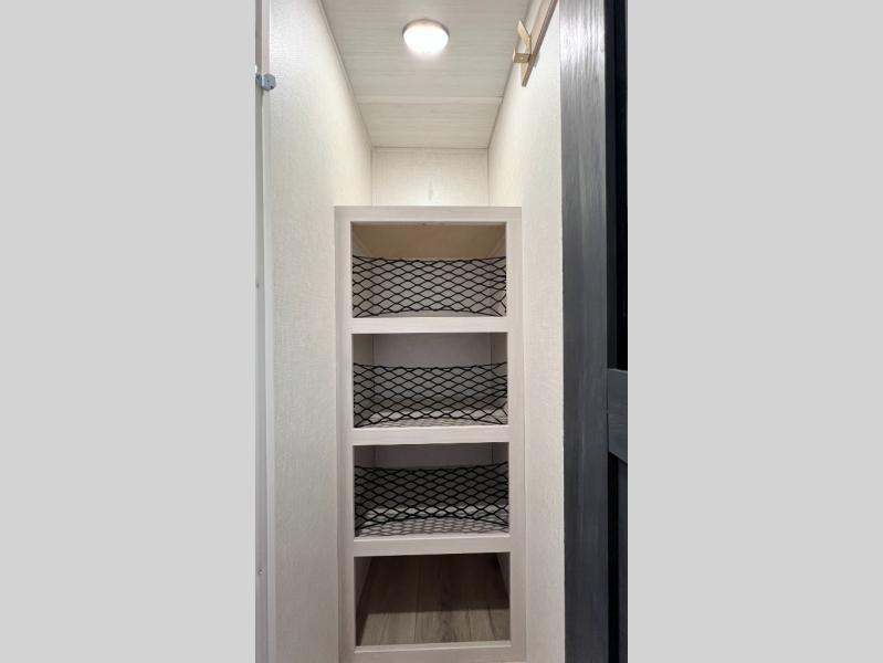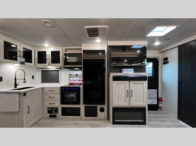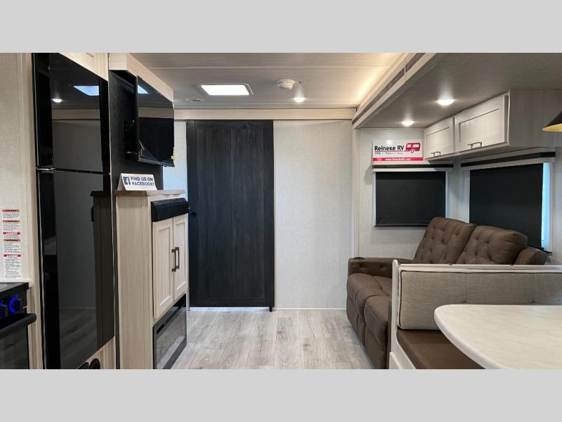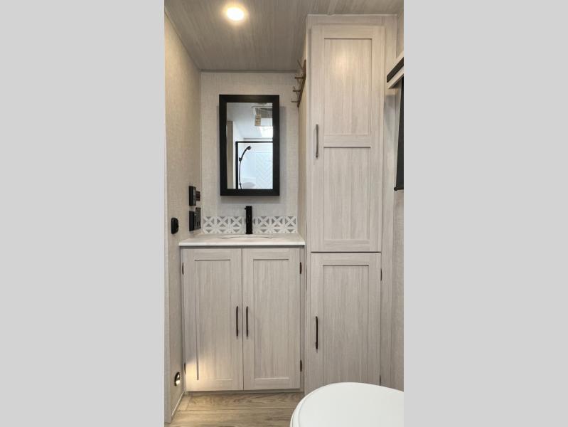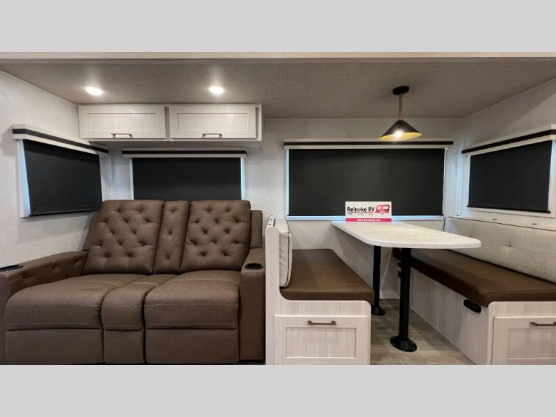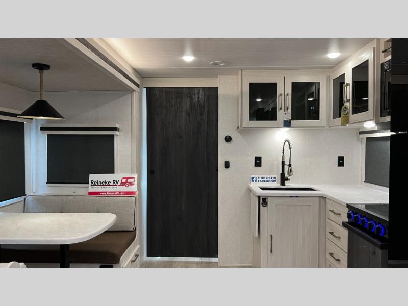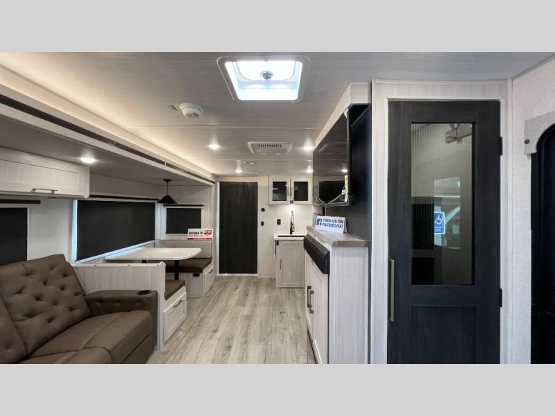 No need to rough it when you camp; this trailer offers amenities that allow you to "Glamp" if you want! The rear spacious bathroom is tucked away behind a beautiful barn door, and inside features a shower, wardrobe, and linen storage. The front master bedroom offers privacy, a walk-around custom king bed, dual wardrobes and underbed storage, plus TV prep if you want the option to watch movies in bed. The L-shaped counter in the kitchen provides enough space to have everything at your fingertips while you cook, plus there is a countertop extension for more prep and serving space if needed. A nice walk-in pantry just inside the entry door will be perfect for chips and snacks or canned goods for those longer camping trips. If dining inside, the booth dinette with pull-out dinette drawers will be comfortable plus you will enjoy the view provided by the panoramic windows within the slide out. An outside kitchen will be a favorite for anyone that cooks, and the 19' awning will provide some protection from the elements and offering an outdoor living area to enjoy with everyone.