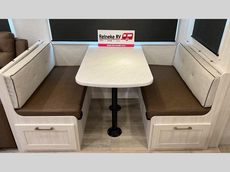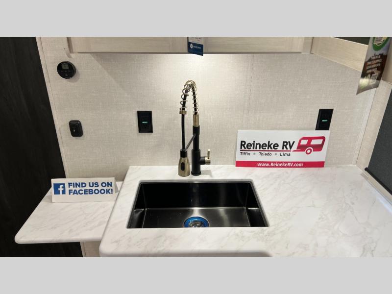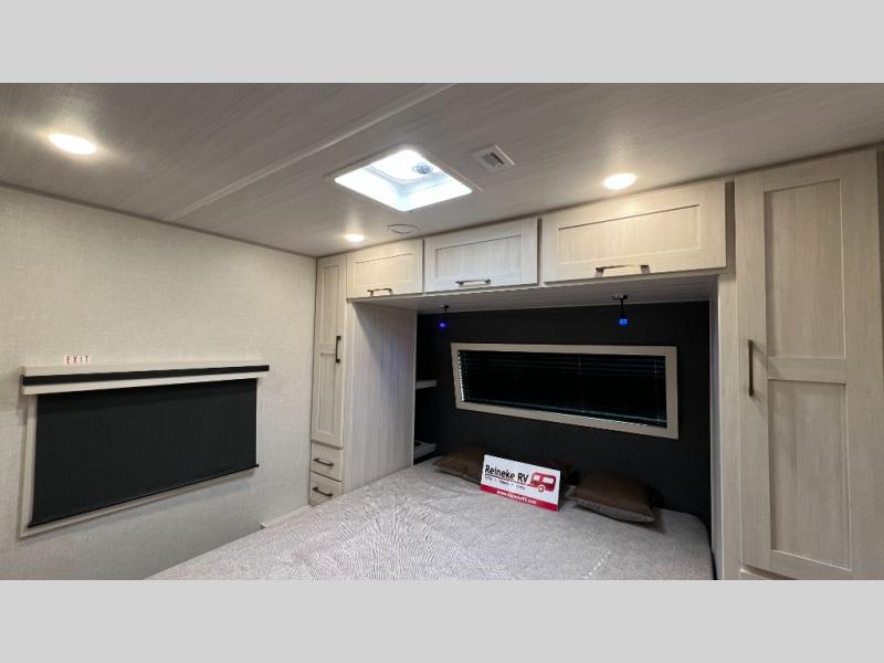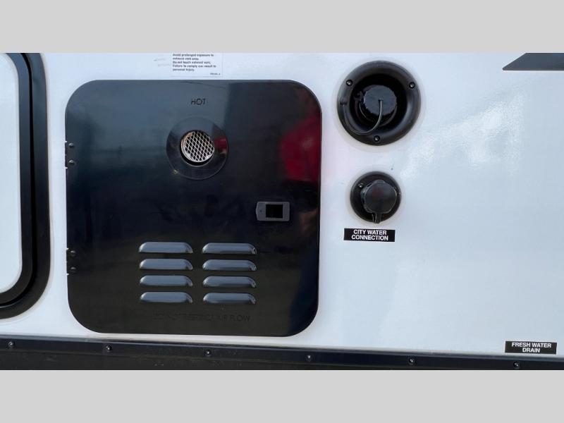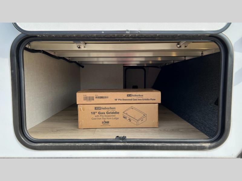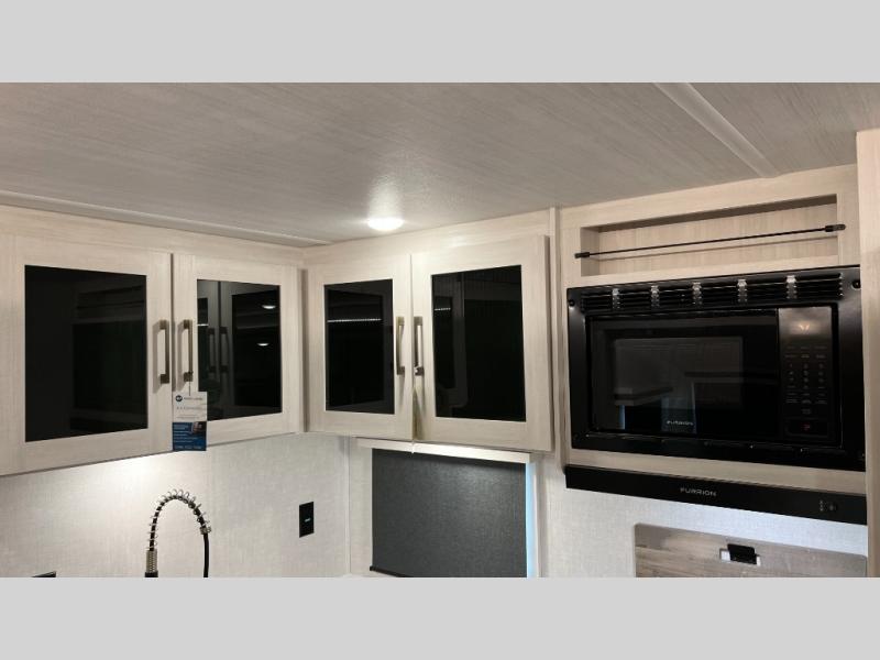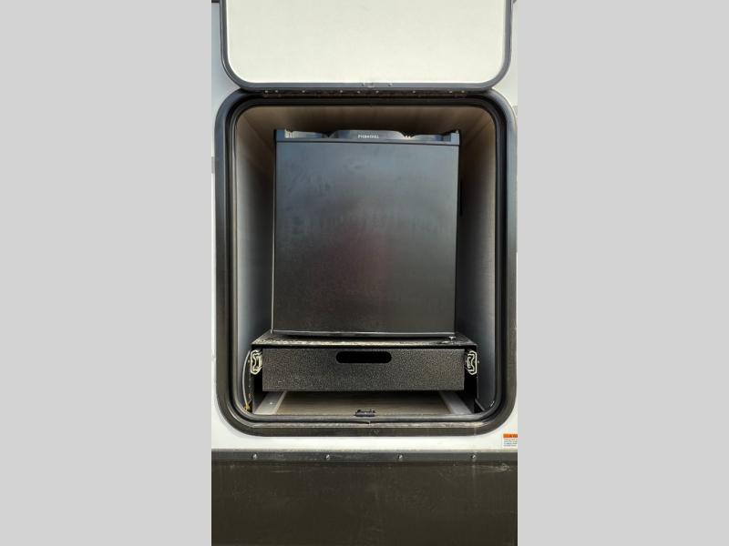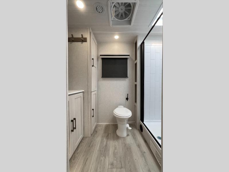 No need to rough it when you camp; this trailer offers amenities that allow you to "Glamp" if you want! The rear spacious bathroom is tucked away behind a beautiful barn door, and inside features a shower, wardrobe, and linen storage. The front master bedroom offers privacy, a walk-around custom king bed, dual wardrobes and underbed storage, plus TV prep if you want the option to watch movies in bed. The L-shaped counter in the kitchen provides enough space to have everything at your fingertips while you cook, plus there is a countertop extension for more prep and serving space if needed. A nice walk-in pantry just inside the entry door will be perfect for chips and snacks or canned goods for those longer camping trips. If dining inside, the booth dinette with pull-out dinette drawers will be comfortable plus you will enjoy the view provided by the panoramic windows within the slide out. An outside kitchen will be a favorite for anyone that cooks, and the 19' awning will provide some protection from the elements and offering an outdoor living area to enjoy with everyone.