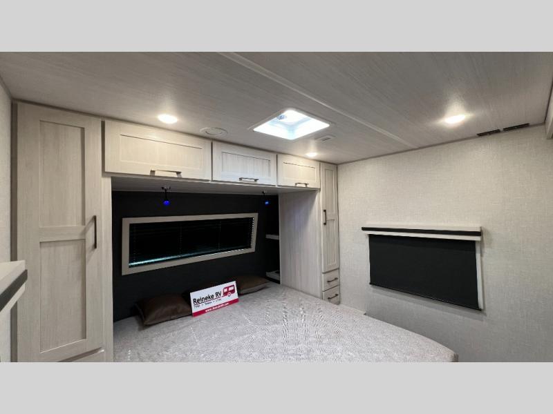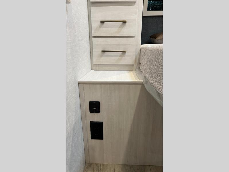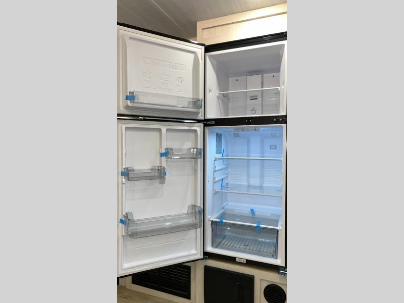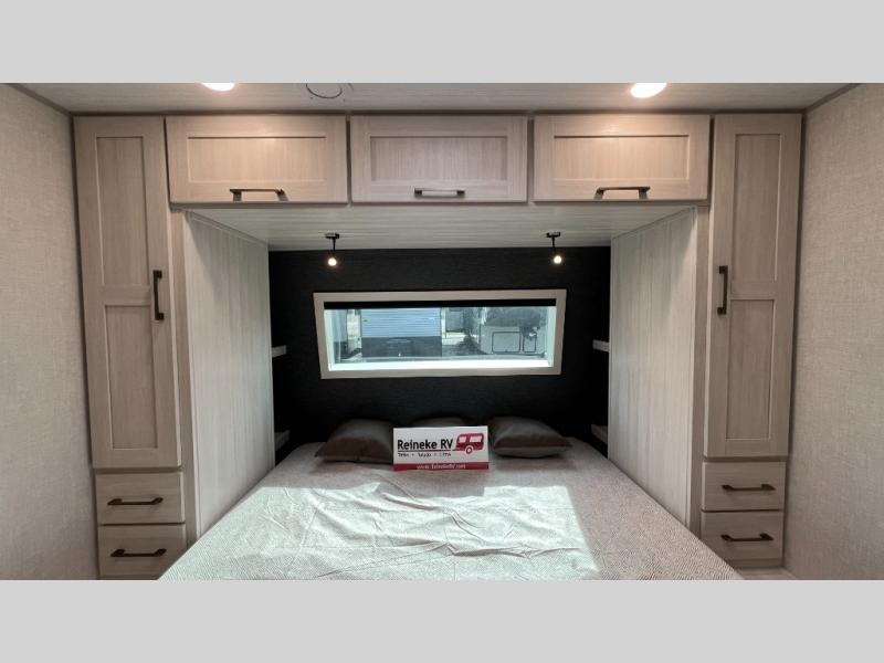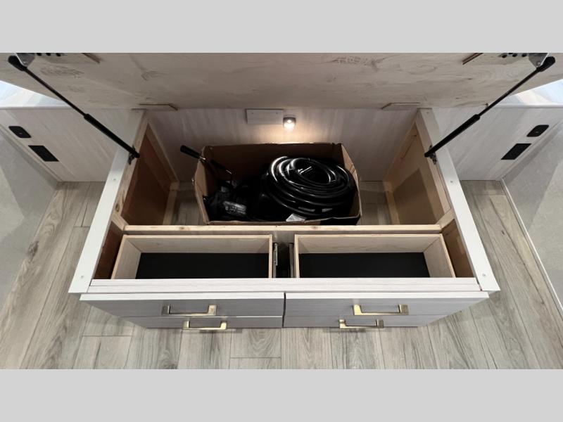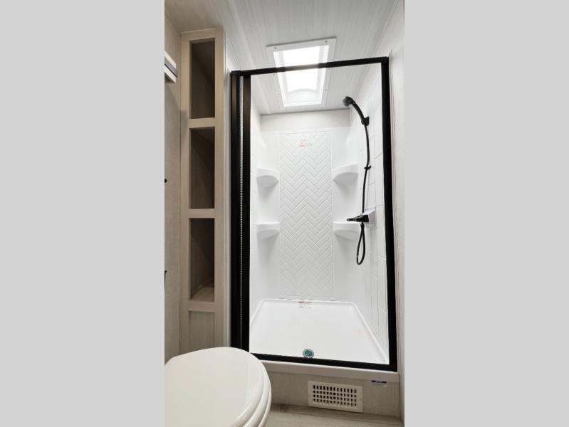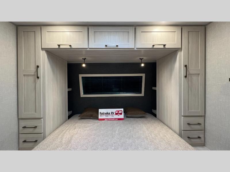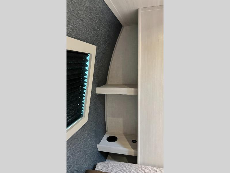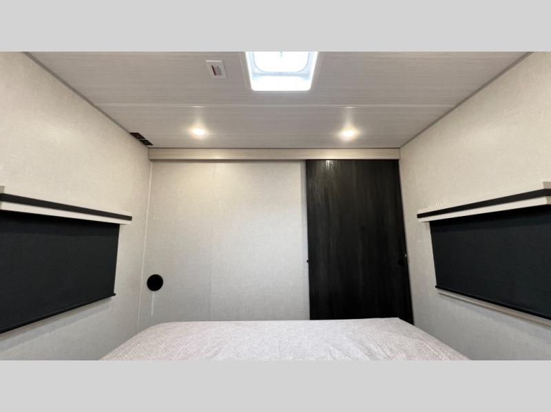 No need to rough it when you camp; this trailer offers amenities that allow you to "Glamp" if you want! The rear spacious bathroom is tucked away behind a beautiful barn door, and inside features a shower, wardrobe, and linen storage. The front master bedroom offers privacy, a walk-around custom king bed, dual wardrobes and underbed storage, plus TV prep if you want the option to watch movies in bed. The L-shaped counter in the kitchen provides enough space to have everything at your fingertips while you cook, plus there is a countertop extension for more prep and serving space if needed. A nice walk-in pantry just inside the entry door will be perfect for chips and snacks or canned goods for those longer camping trips. If dining inside, the booth dinette with pull-out dinette drawers will be comfortable plus you will enjoy the view provided by the panoramic windows within the slide out. An outside kitchen will be a favorite for anyone that cooks, and the 19' awning will provide some protection from the elements and offering an outdoor living area to enjoy with everyone.