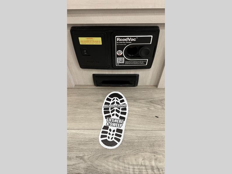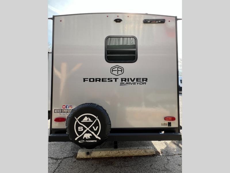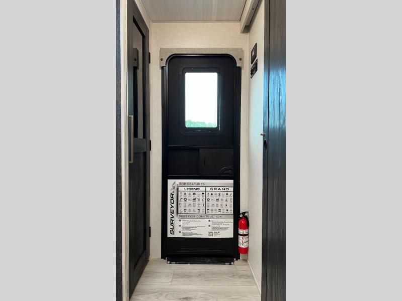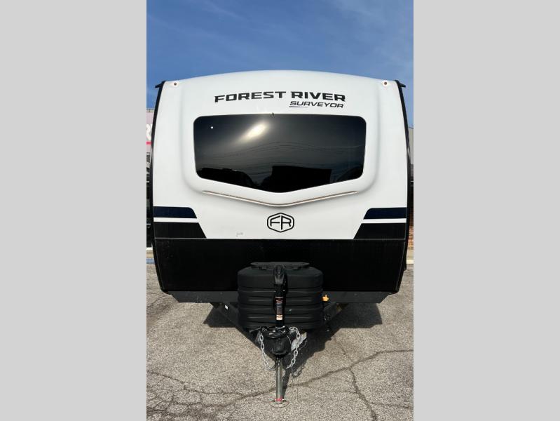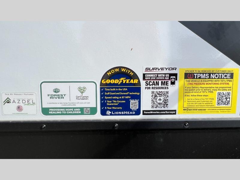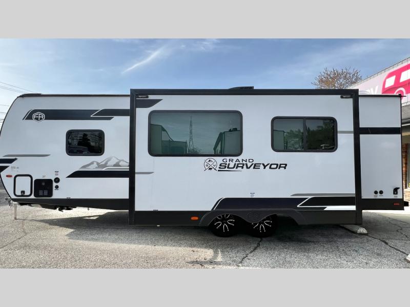 With any Grand Surveyor travel trailer by Forest River you will enjoy turn-key ready-to-go features and quality construction! Each model includes Azdel composite walls and a gel coated fiberglass front cap with an automotive style tinted windshield for a sleek look. There are friction hinge black glass entry door(s), an adjustable platform step with a night light, plus Goodyear tires and a power tongue jack for easy towing. The interior will have you feeling right at home with roller shades, residential faucets, sinks, and bathroom vanity, plus Surf(x) seamless countertops throughout. You can also plan for adventure with a 2" rear accessory and exterior spray port, and there are slam latch exterior baggage doors throughout to keep all your gear secure. Other stand-out features include a central vacuum system, a 200 watt solar panel with a 30 amp controller, a tankless water heater, carpet-free interiors, and the list goes on!