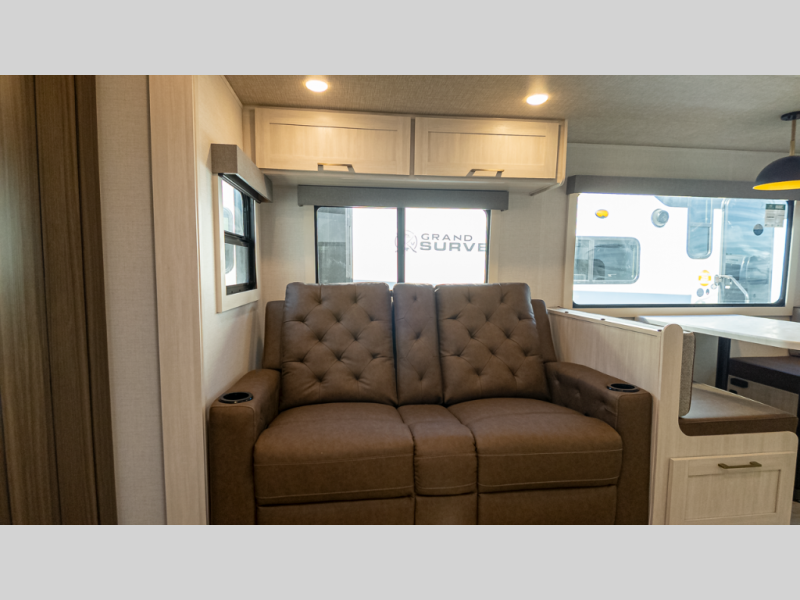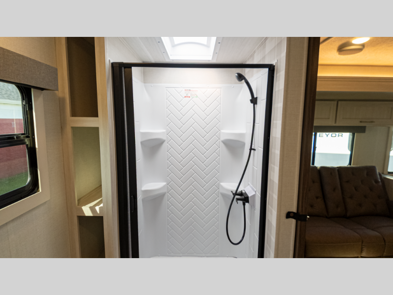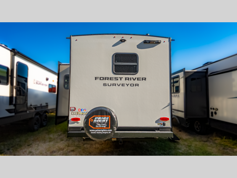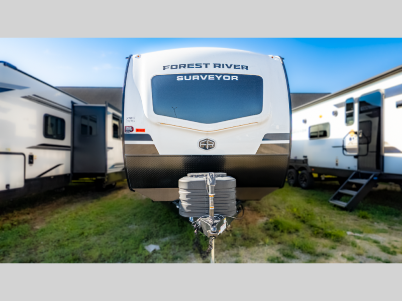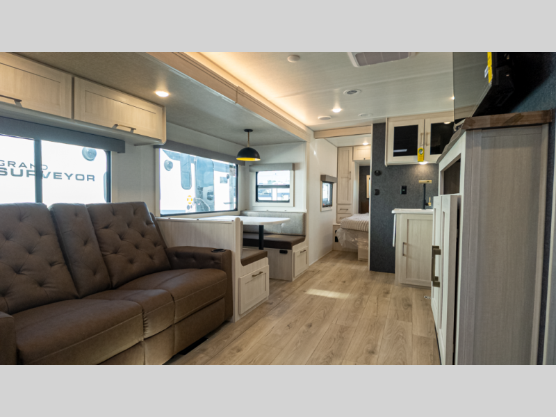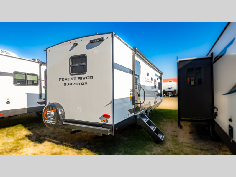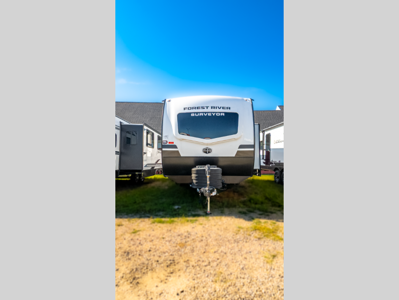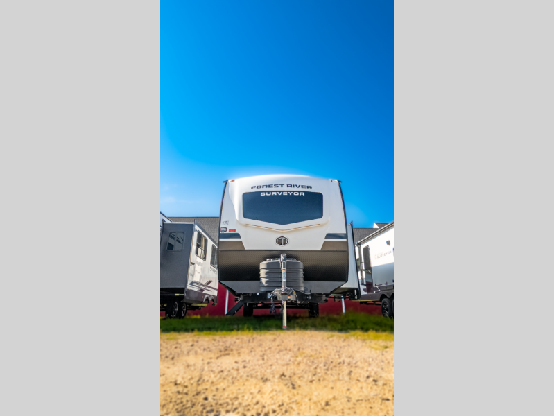 With any Grand Surveyor travel trailer by Forest River you will enjoy turn-key ready-to-go features and quality construction! Each model includes Azdel composite walls and a gel coated fiberglass front cap with an automotive style tinted windshield for a sleek look. There are friction hinge black glass entry door(s), an adjustable platform step with a night light, plus Goodyear tires and a power tongue jack for easy towing. The interior will have you feeling right at home with roller shades, residential faucets, sinks, and bathroom vanity, plus Surf(x) seamless countertops throughout. You can also plan for adventure with a 2" rear accessory and exterior spray port, and there are slam latch exterior baggage doors throughout to keep all your gear secure. Other stand-out features include a central vacuum system, a 200 watt solar panel with a 30 amp controller, a tankless water heater, carpet-free interiors, and the list goes on!