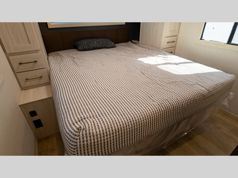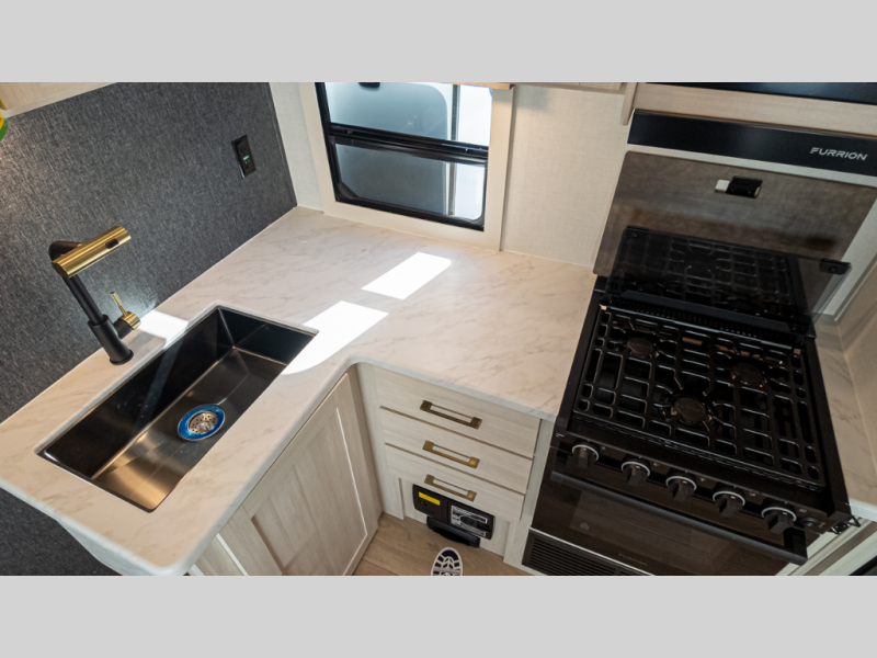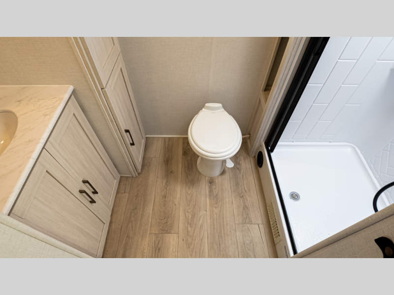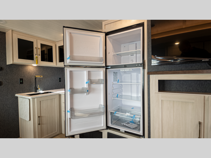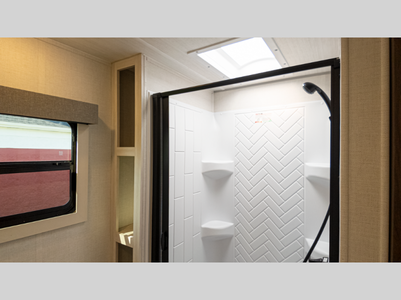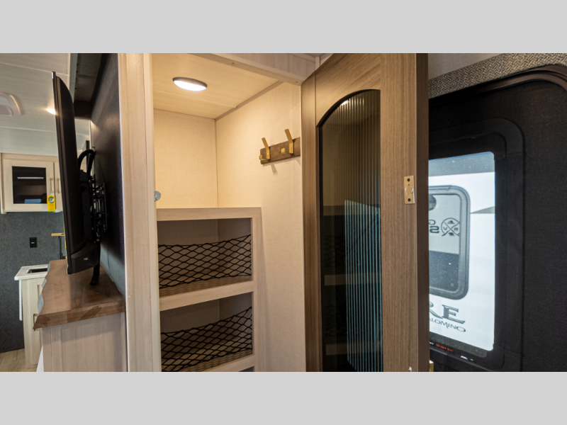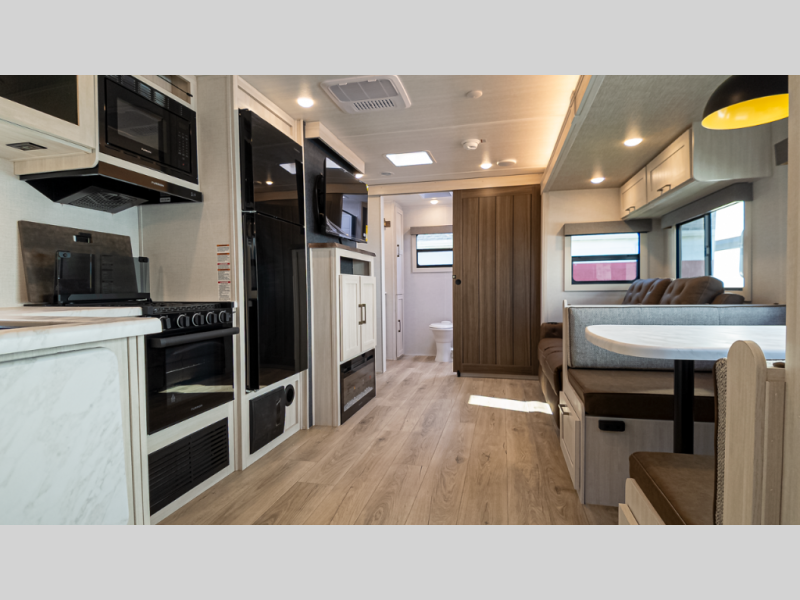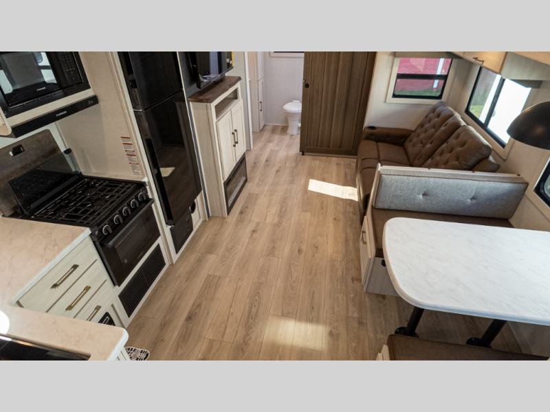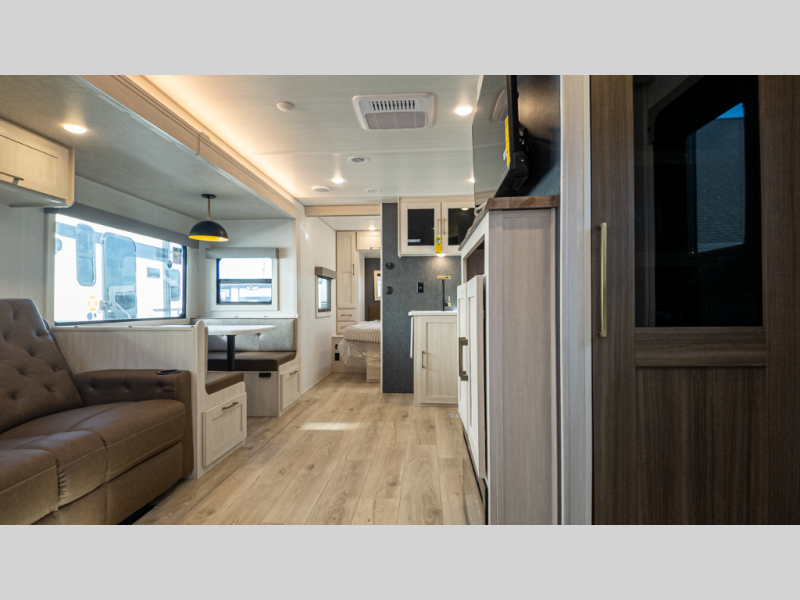 No need to rough it when you camp; this trailer offers amenities that allow you to "Glamp" if you want! The rear spacious bathroom is tucked away behind a beautiful barn door, and inside features a shower, wardrobe, and linen storage. The front master bedroom offers privacy, a walk-around custom king bed, dual wardrobes and underbed storage, plus TV prep if you want the option to watch movies in bed. The L-shaped counter in the kitchen provides enough space to have everything at your fingertips while you cook, plus there is a countertop extension for more prep and serving space if needed. A nice walk-in pantry just inside the entry door will be perfect for chips and snacks or canned goods for those longer camping trips. If dining inside, the booth dinette with pull-out dinette drawers will be comfortable plus you will enjoy the view provided by the panoramic windows within the slide out. An outside kitchen will be a favorite for anyone that cooks, and the 19' awning will provide some protection from the elements and offering an outdoor living area to enjoy with everyone.