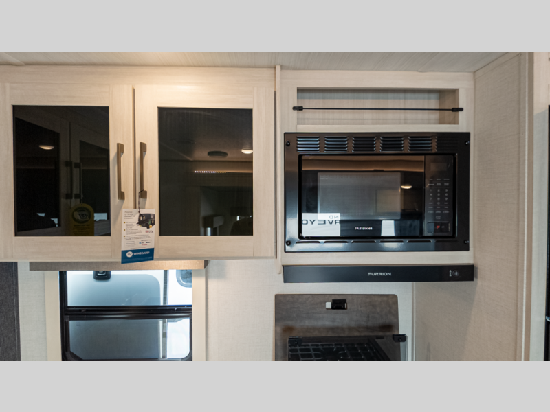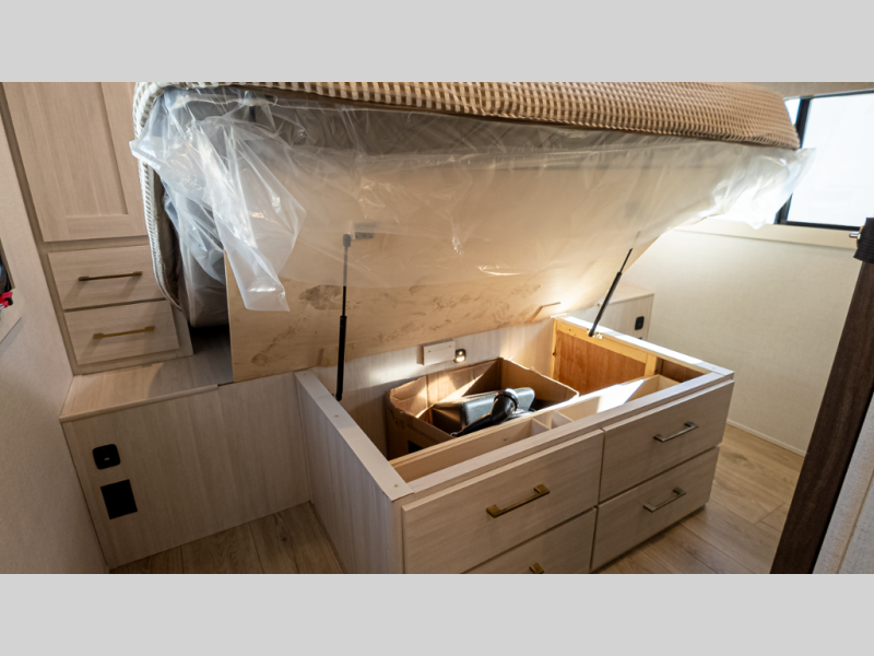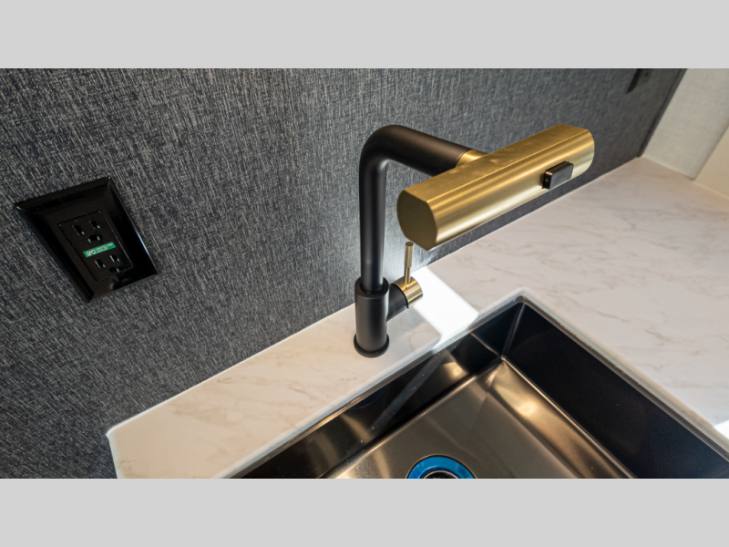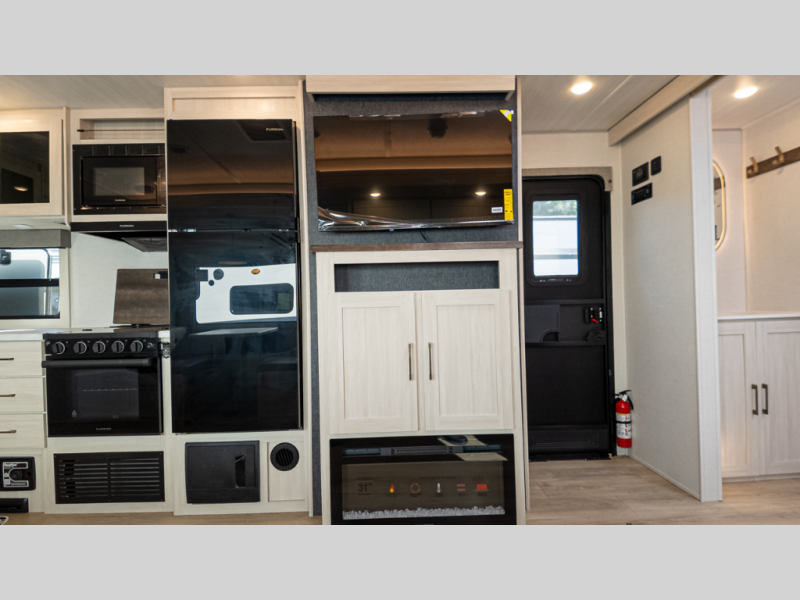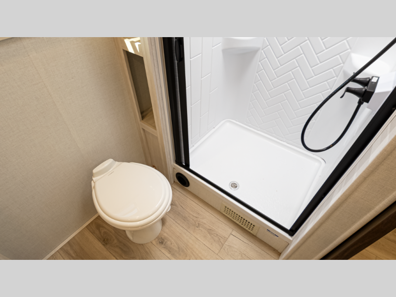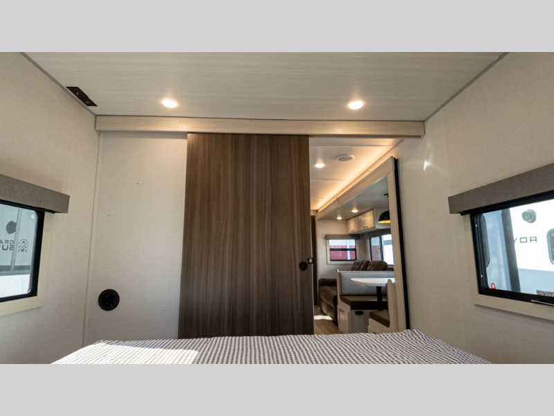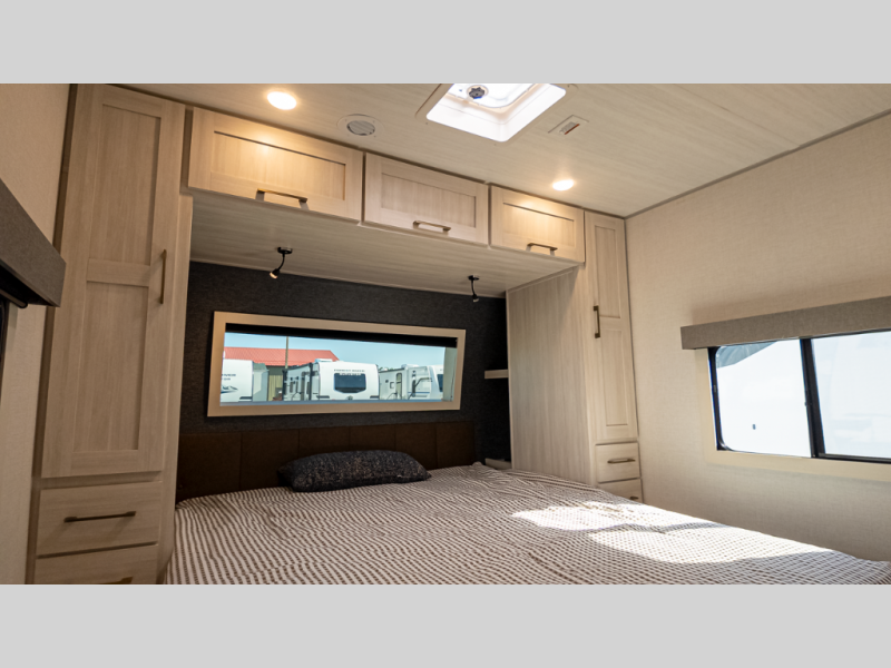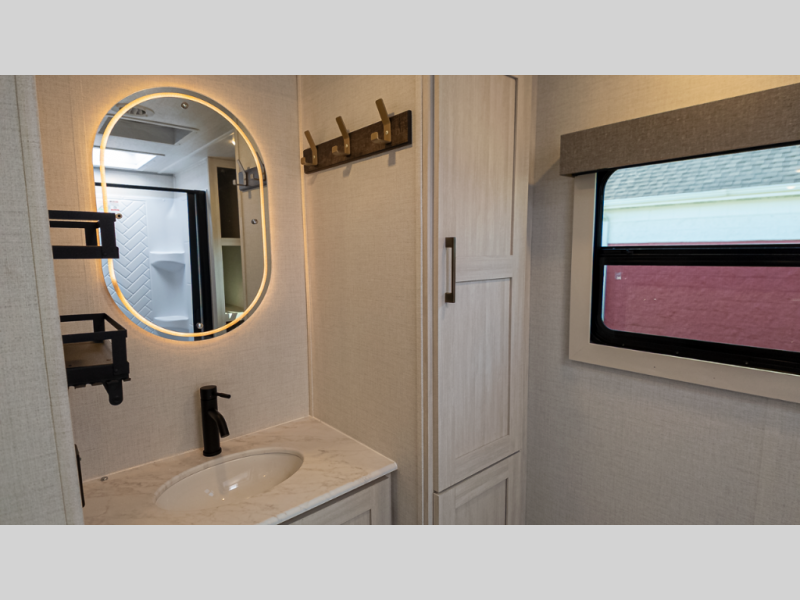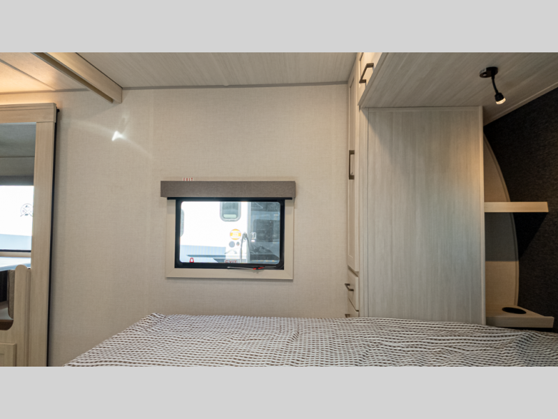 No need to rough it when you camp; this trailer offers amenities that allow you to "Glamp" if you want! The rear spacious bathroom is tucked away behind a beautiful barn door, and inside features a shower, wardrobe, and linen storage. The front master bedroom offers privacy, a walk-around custom king bed, dual wardrobes and underbed storage, plus TV prep if you want the option to watch movies in bed. The L-shaped counter in the kitchen provides enough space to have everything at your fingertips while you cook, plus there is a countertop extension for more prep and serving space if needed. A nice walk-in pantry just inside the entry door will be perfect for chips and snacks or canned goods for those longer camping trips. If dining inside, the booth dinette with pull-out dinette drawers will be comfortable plus you will enjoy the view provided by the panoramic windows within the slide out. An outside kitchen will be a favorite for anyone that cooks, and the 19' awning will provide some protection from the elements and offering an outdoor living area to enjoy with everyone.