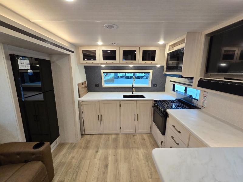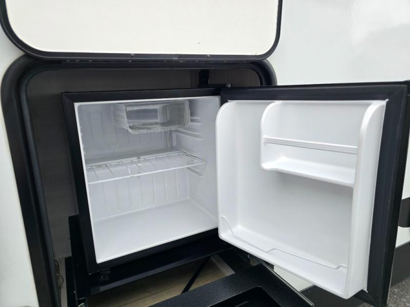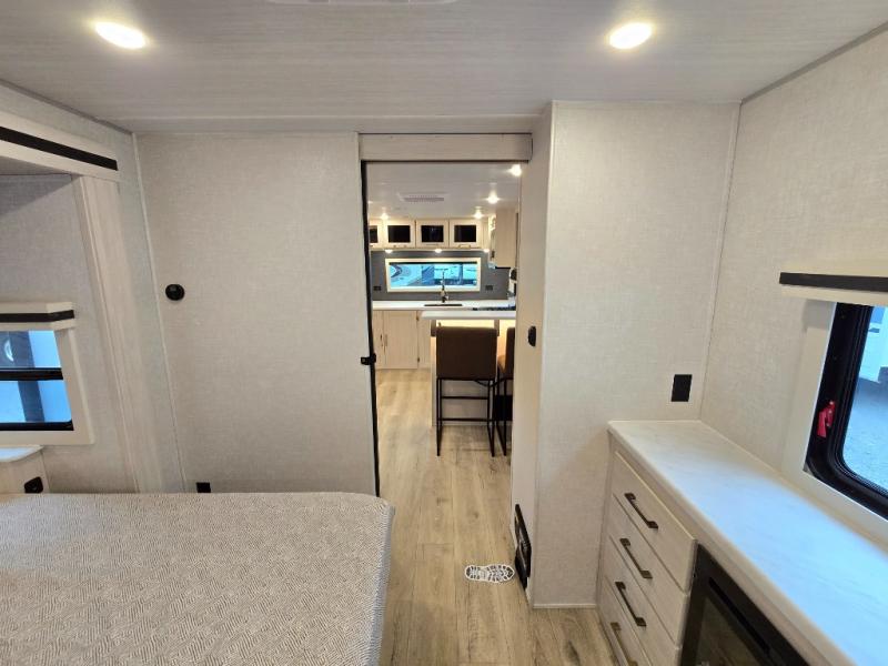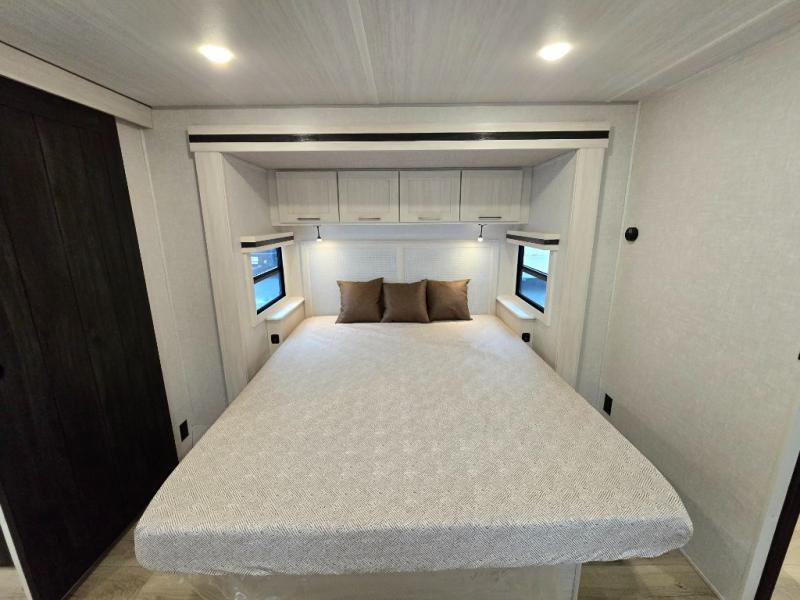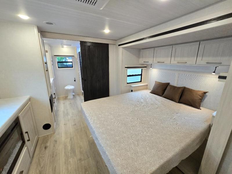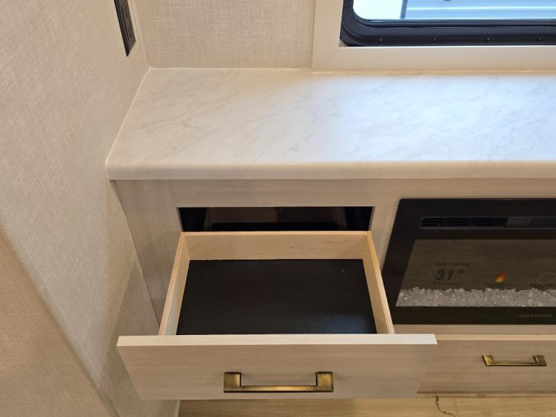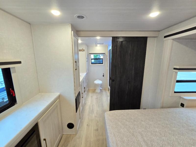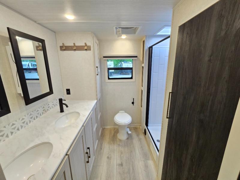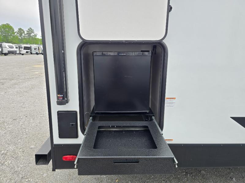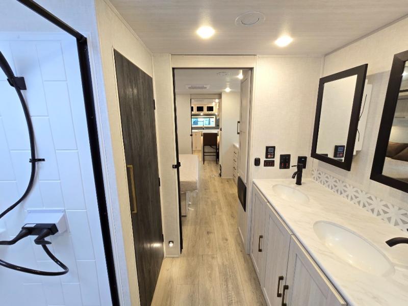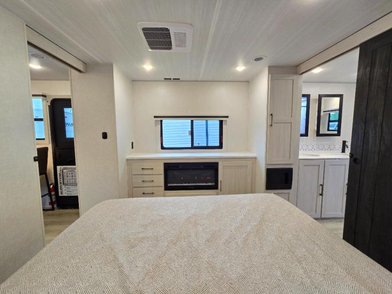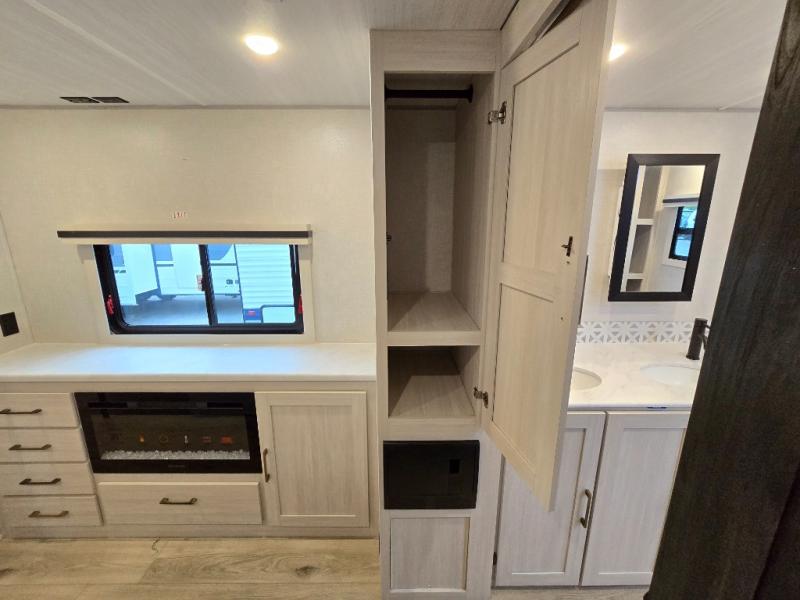 This couple's trailer will be giving you all the glamping vibes! There is a front kitchen with ample counter space, along with a counter with two bar stools, a central vacuum to easily clean up, and a slide out for more space! The second slide out is found in the middle master bedroom where you'll also enjoy a custom king bed across from a bedroom fireplace, a wardrobe, and a dresser with TV prep. Head towards the back and you'll be wowed by the full bath with dual bath sinks, an upgraded slow-close shower door, and a closet with washer and dryer prep. The exterior is just as impressive as the interior with its outside kitchen, 20' power awning with LED lights, pass-through storage, TV coax, and so much more!