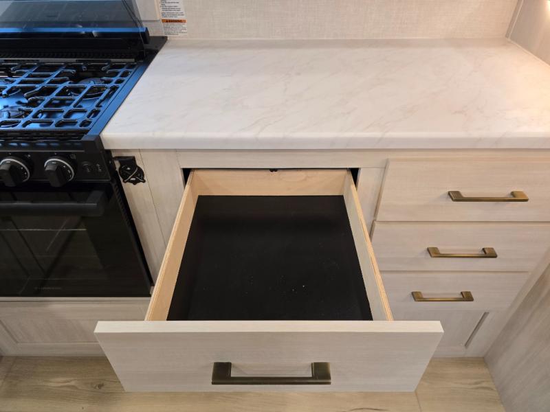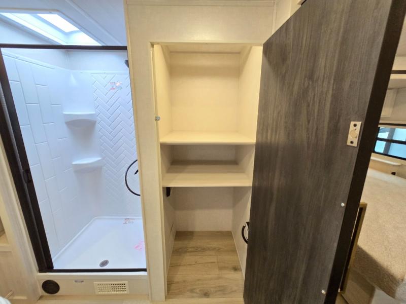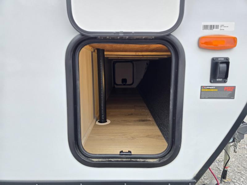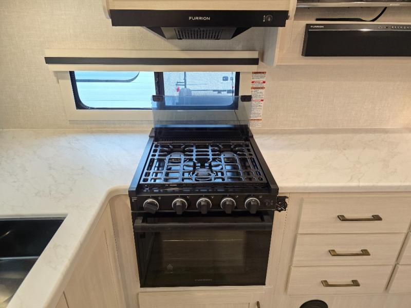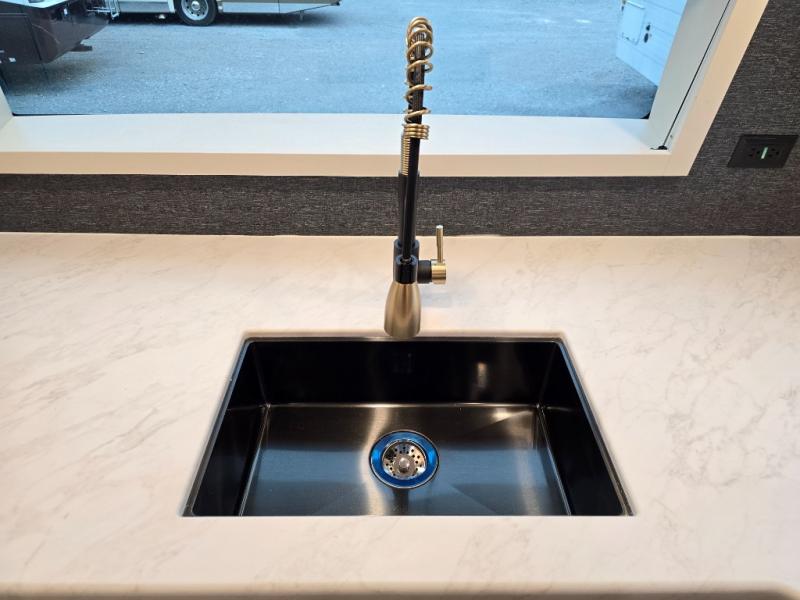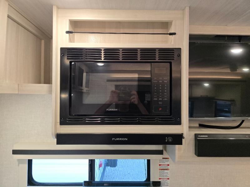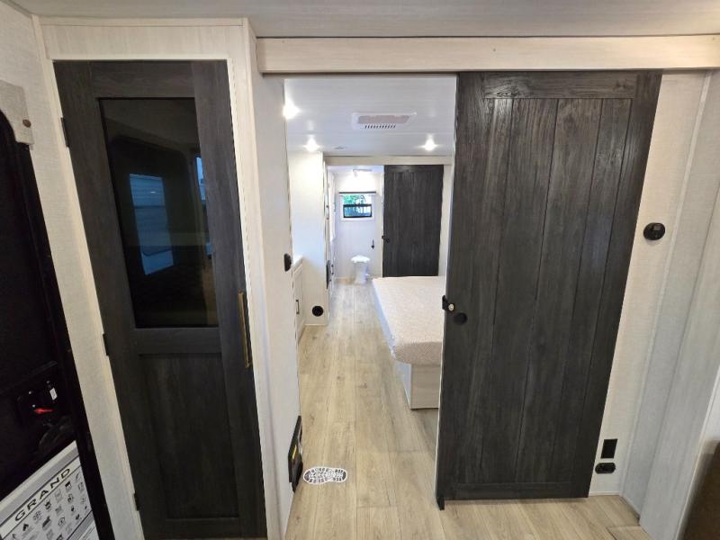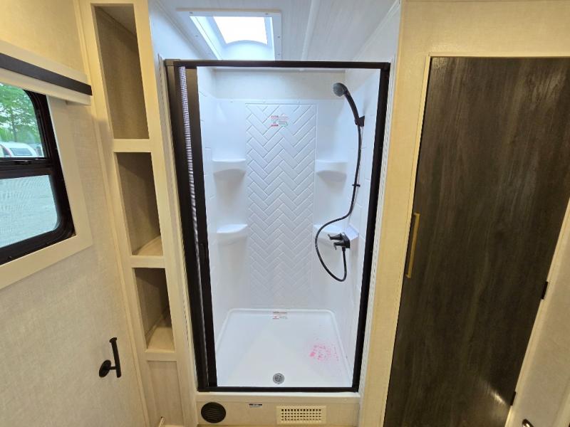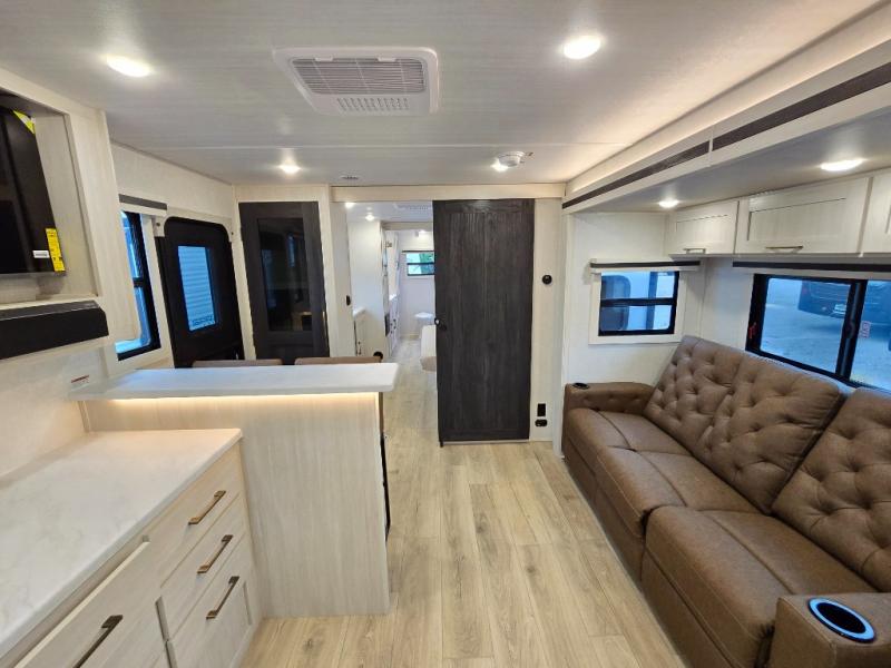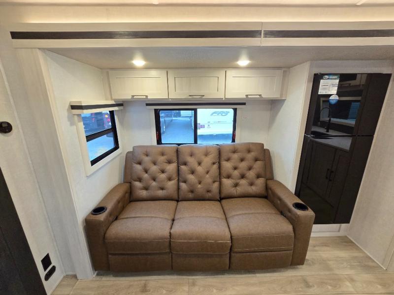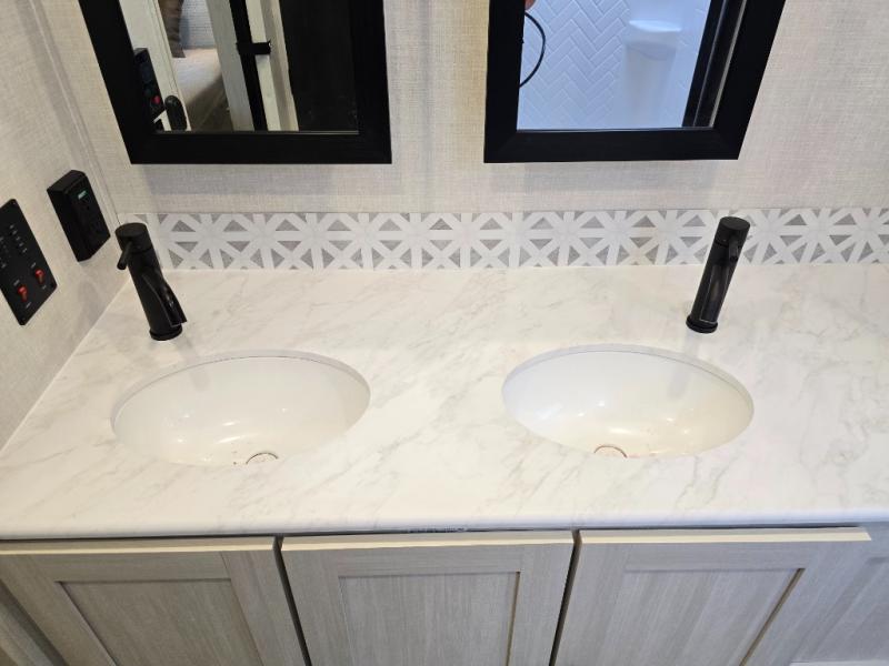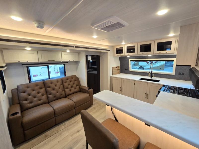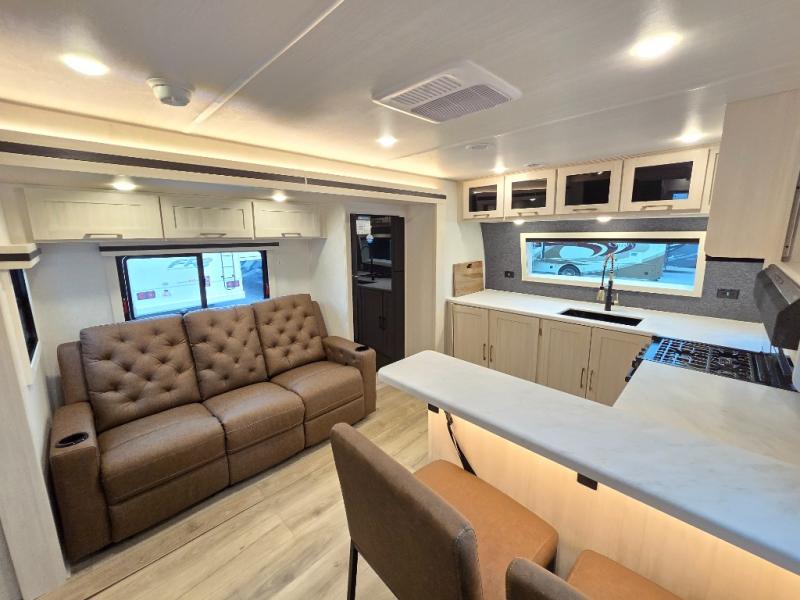This couple's trailer will be giving you all the glamping vibes! There is a front kitchen with ample counter space, along with a counter with two bar stools, a central vacuum to easily clean up, and a slide out for more space! The second slide out is found in the middle master bedroom where you'll also enjoy a custom king bed across from a bedroom fireplace, a wardrobe, and a dresser with TV prep. Head towards the back and you'll be wowed by the full bath with dual bath sinks, an upgraded slow-close shower door, and a closet with washer and dryer prep. The exterior is just as impressive as the interior with its outside kitchen, 20' power awning with LED lights, pass-through storage, TV coax, and so much more!